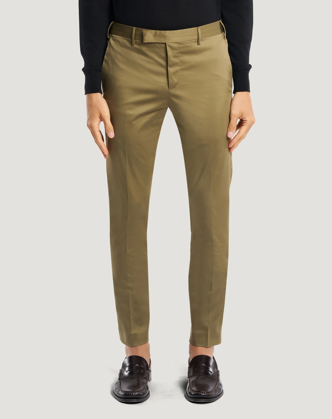 Hose aus Stretch-Satin, einem eleganten und bequemen Stoff in Haute Couture-Optik.Das Modell in super schmaler Passform ohne Bundfalten zeichnet sich durch sein schlichtes und elegantes Design aus und verleiht in der Variante Grün Ihren Looks Charakter.