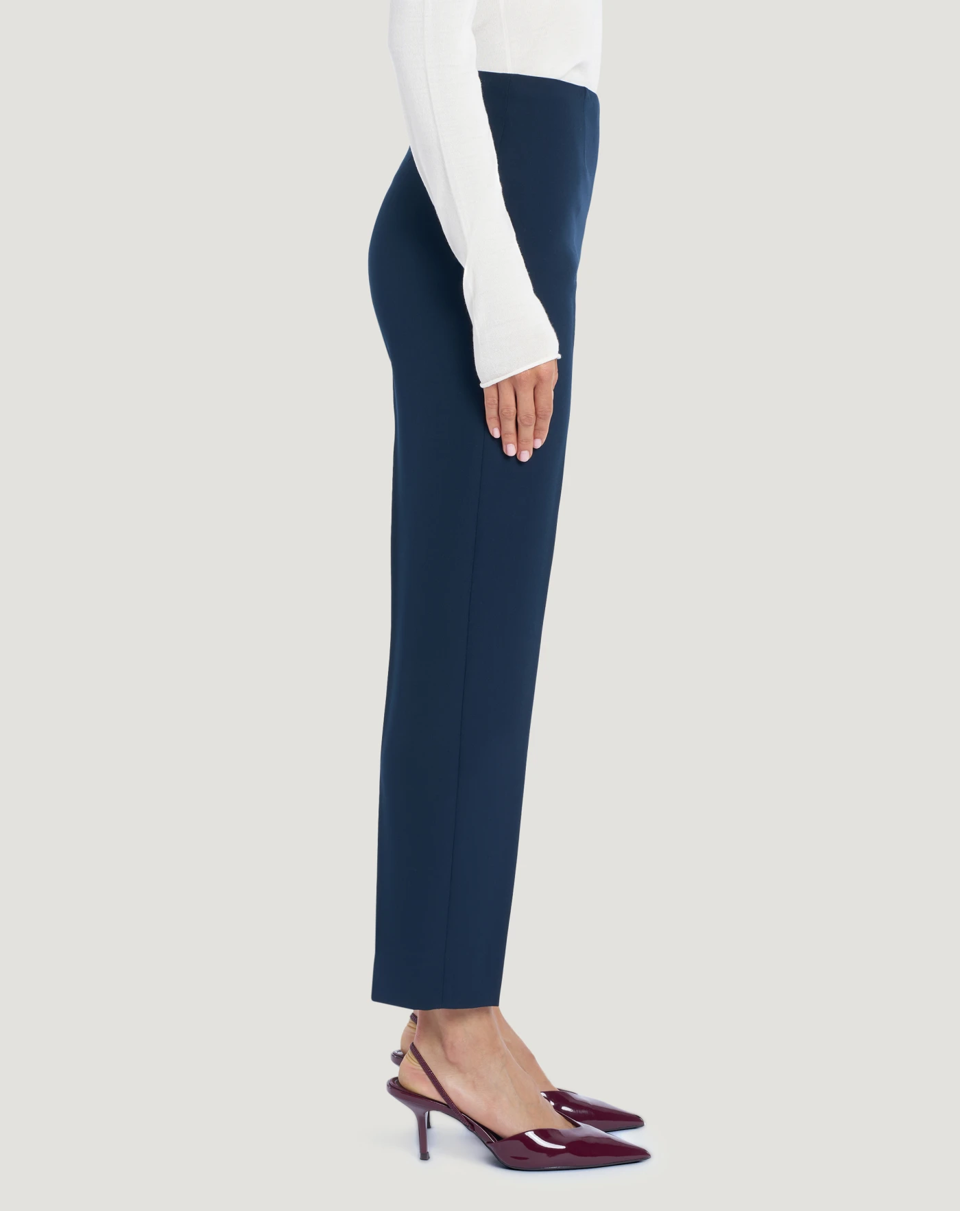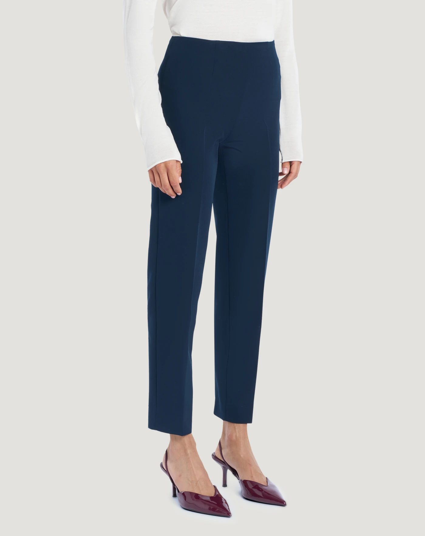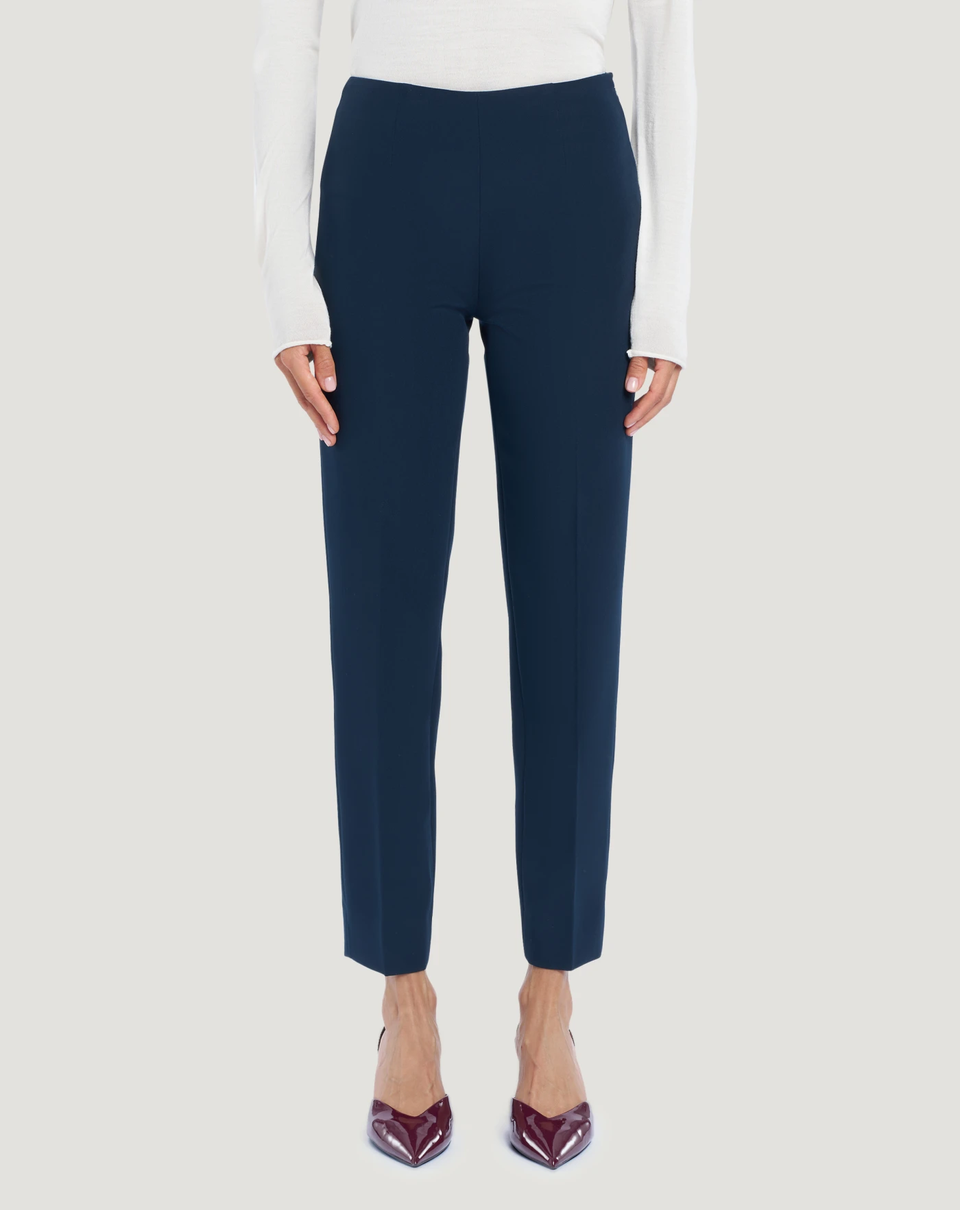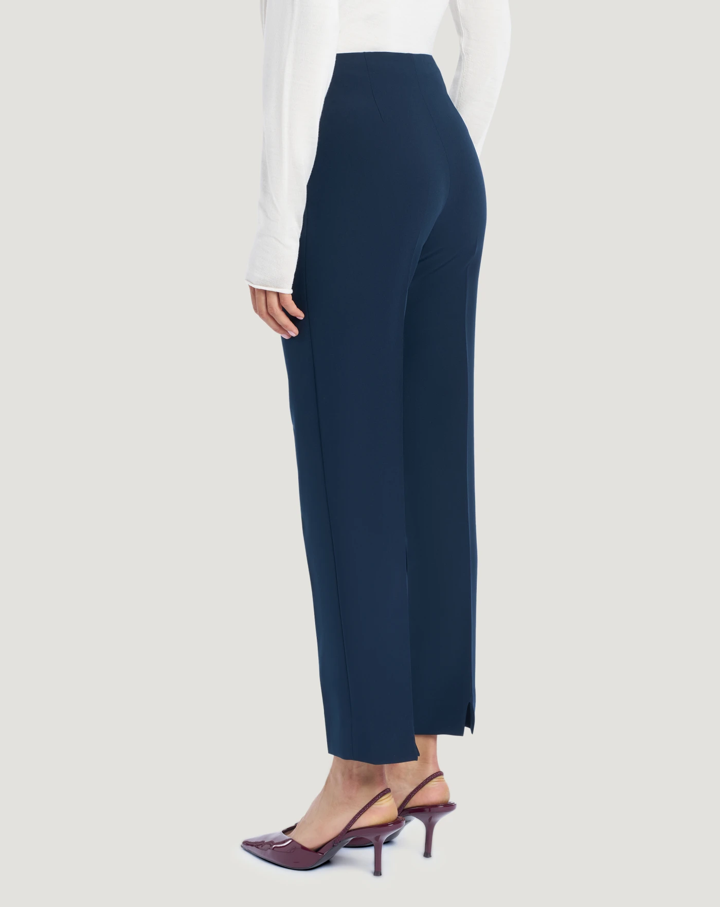 Hose aus fließendem Stretch-Trikotine, einem sehr weichen Stoff mit angenehmer Haptik, der Festigkeit und Elastizität vereint.Sie verfügt über einen hohen Bund, eine schmale Passform und einen Schlitz hinten am Saum – ein modernes und elegantes Detail. In der Variante Dunkelblau eignet sich das Modell für elegante Looks im Alltag oder im Büro.