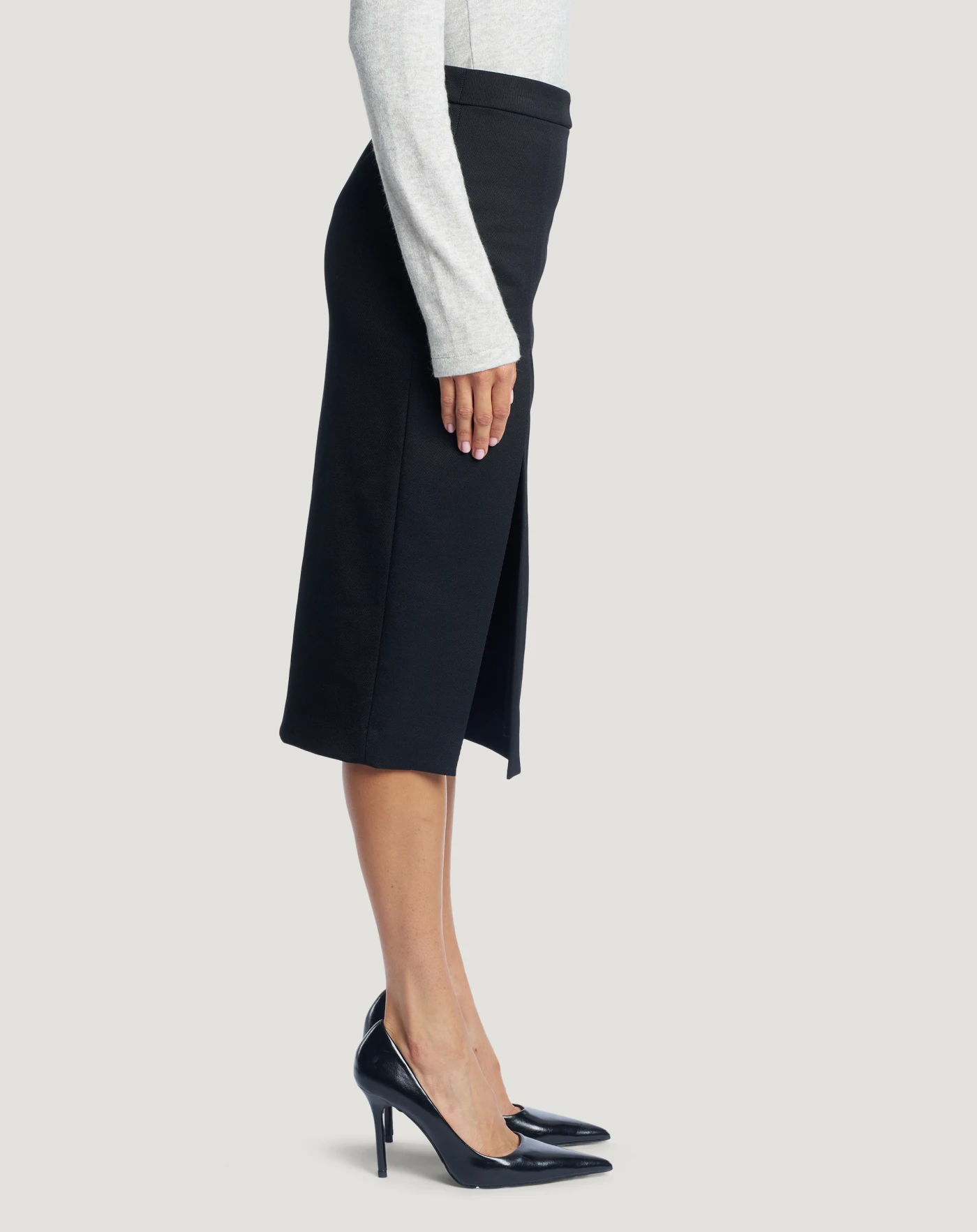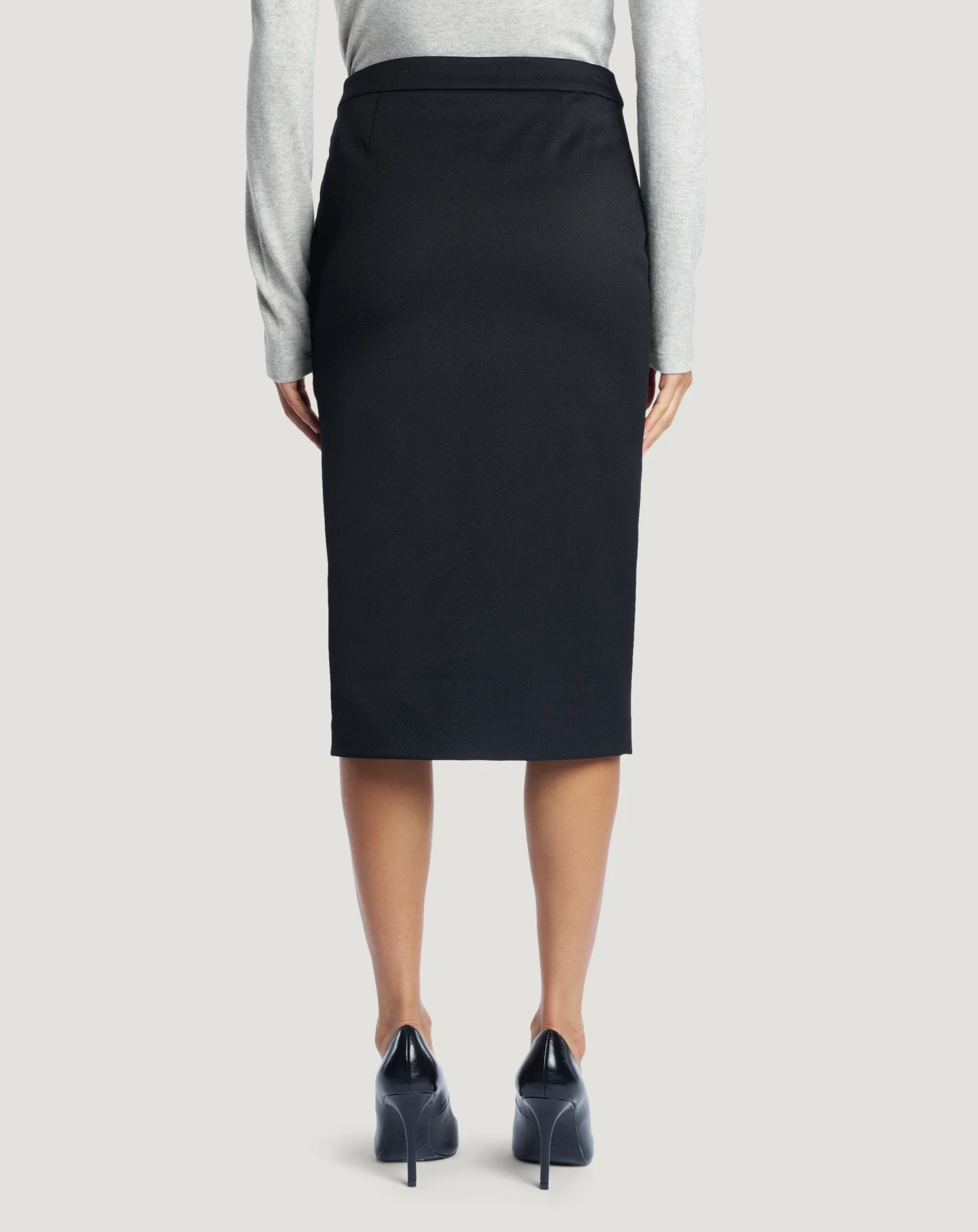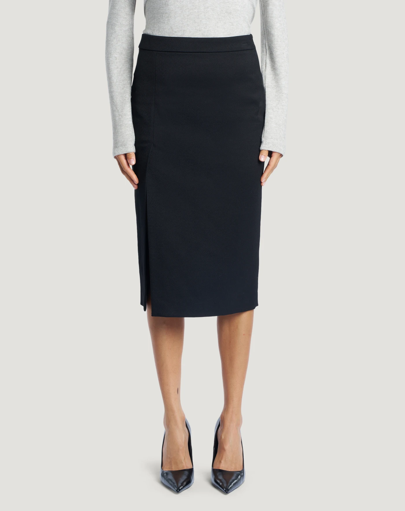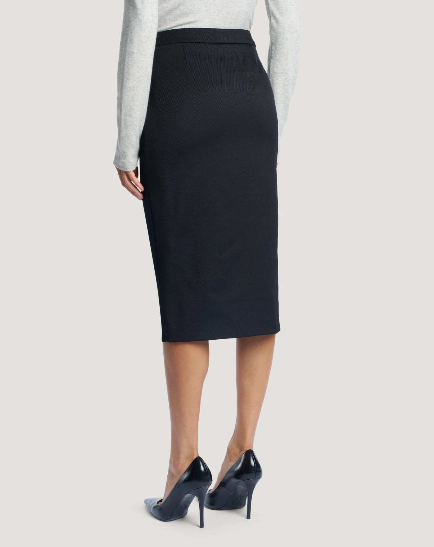 Rock aus Techno-Wollstretch, einem blickdichten, sehr elastischen und bequemen Stoff.Das Modell mit hohem Bund und seitlichem Schlitz verfügt über ein vielseitiges und schlichtes Design, das die Figur vorteilhaft betont.