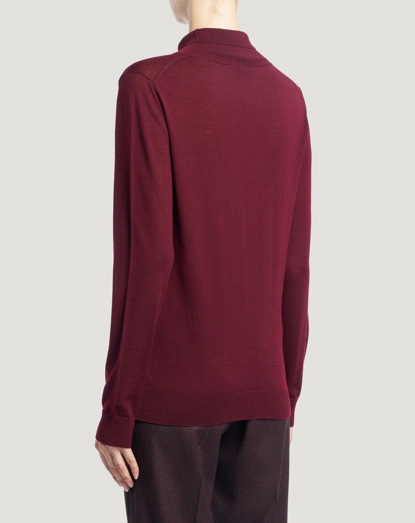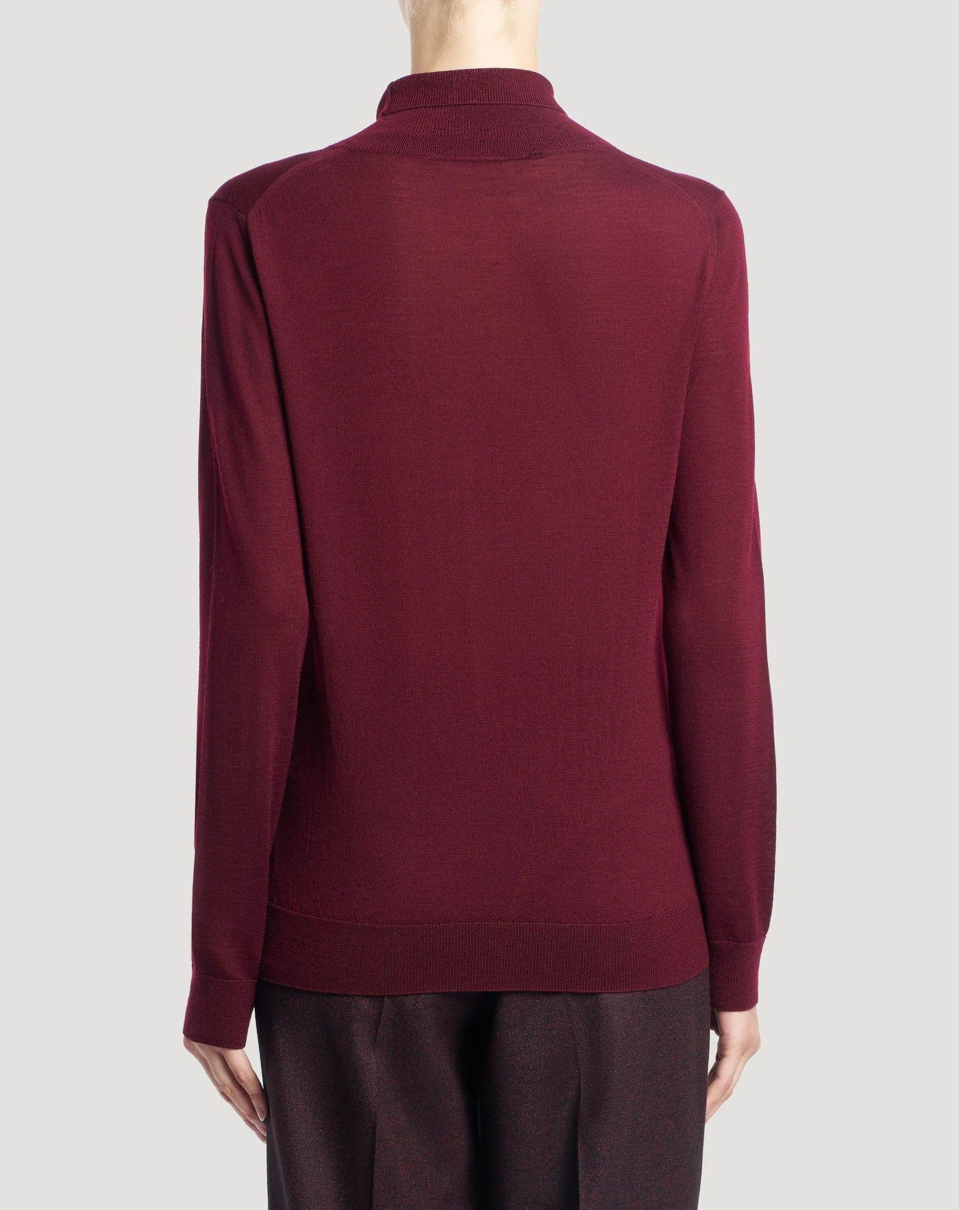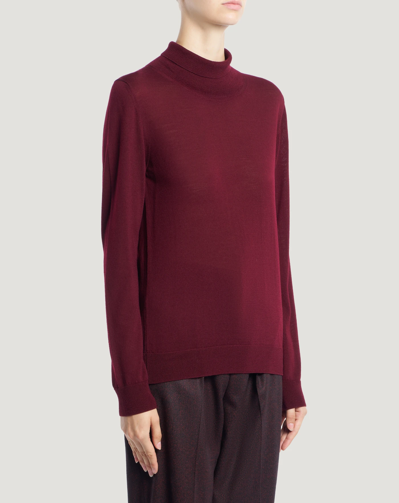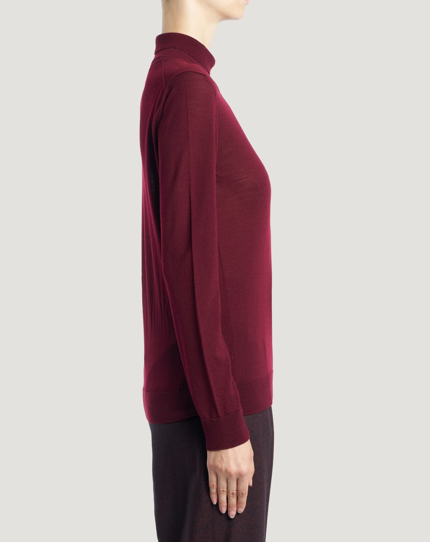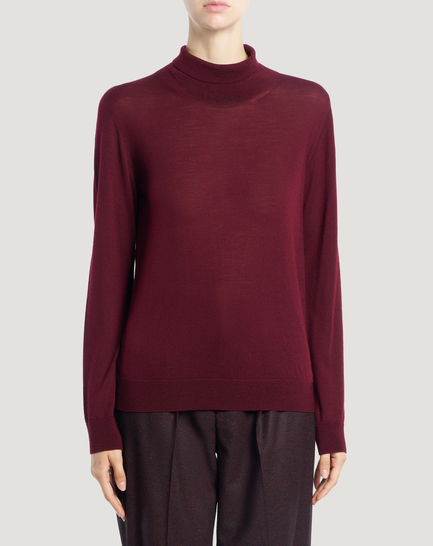 Pullover aus extrafeiner Wolle in Glattstrick mit Fadenfeinheit 18, die das Kleidungsstück leicht und sehr angenehm macht.Das Modell in normaler Passform mit hohem Kragen hat ein schlichtes und vielseitiges Design, das sowohl formelle als auch legere Looks abrundet und perfekt unter dem Blazer getragen werden kann. Die Variante in Bordeauxrot verleiht Ihrem Look mehr Intensität.