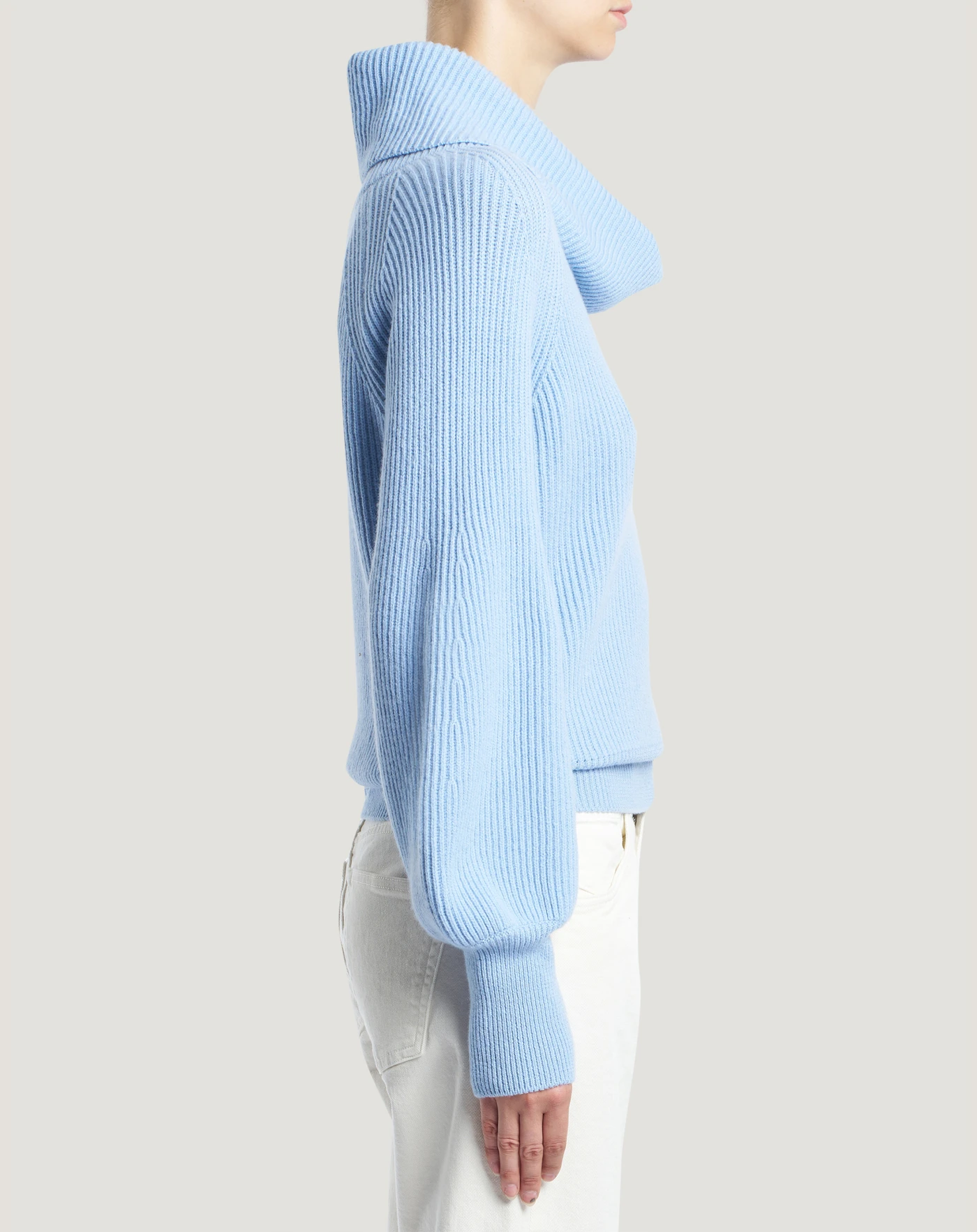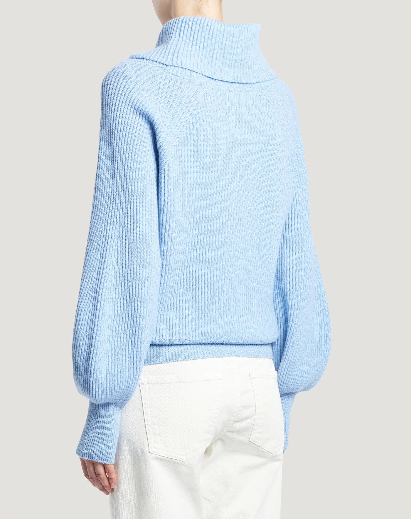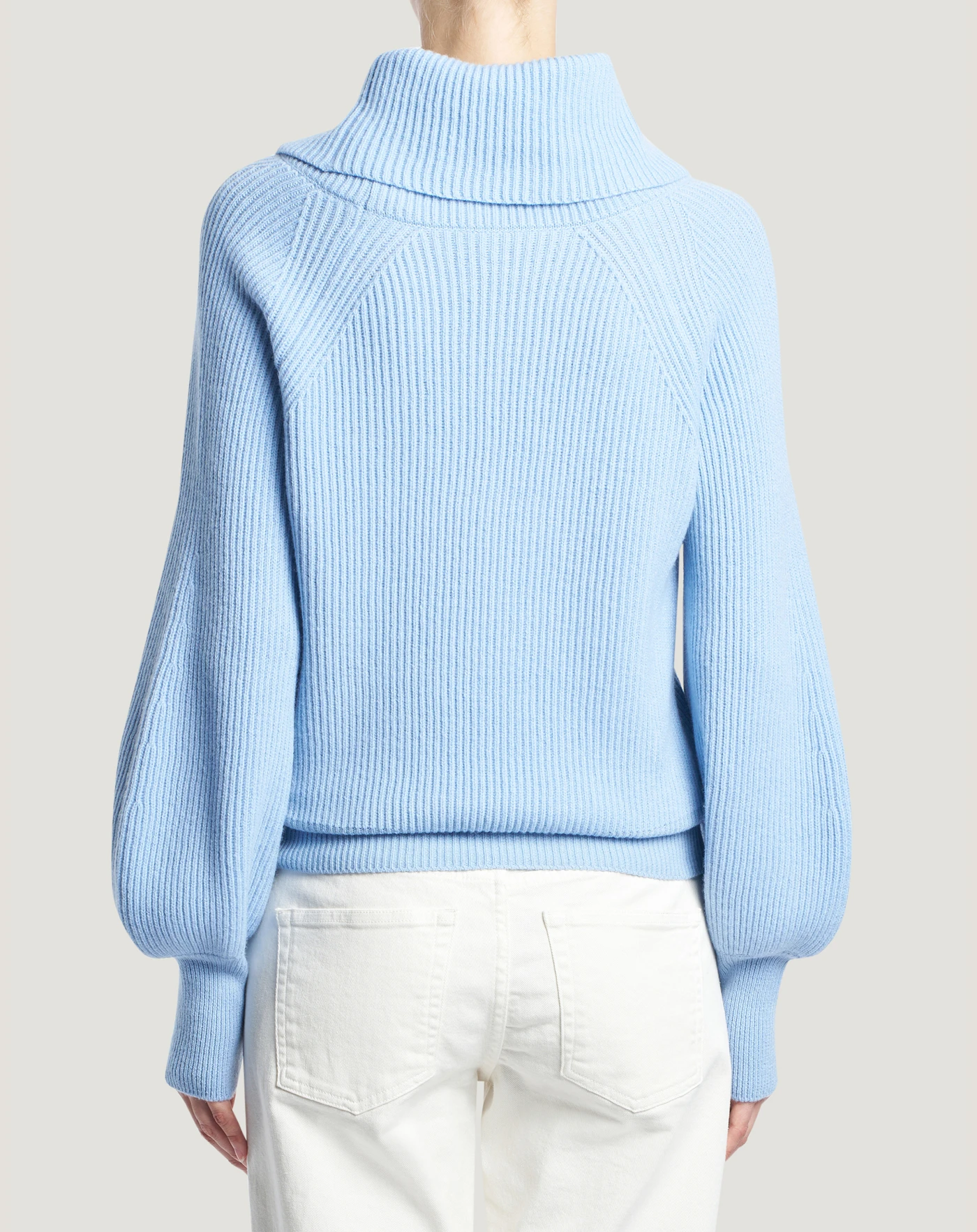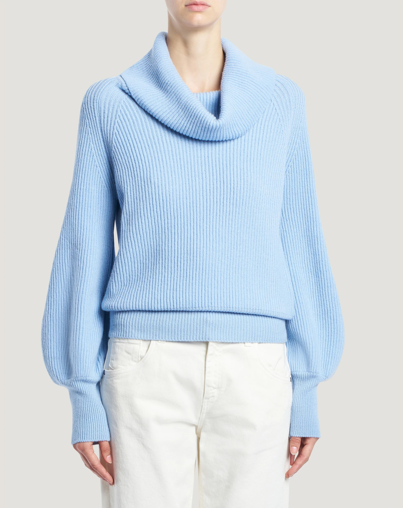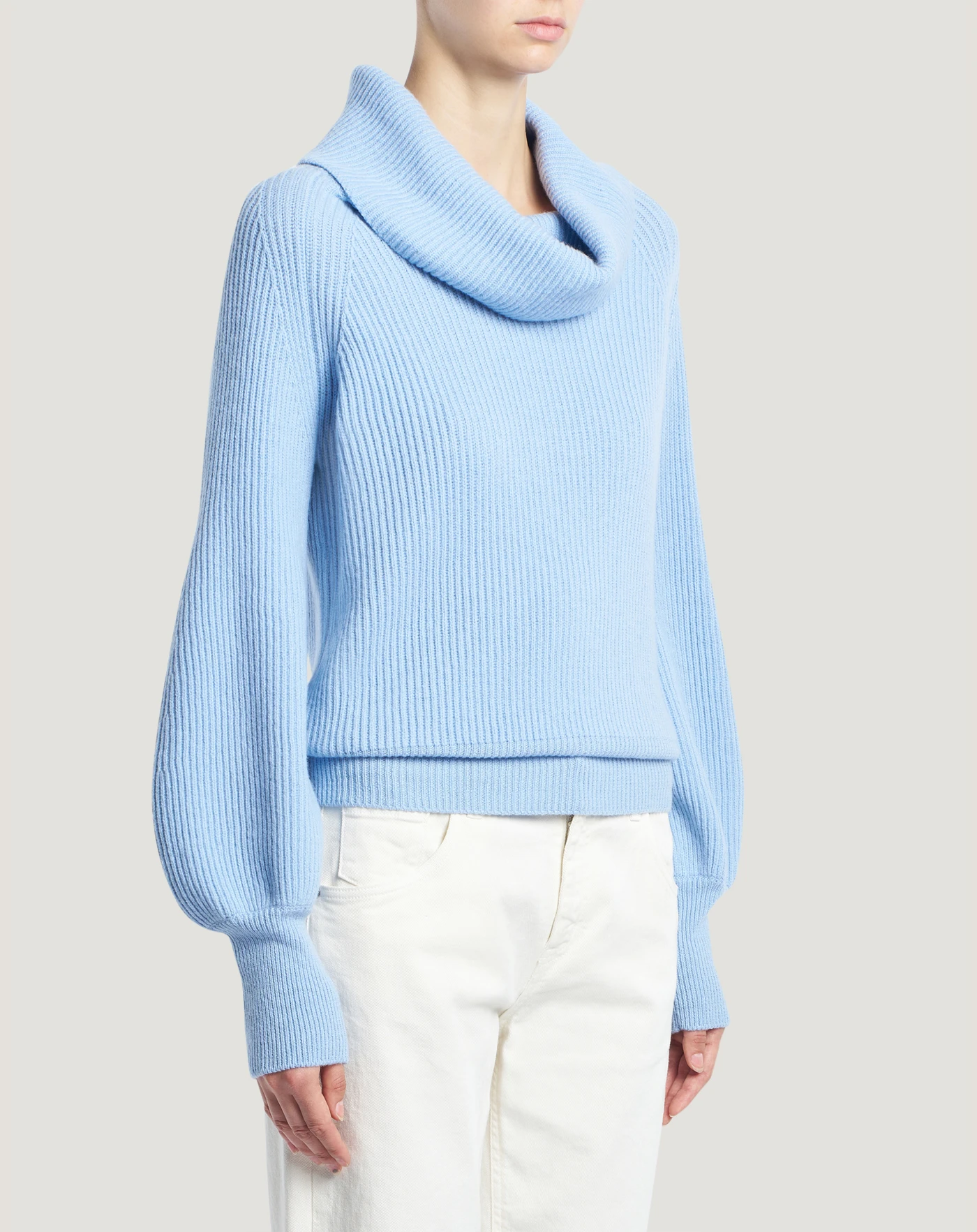 Fisherman’s rib jumper in wool and cashmere tricot, a soft and refined yarn.With a cowl neck and balloon sleeves that make it both cosy and chic. Pair it with the Diana trousers for a high-impact look.