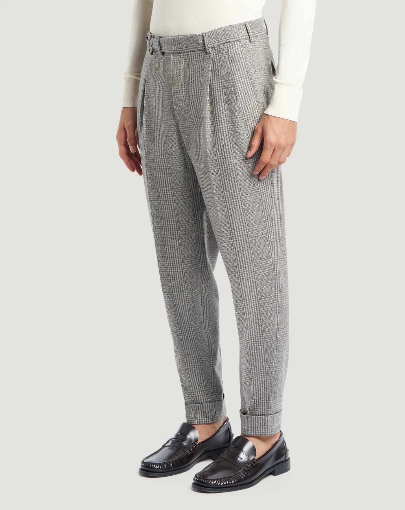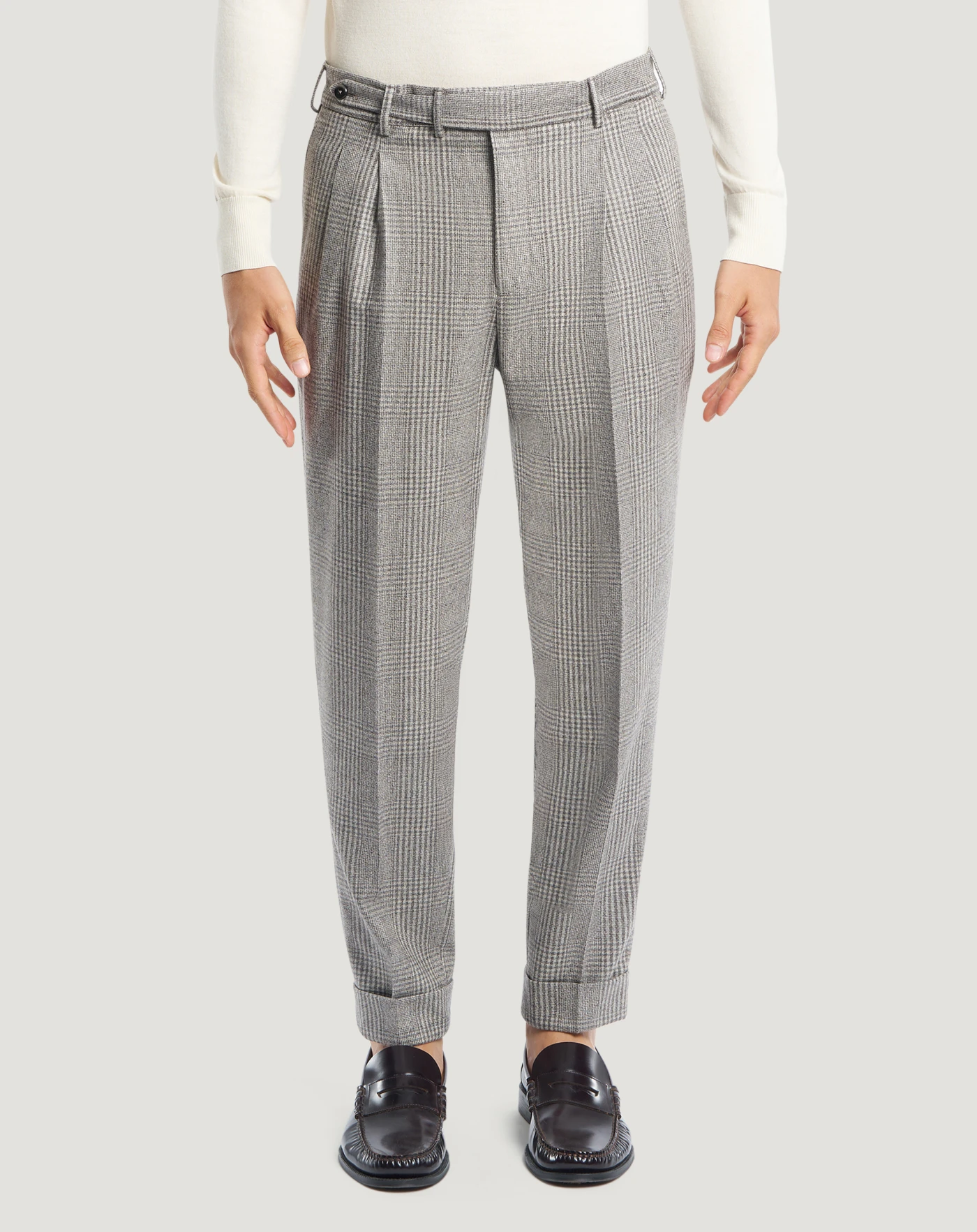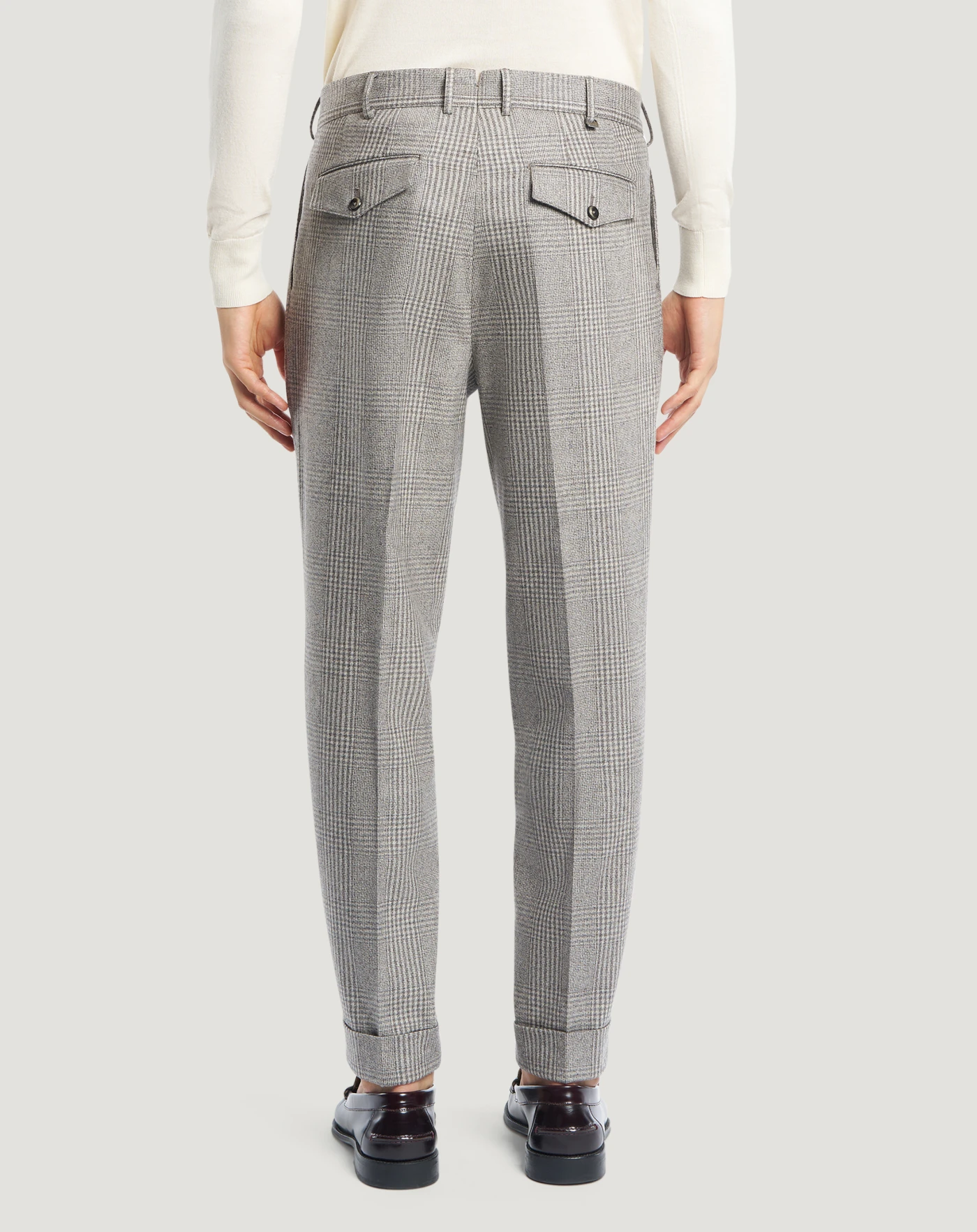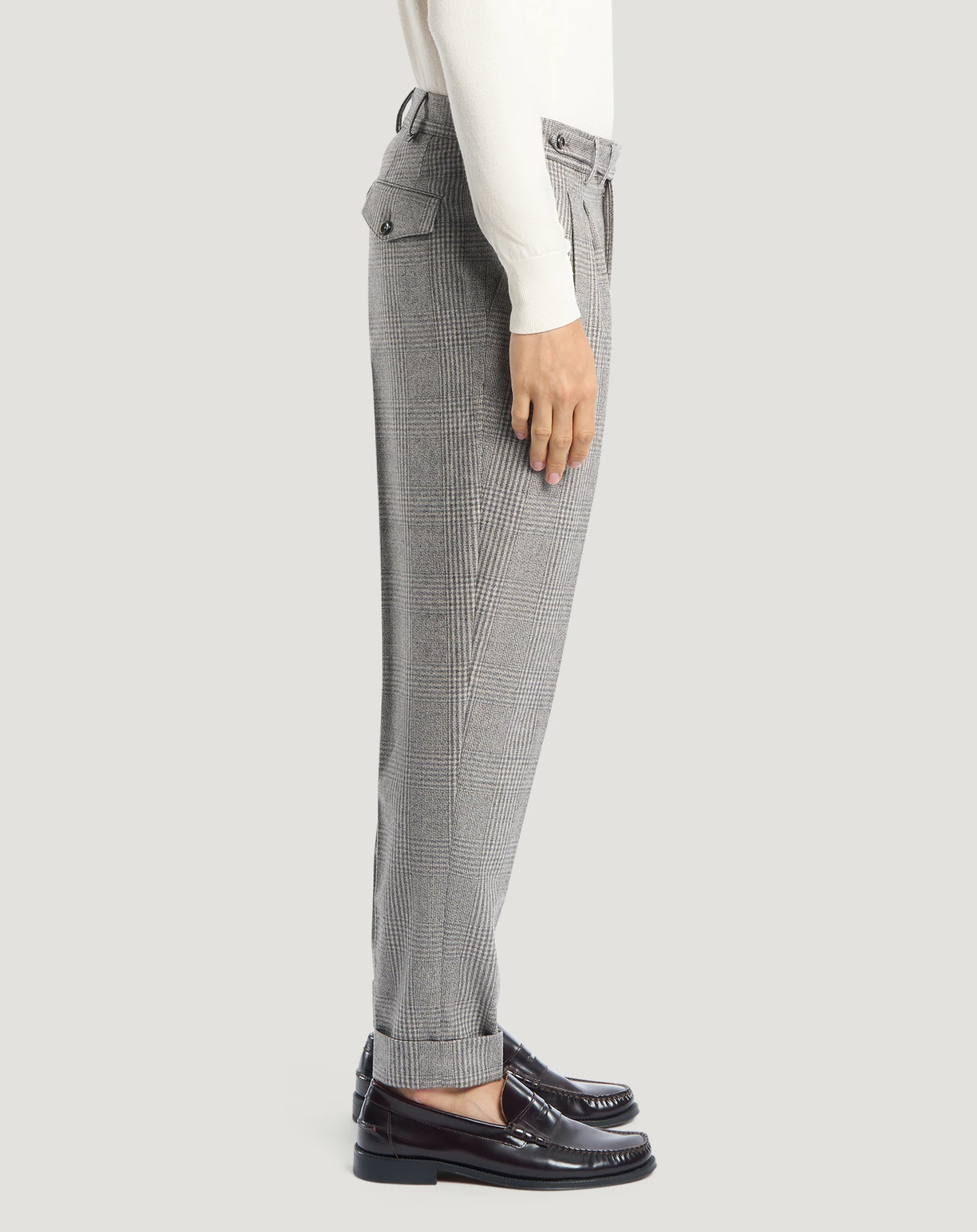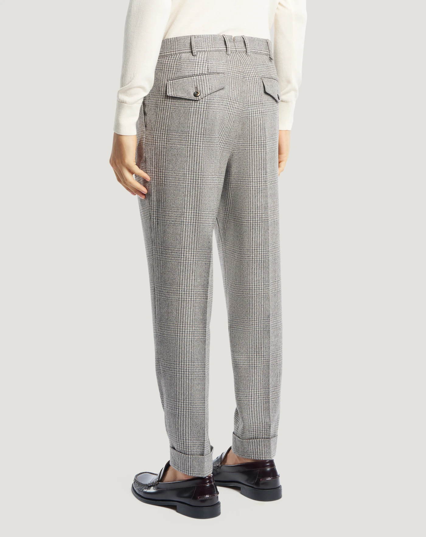 Trousers in wool and cashmere flannel, a soft and refined fabric with a micro chevron pattern.Their relaxed, tailored design with pleats at the front and flap pockets at the back gives your on- and off-duty looks a refined touch.