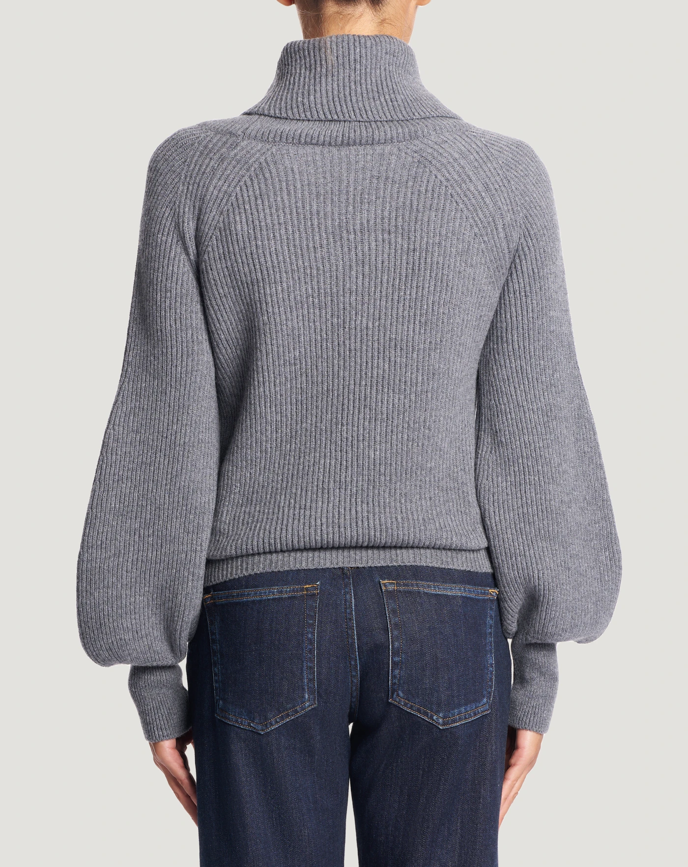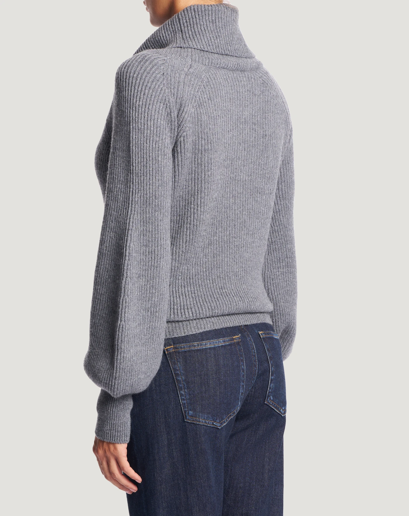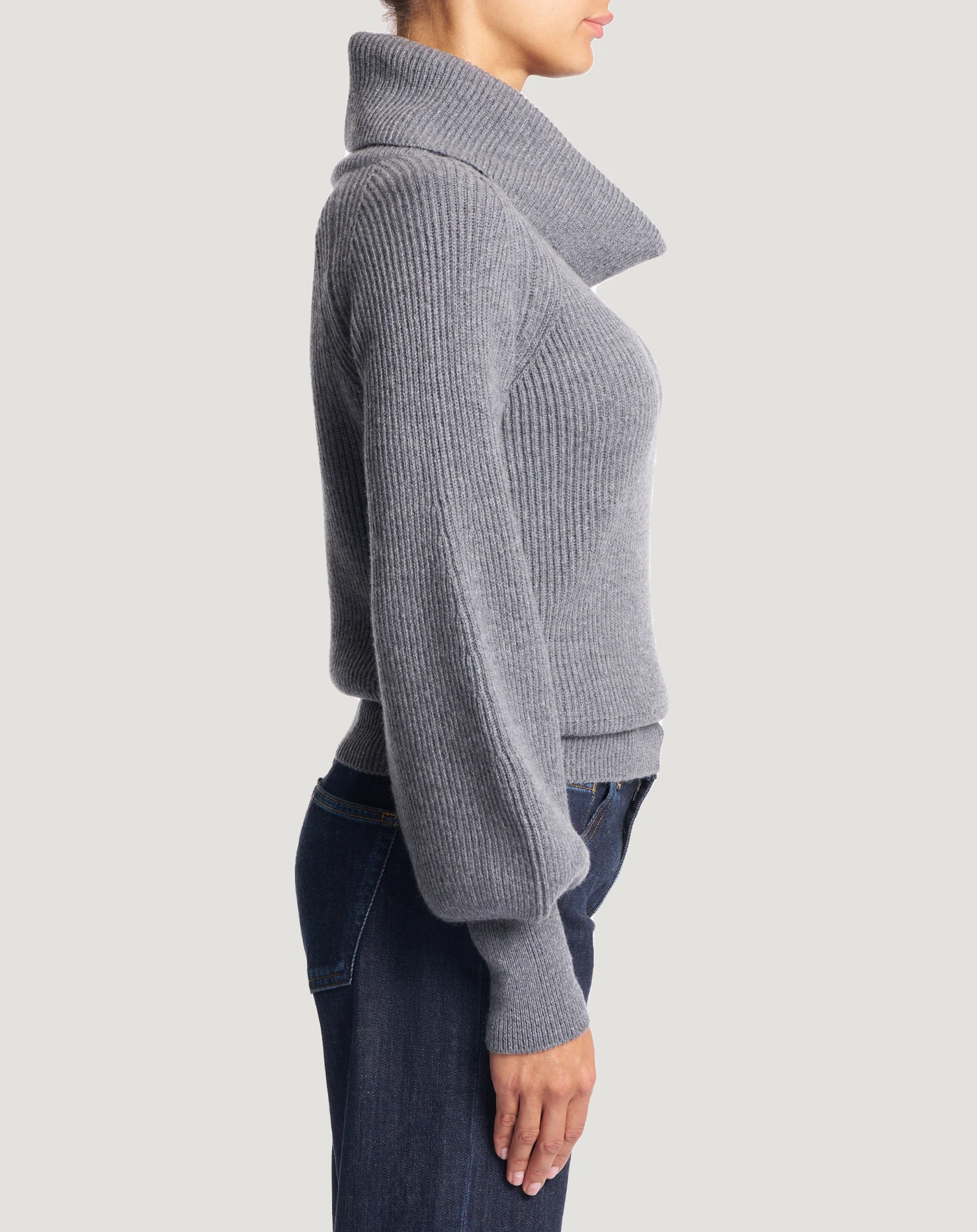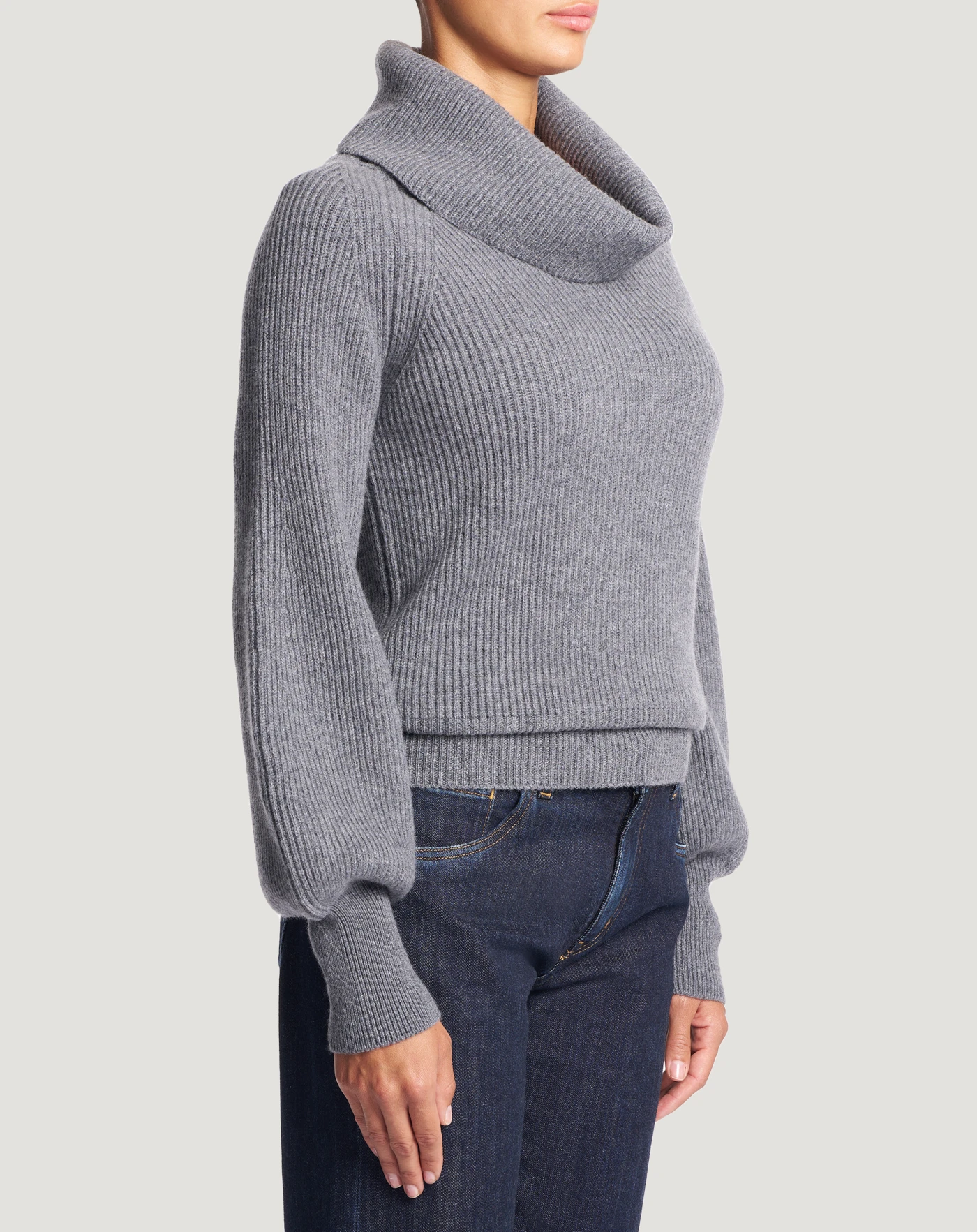 Fisherman’s rib jumper in wool and cashmere tricot, a soft and refined yarn.With a cowl neck and balloon sleeves that make it both cosy and chic.