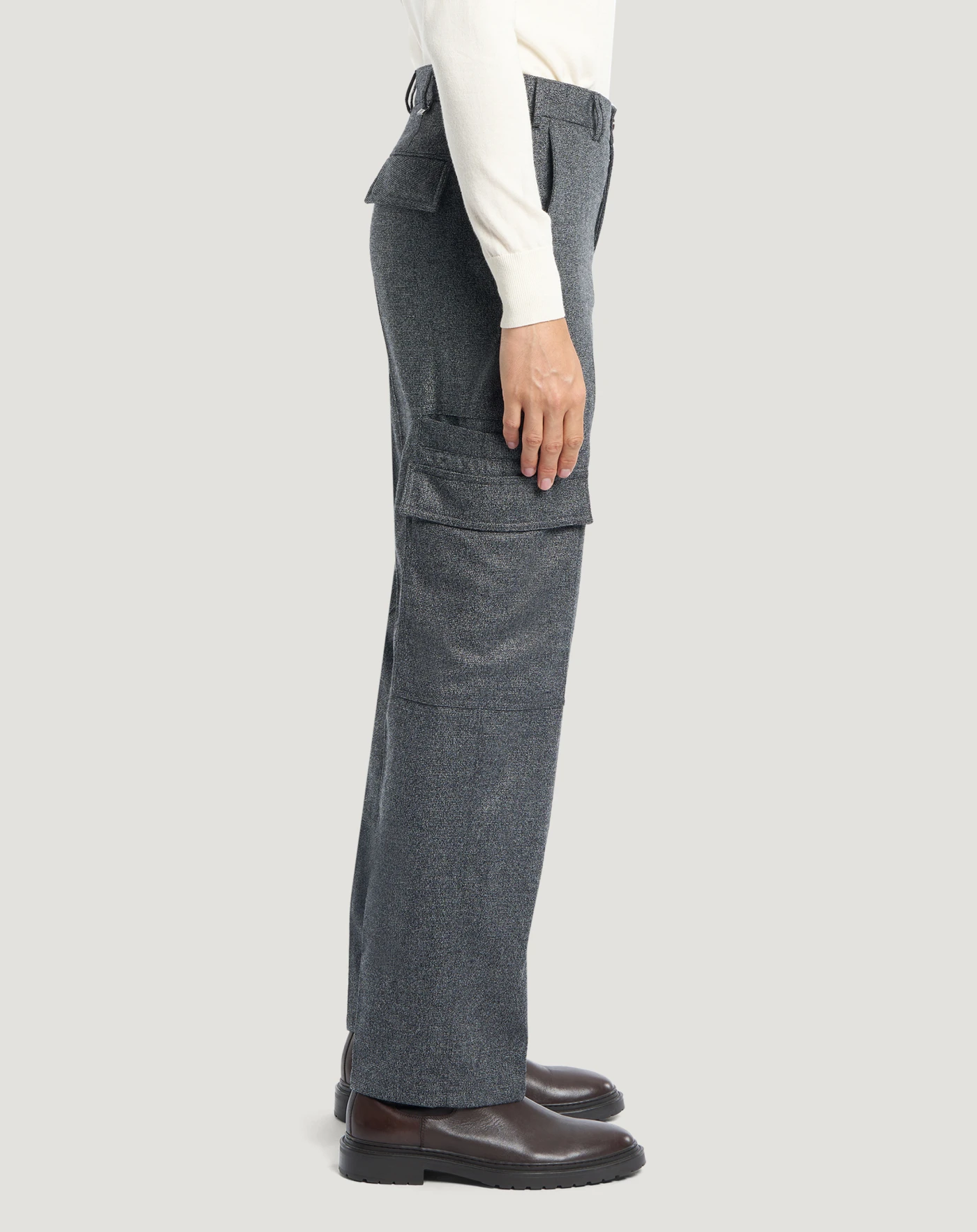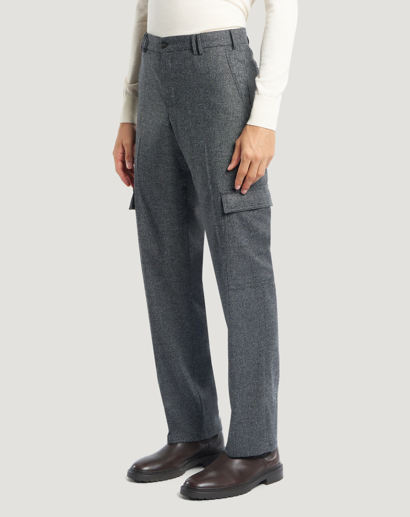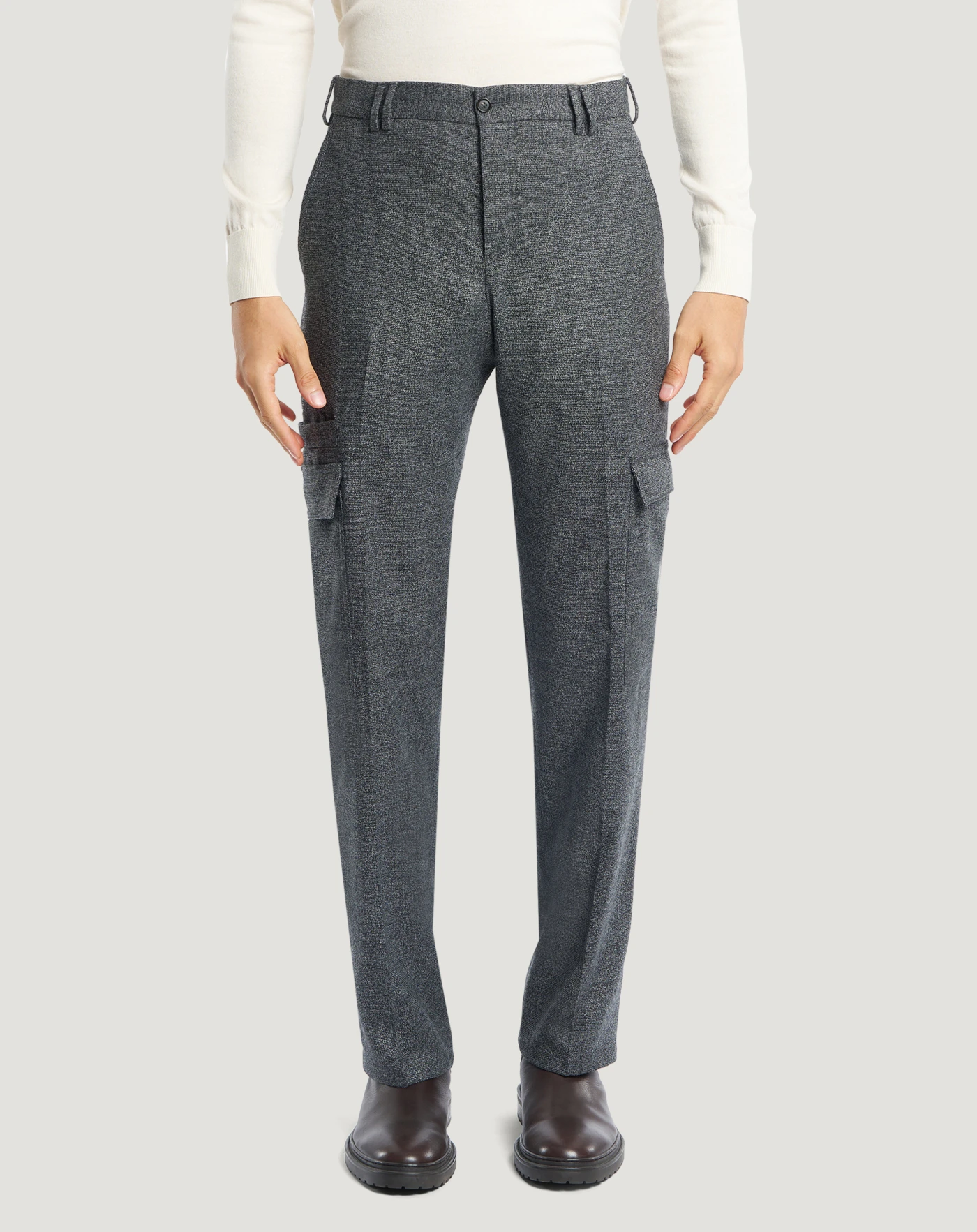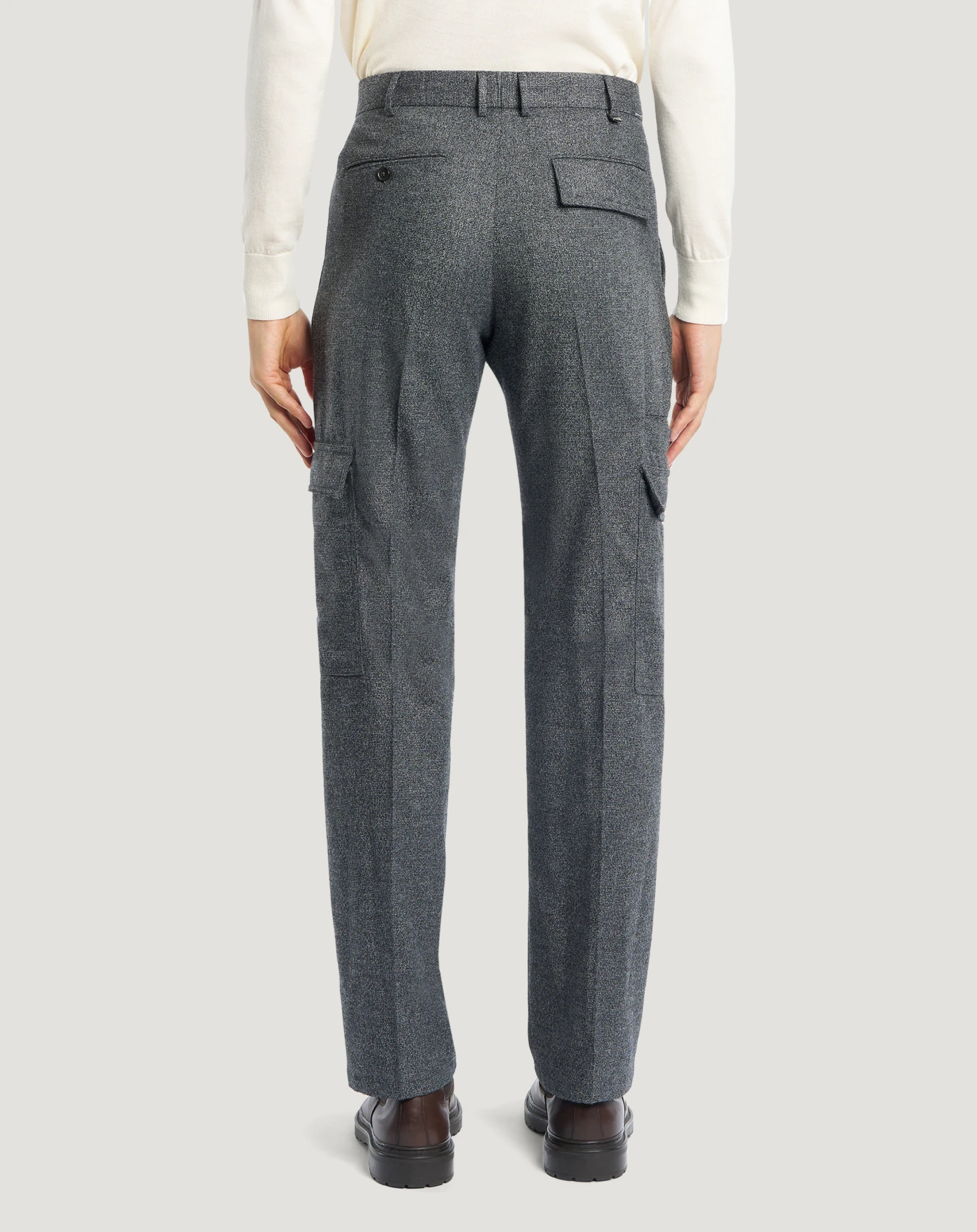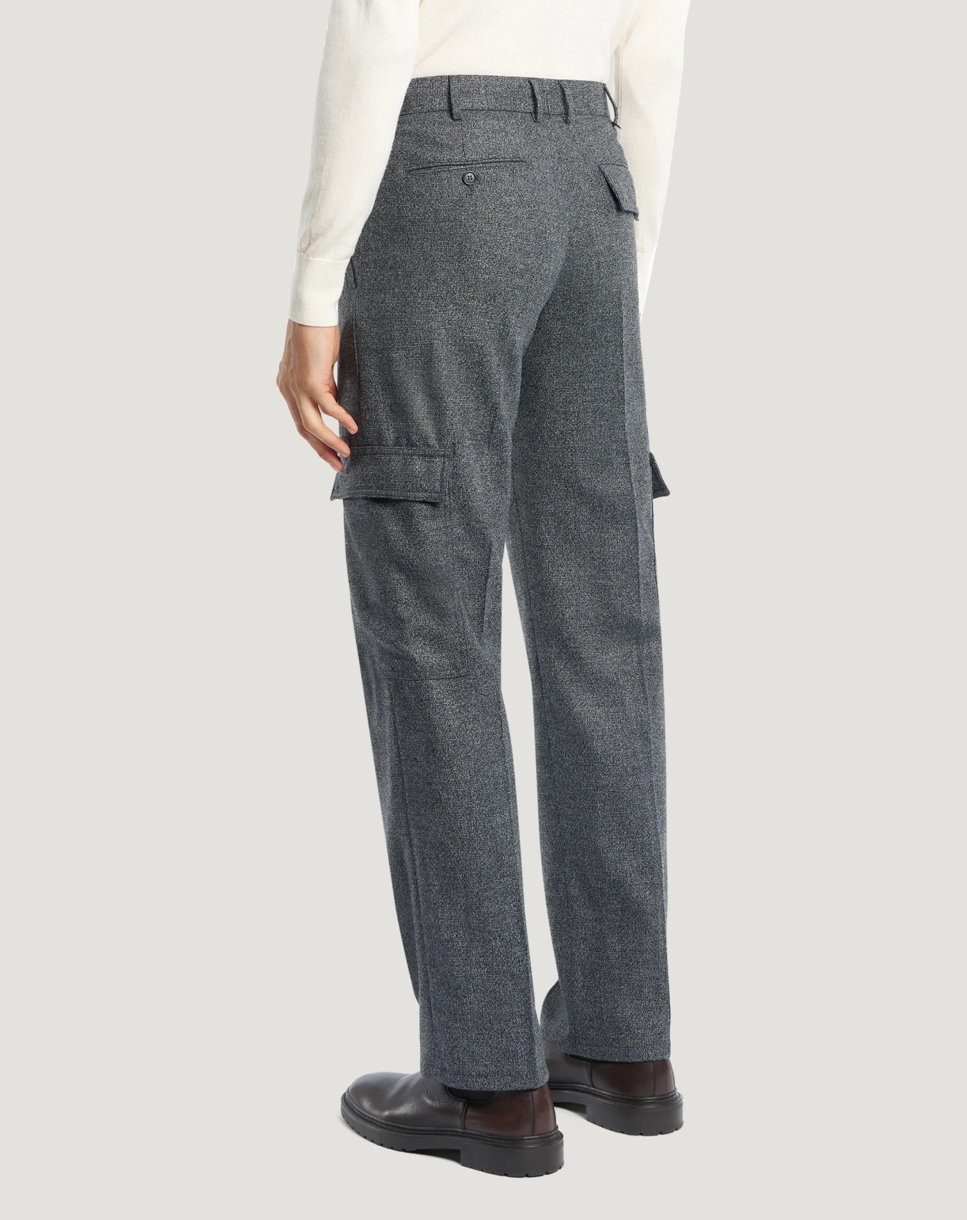 Trousers in stretch, soft winter wool with a pattern that adds a touch of personality to your look. The tailored version of the classic cargo trousers, with side pockets and pressed crease, combines comfort and style in a versatile and sophisticated garment.