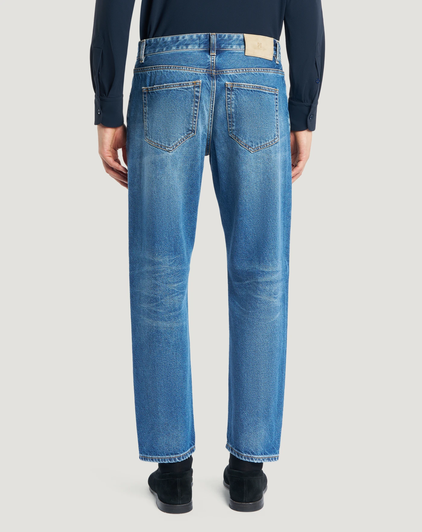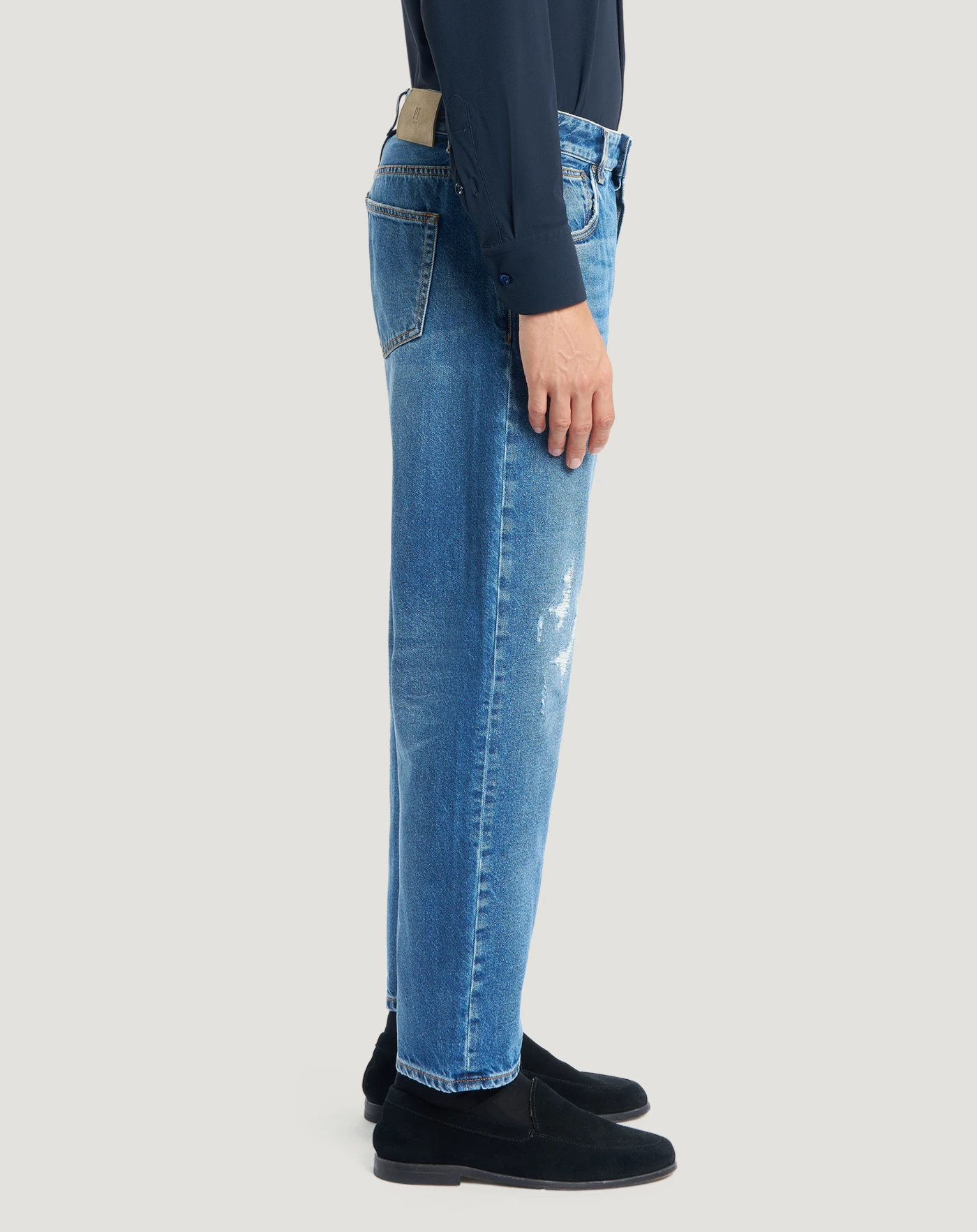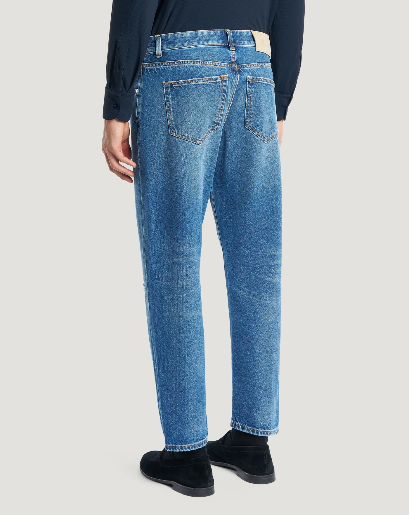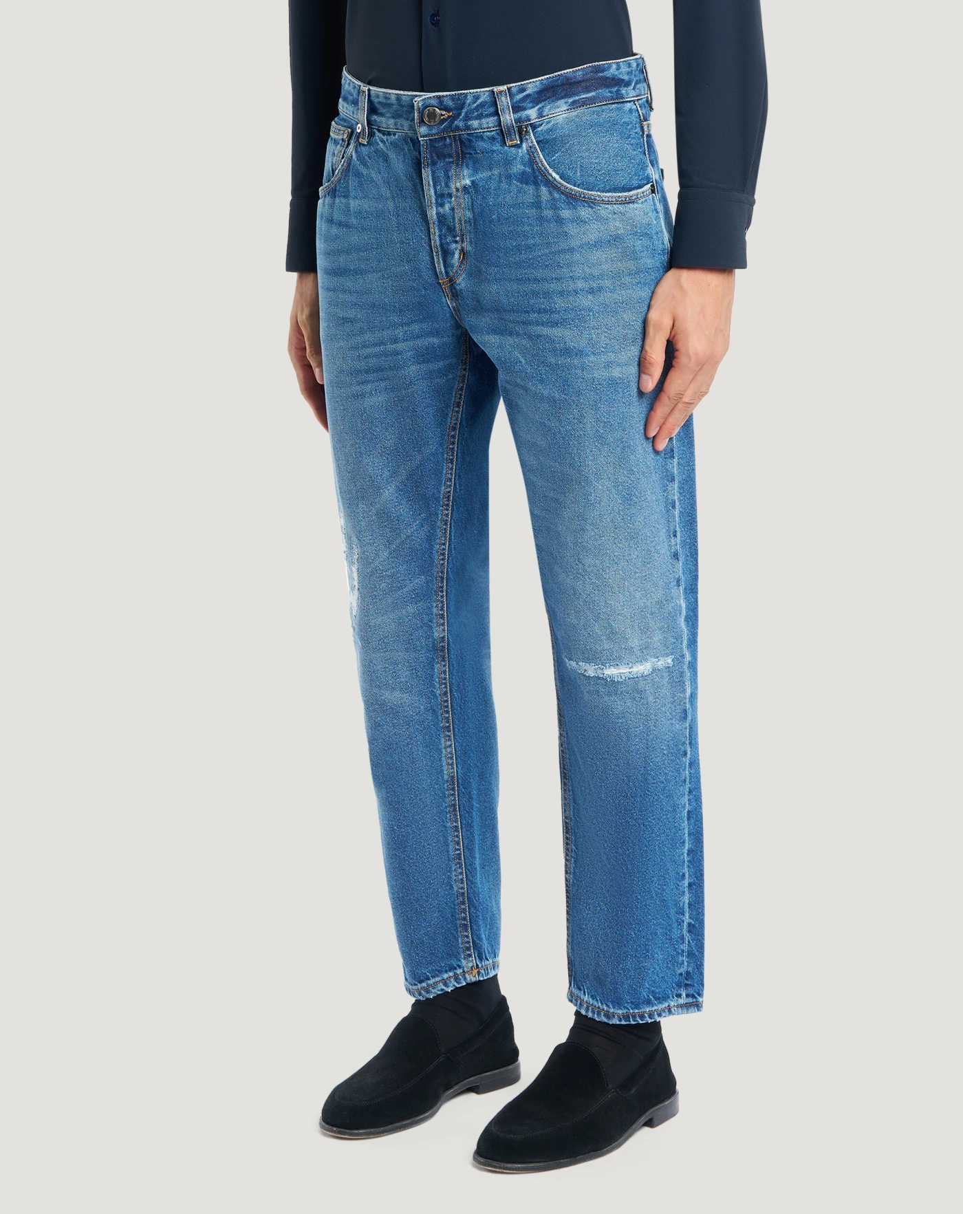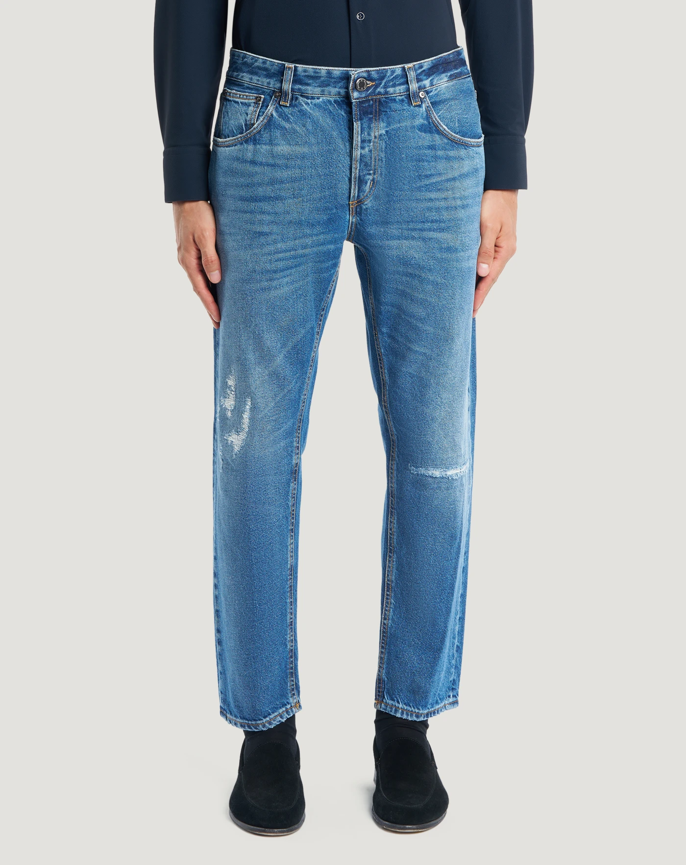 Jeans in pure cotton denim, a firm, comfortable and durable fabric (11.5 oz) with a wash featuring fading and rips.With a tapered fit and regular waist, they have an urban look that is full of character and perfect for casual and leisurewear.