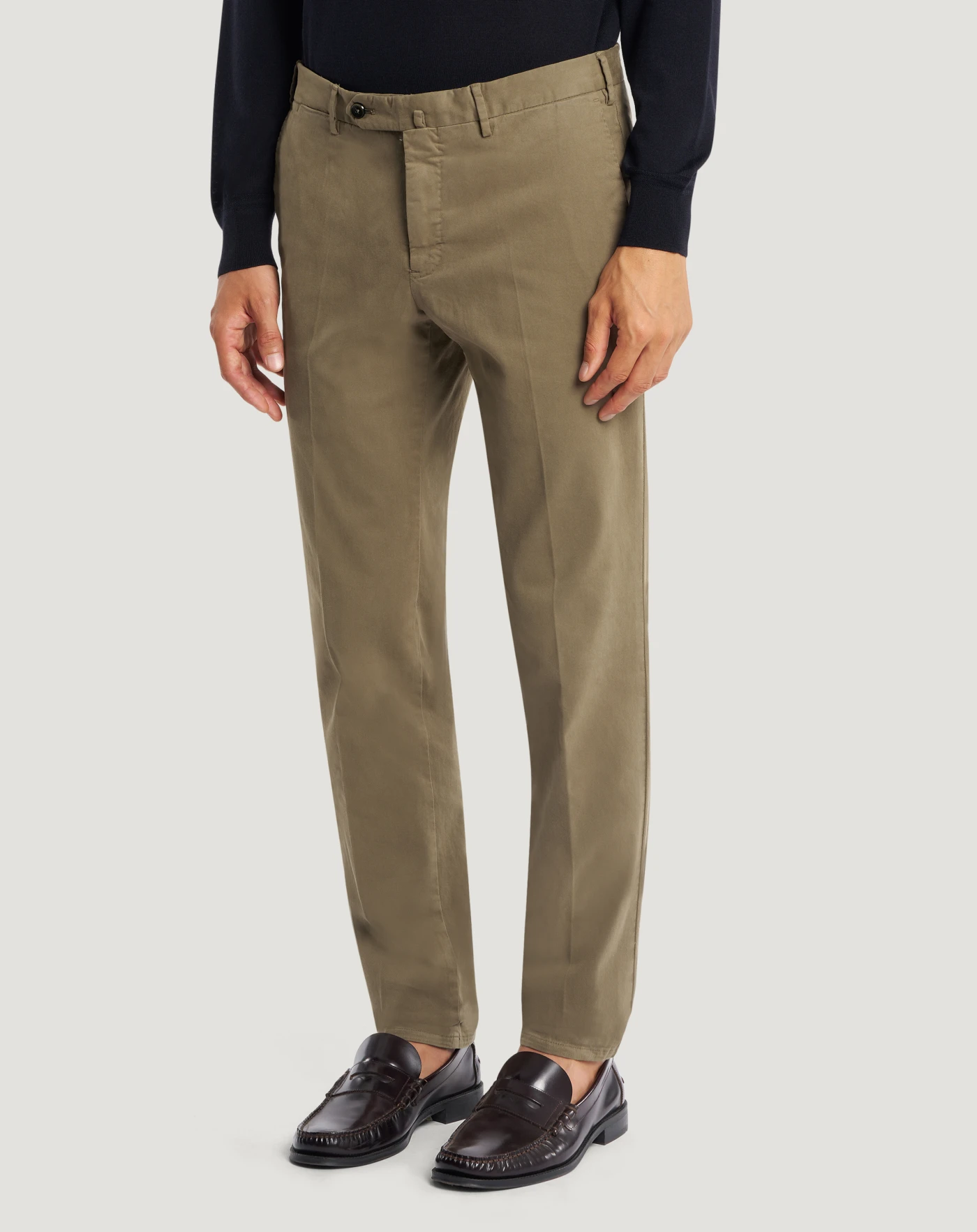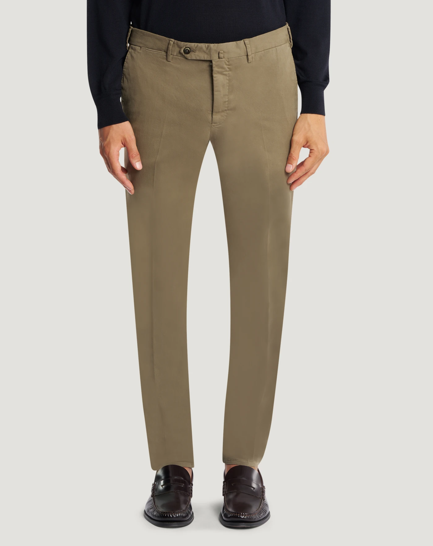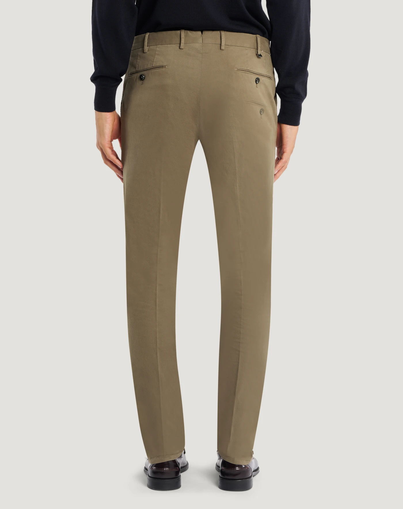 Trousers in stretch cotton winter gabardine with a compact and warm structure. Designed for the cold season, it combines comfort and durability with a soft, enveloping feel.The garment is delivered unstitched, so that it can be finished to suit your length and style through simple tailoring.In beige, for unique elegance.