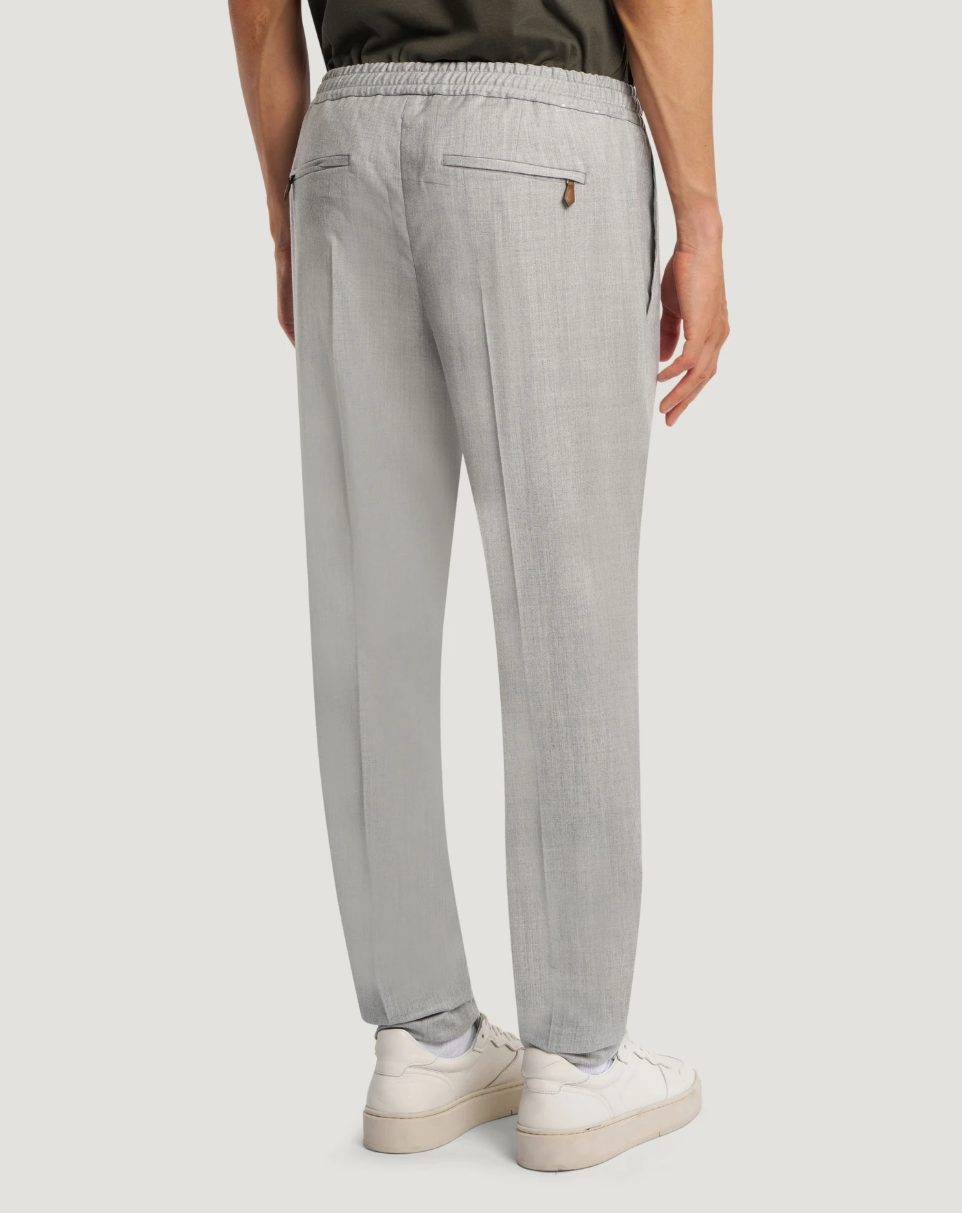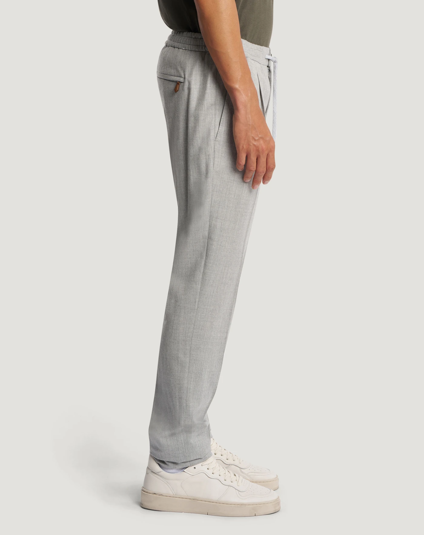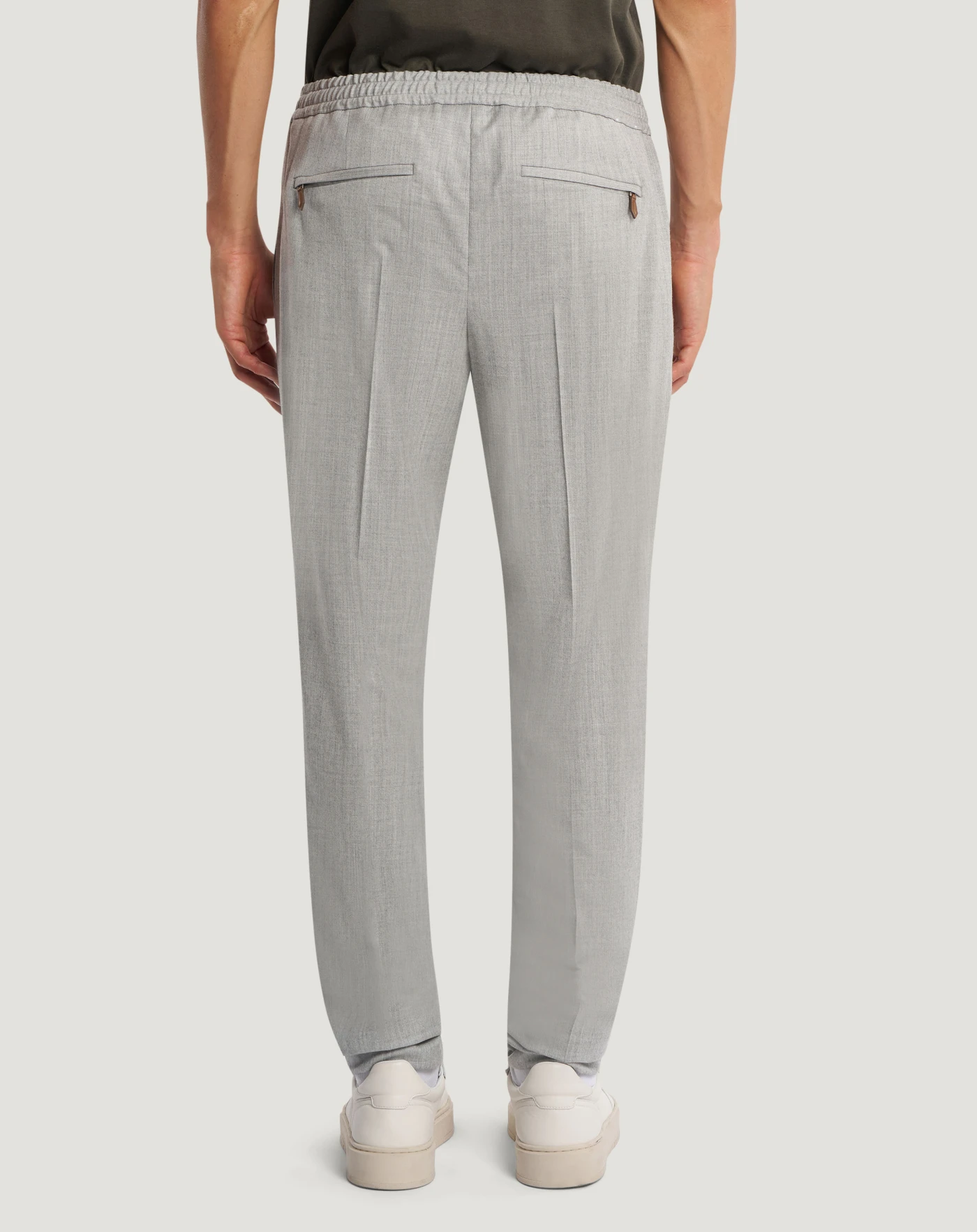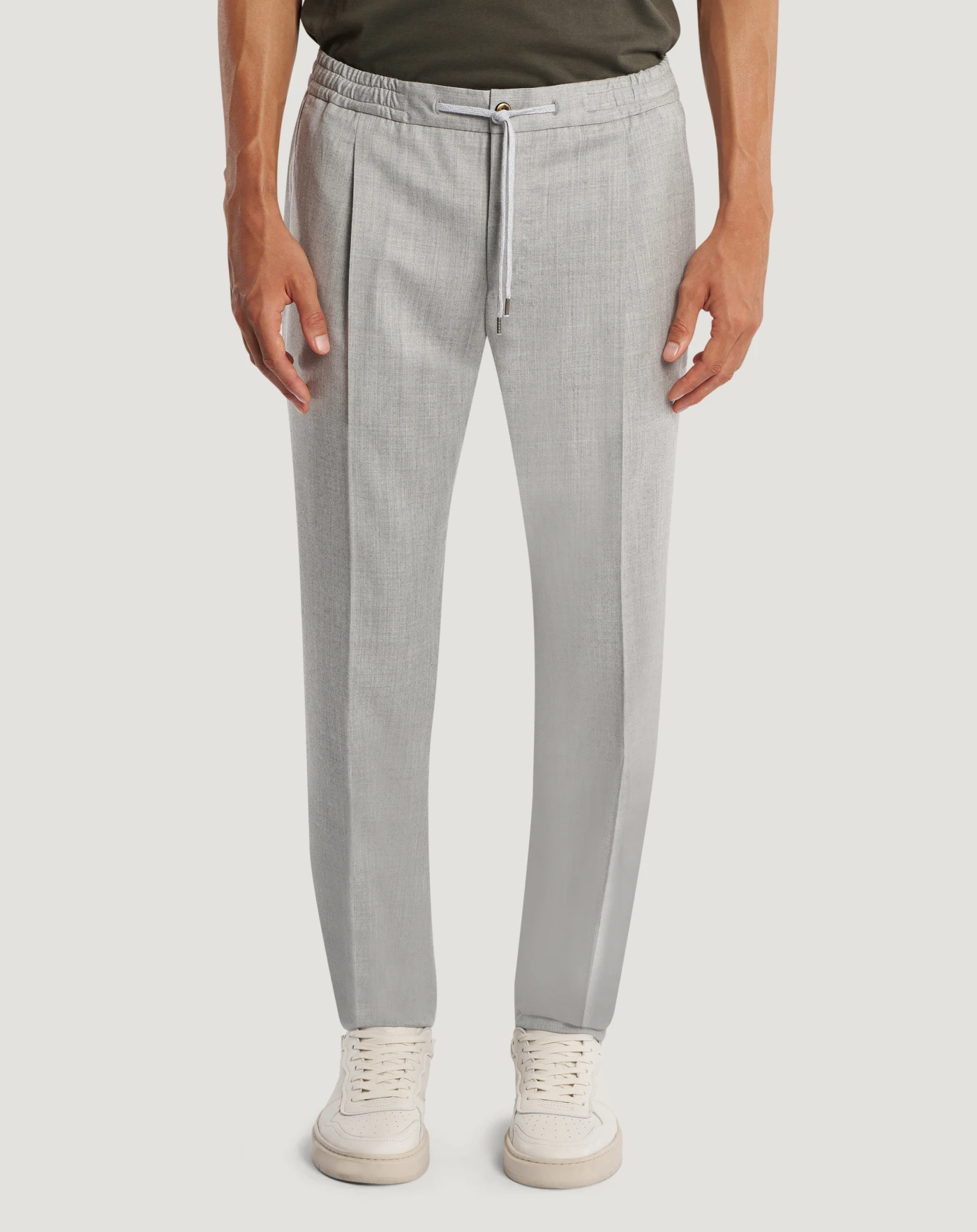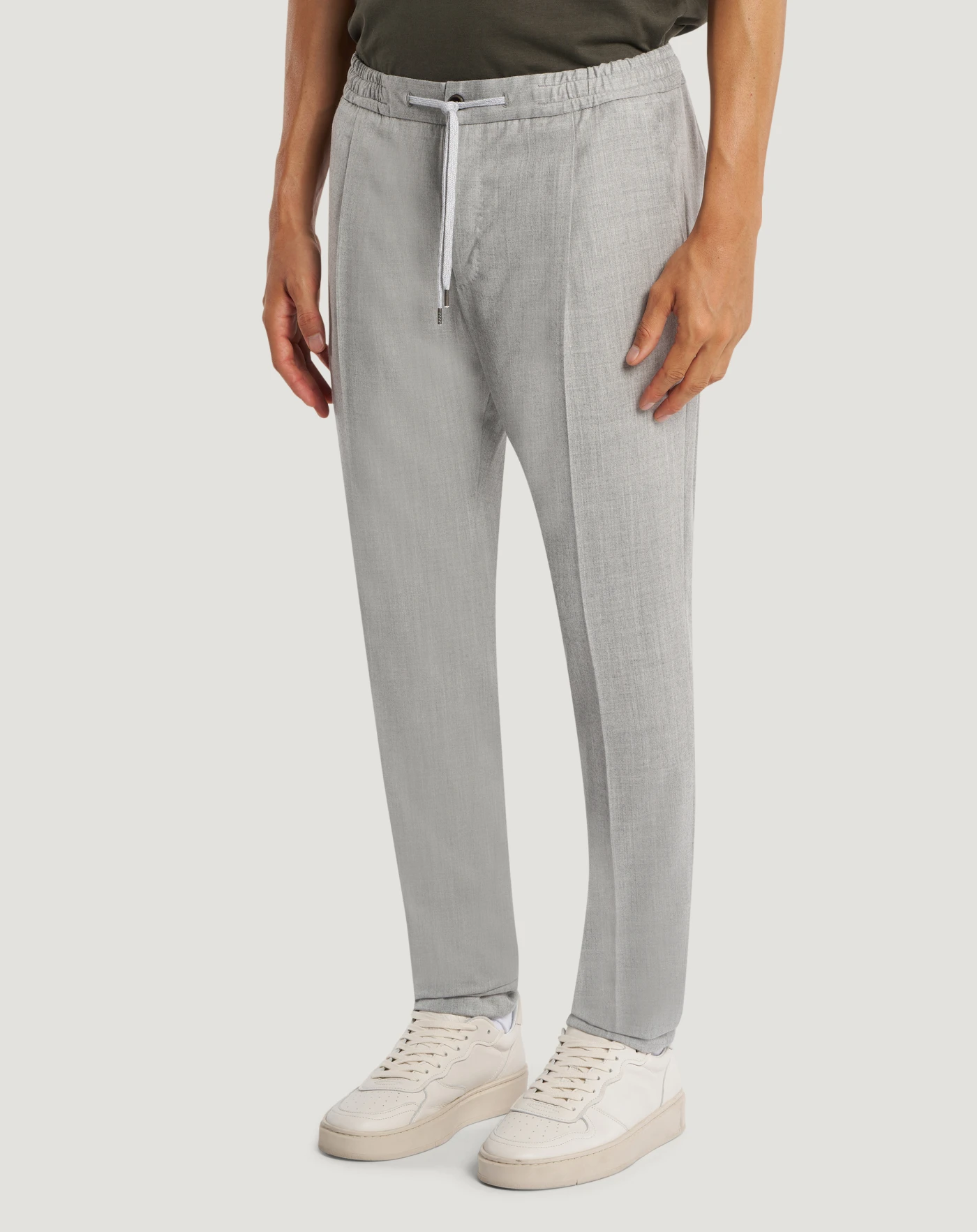 Trousers in wool and silk flannel, a refined blend with texture that guarantees comfort and impeccable fit.Relaxed fit with elasticated drawstring waist, pair them with the matching jacket for an easy leisure time suit.