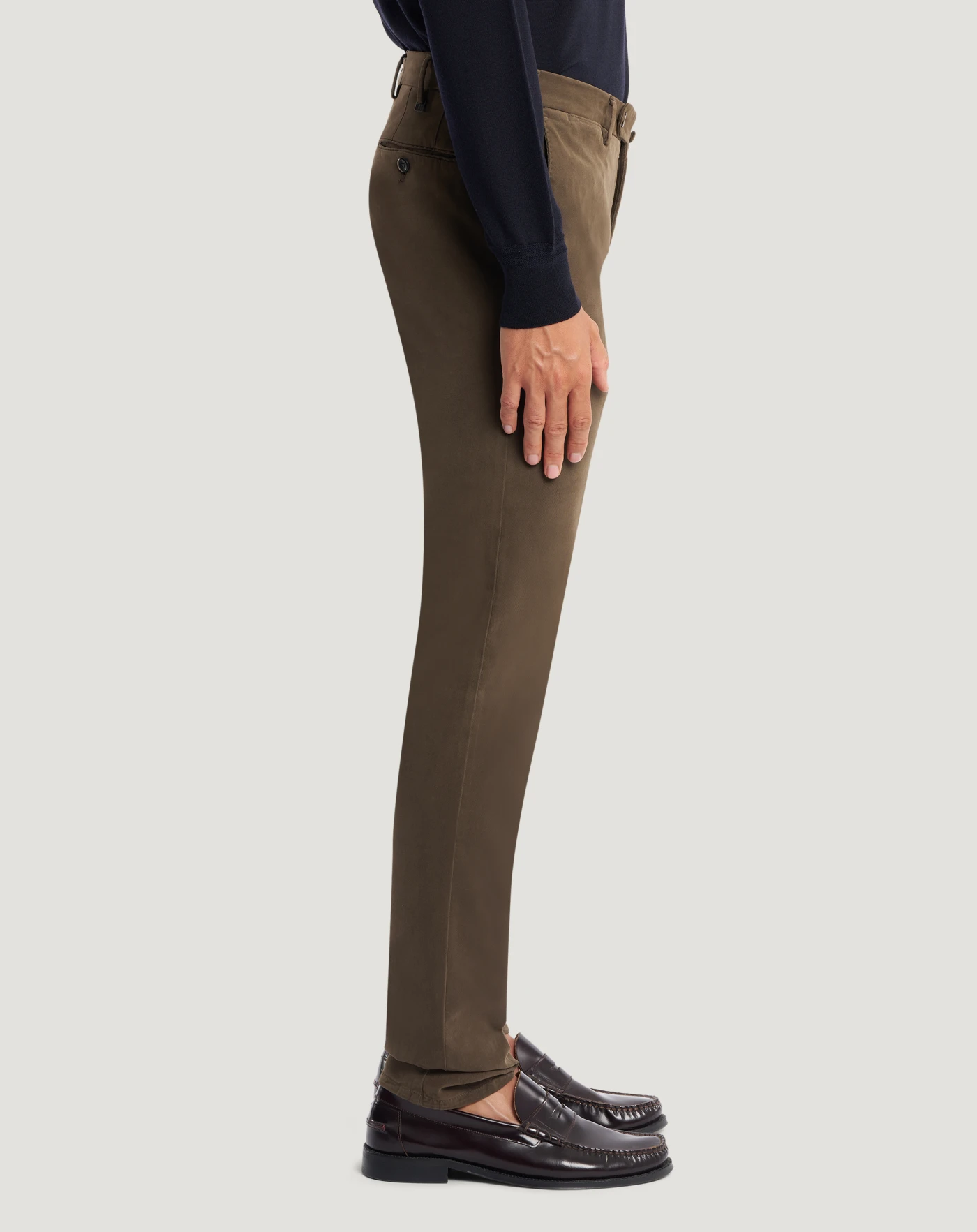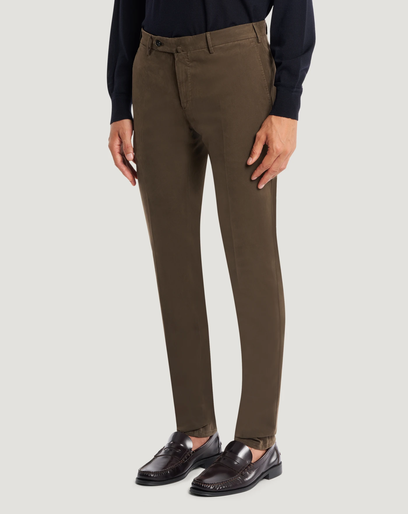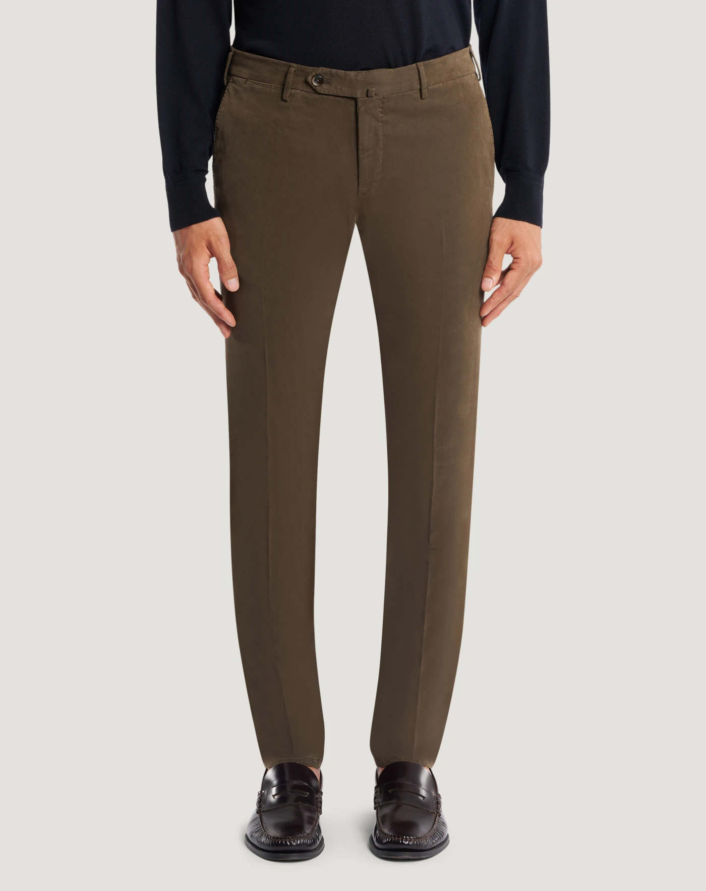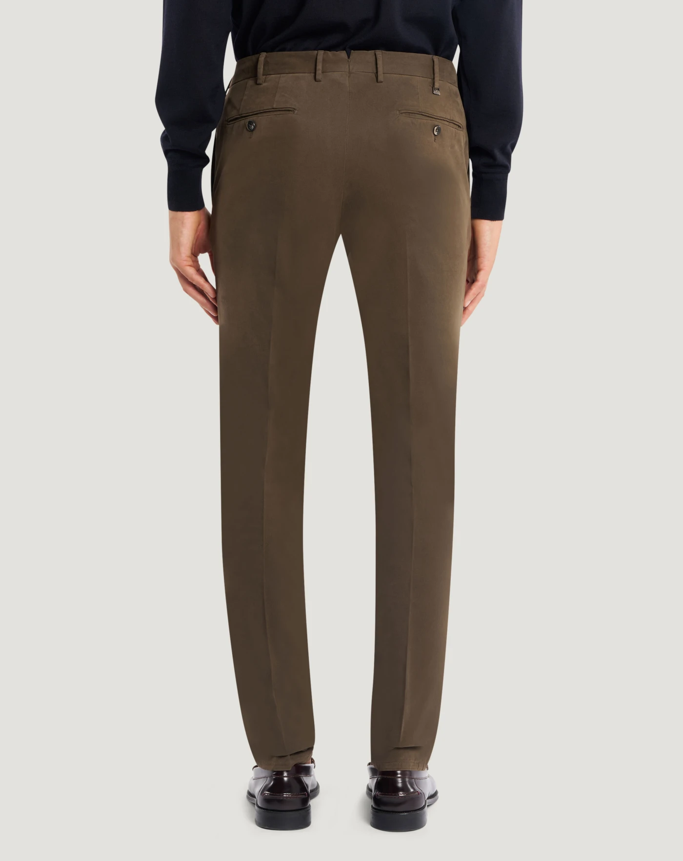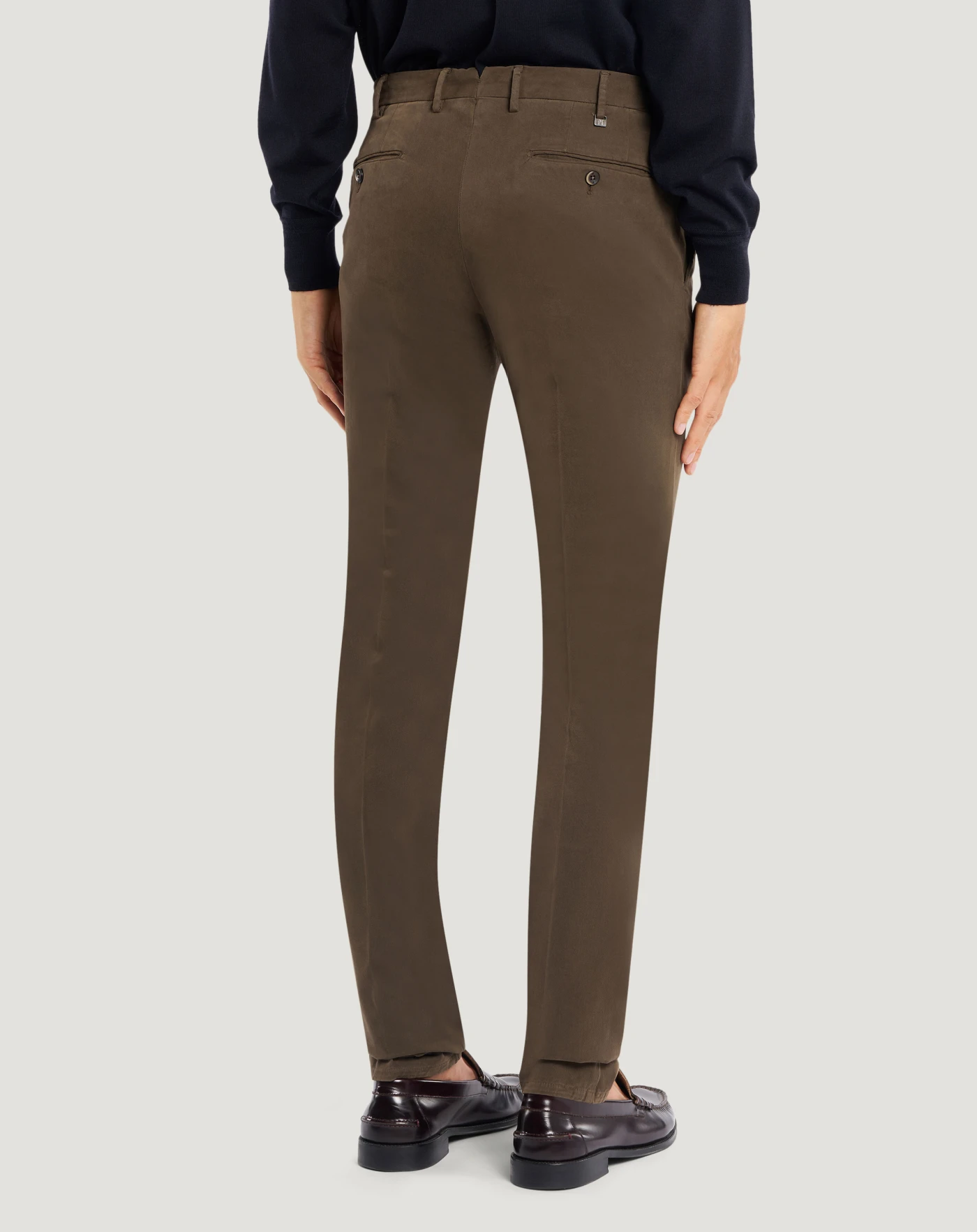 Trousers in stretch gabardine with a soft, enveloping feel. The smooth, compact surface is combined with light elasticity to offer comfort without sacrificing structure. The garment is delivered unstitched, so that it can be finished to suit your length and style through simple tailoring. With a super slim, simple fit and pressed crease, they are perfect for contemporary elegance.
