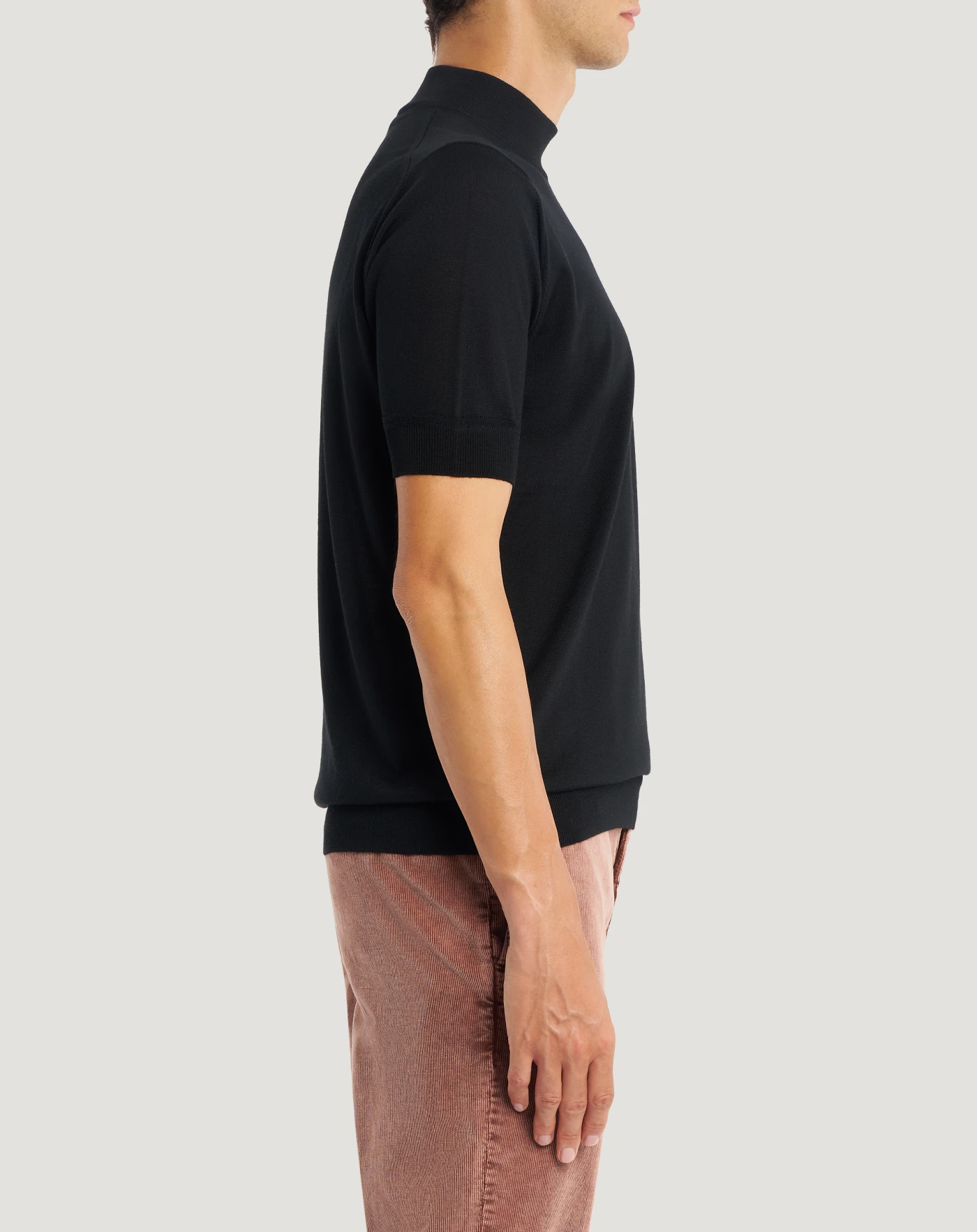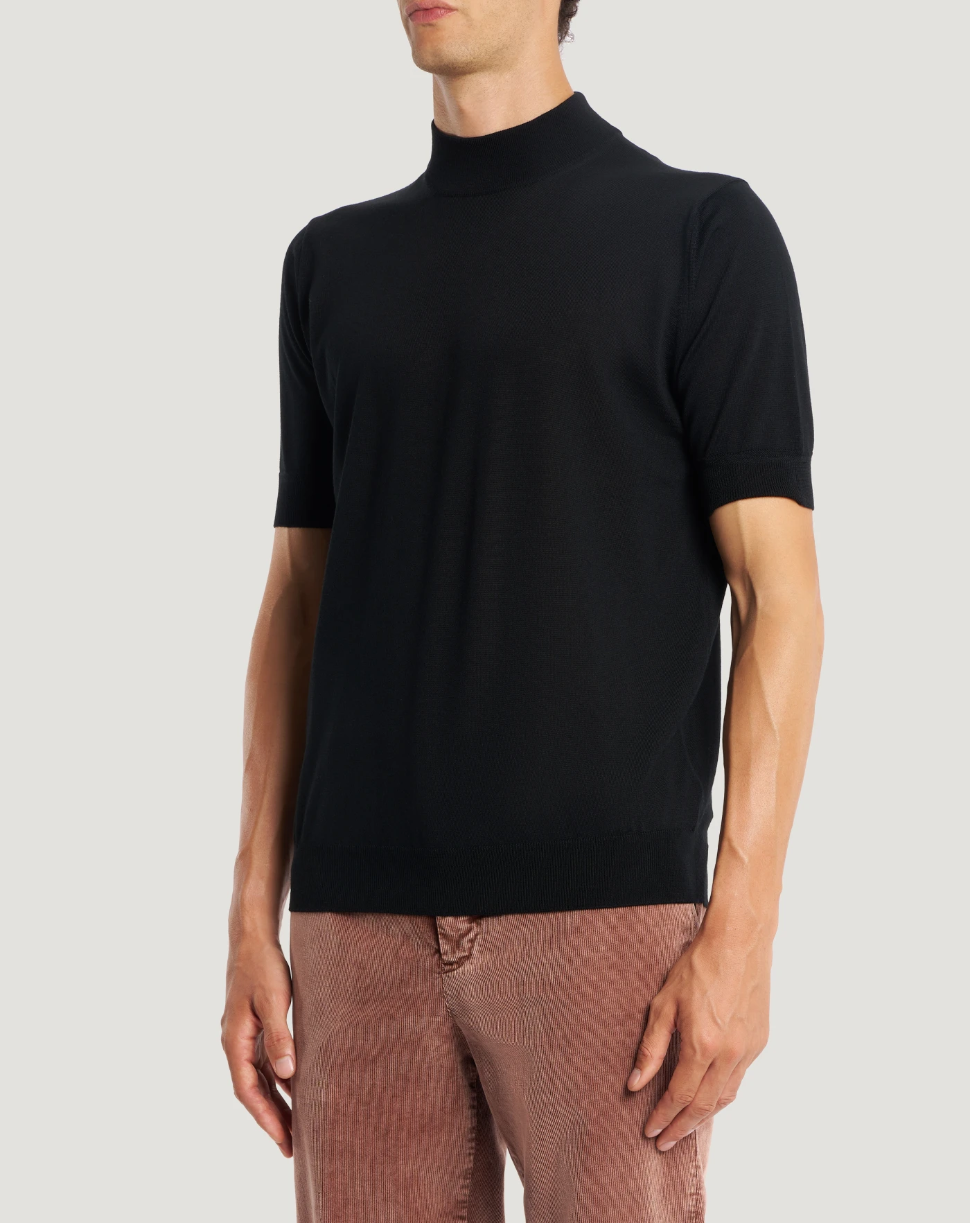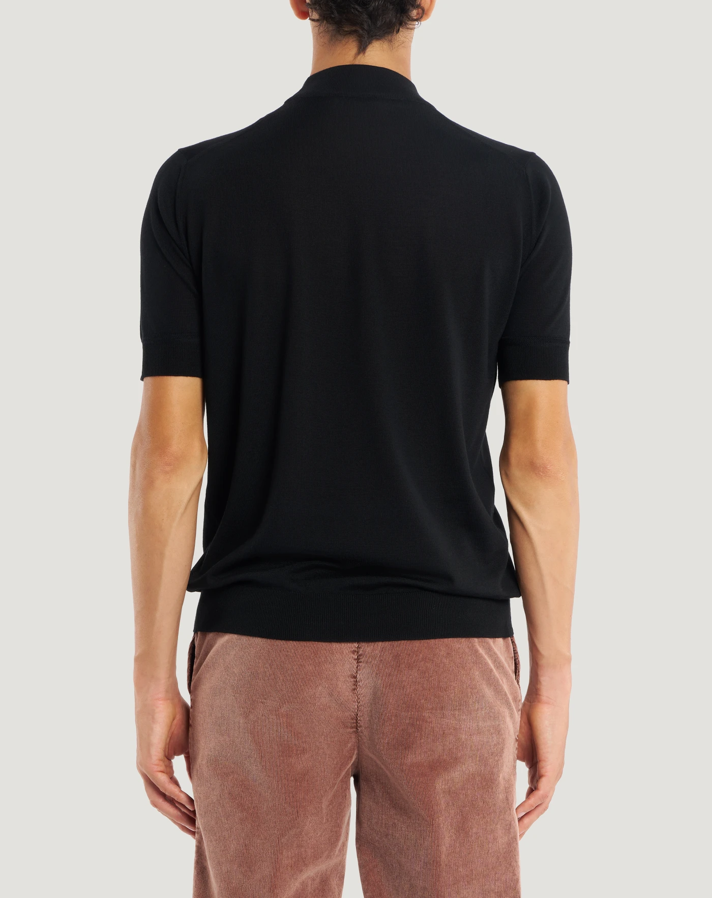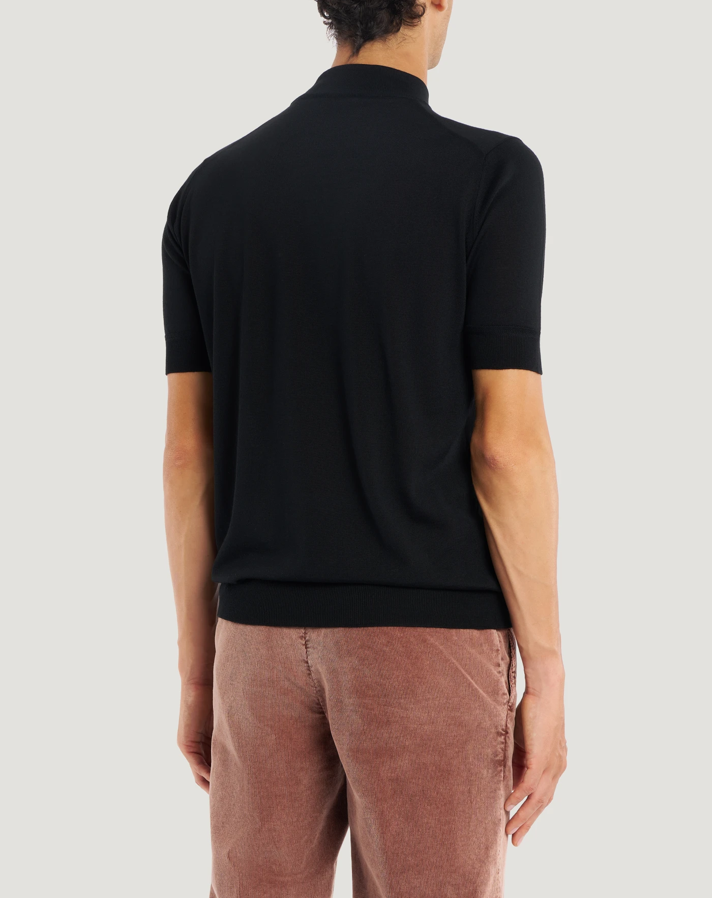 Polo neck jumper in pure wool with stocking-stitch finish and fineness 16 for a very light, comfortable garment.With a slim fit and short sleeves, it has an essential and versatile design that completes both formal and casual looks. Choose the black variant to give your style a refined touch.