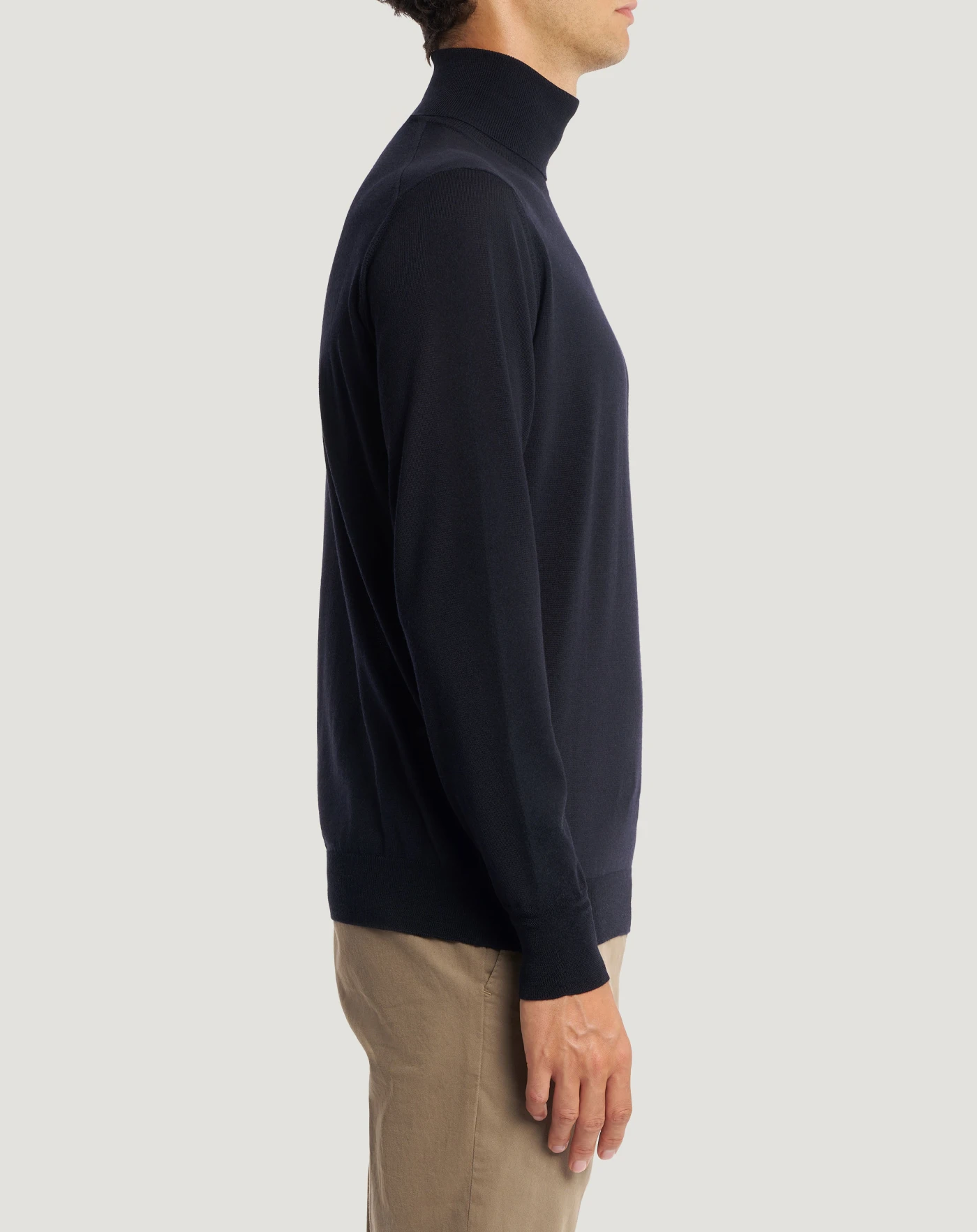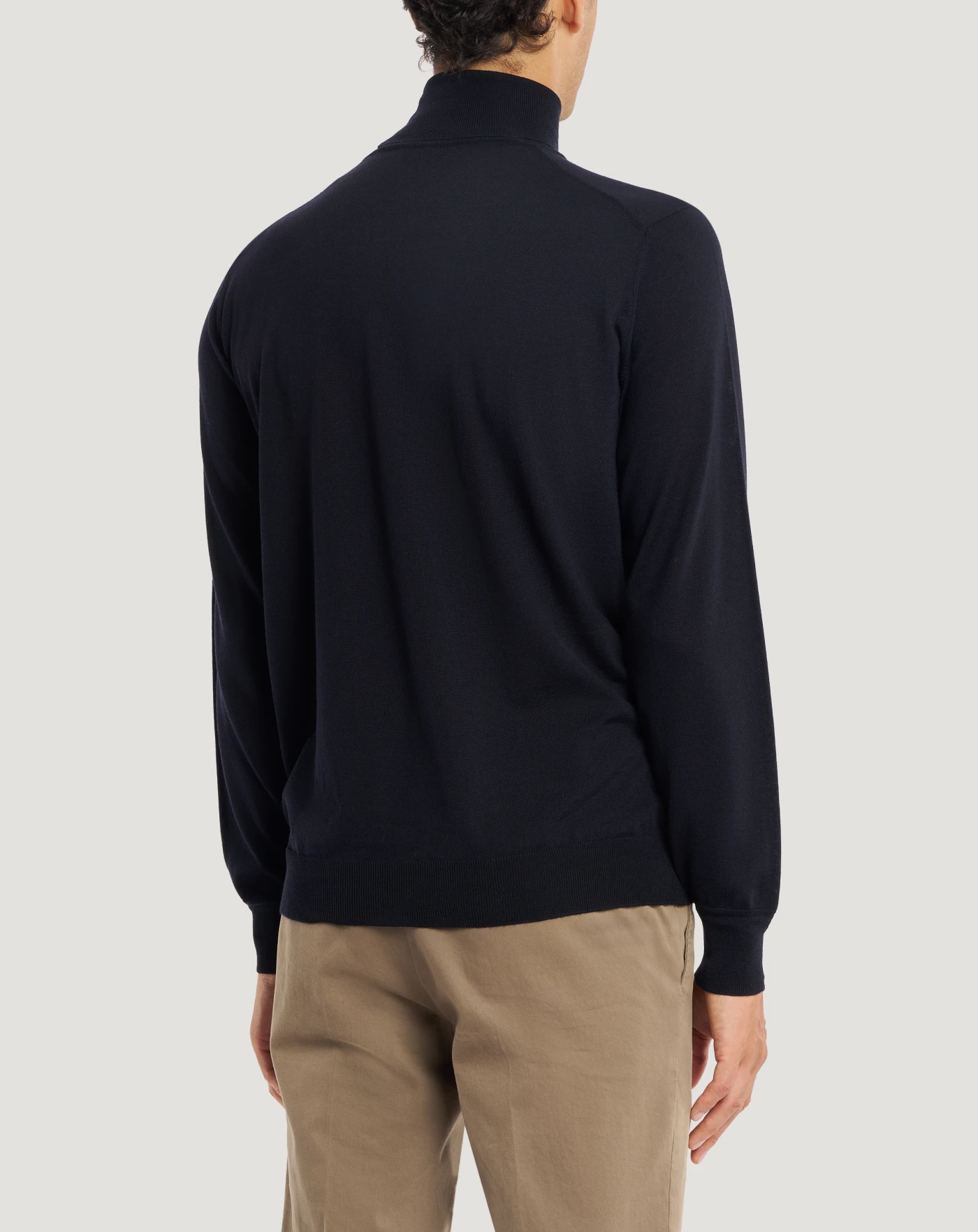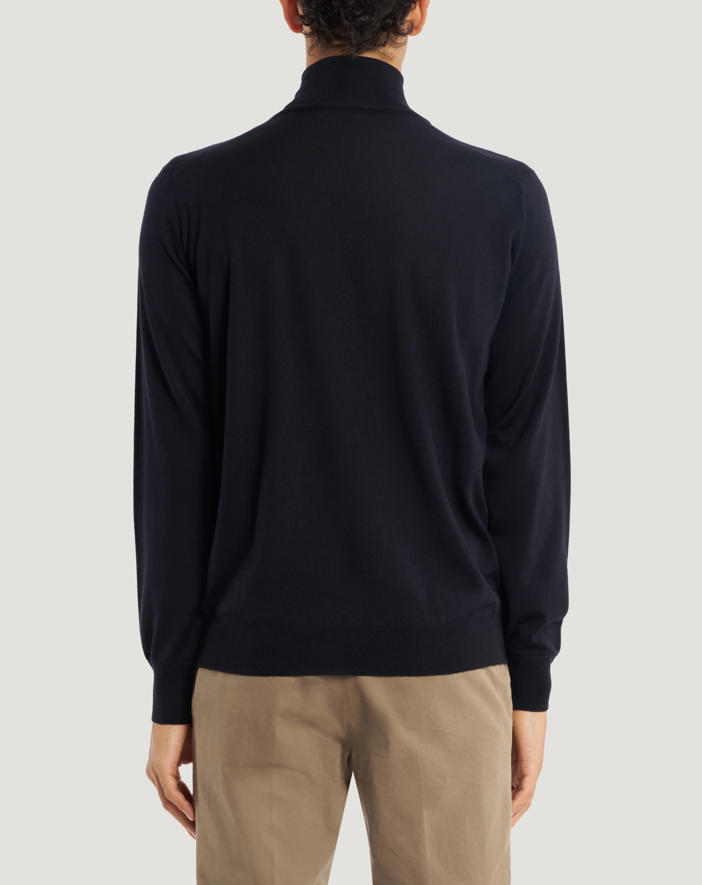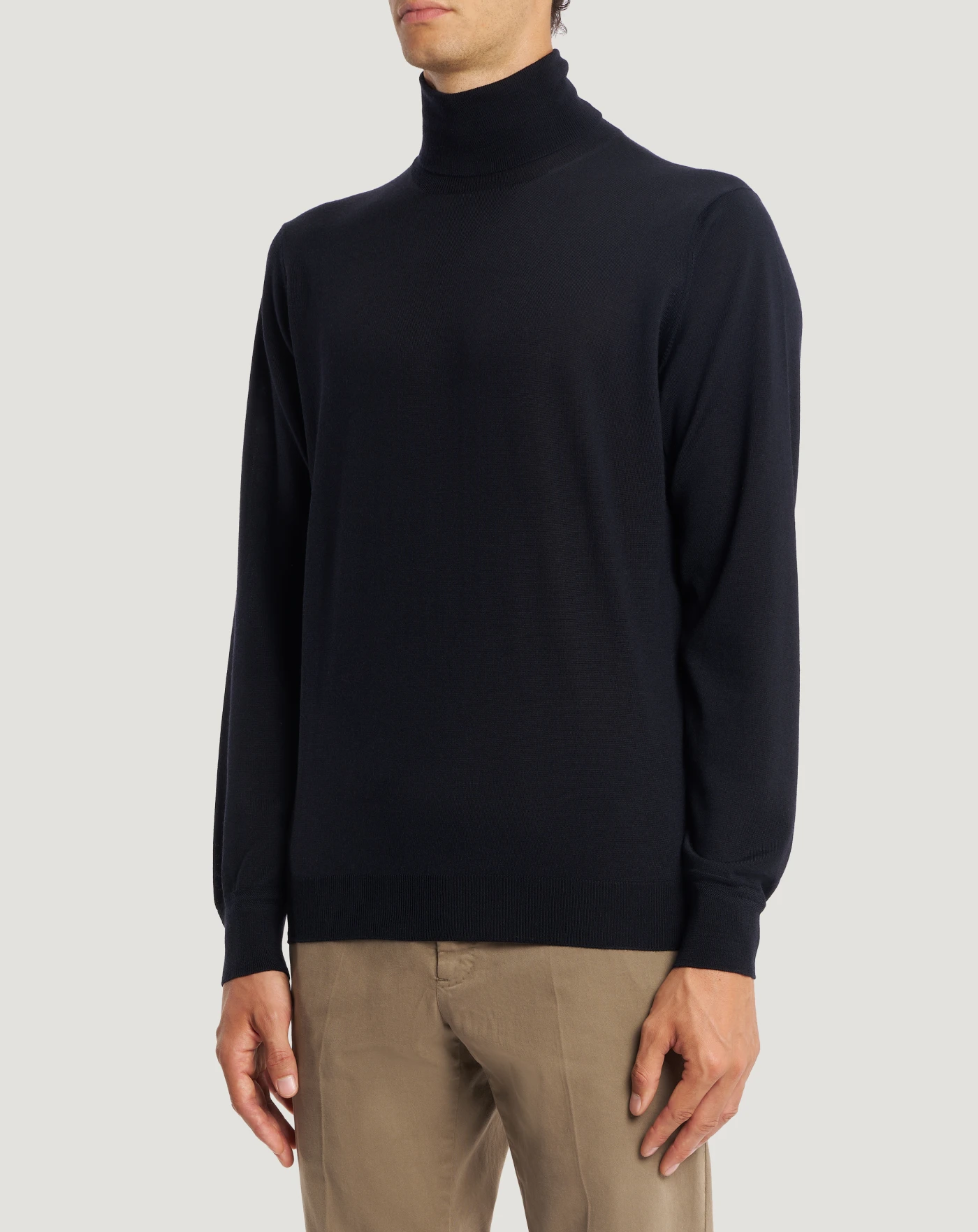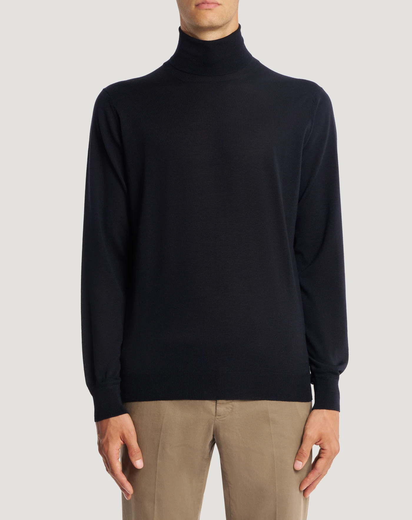 Stocking-stitch jumper in pure cotton fineness 16, which makes the garment lightweight and very comfortable.With a high neck and slim fit, the jumper features an essential and versatile design that completes formal and casual looks and is also perfect under a jacket. Choose the navy blue variant to convey versatile elegance.