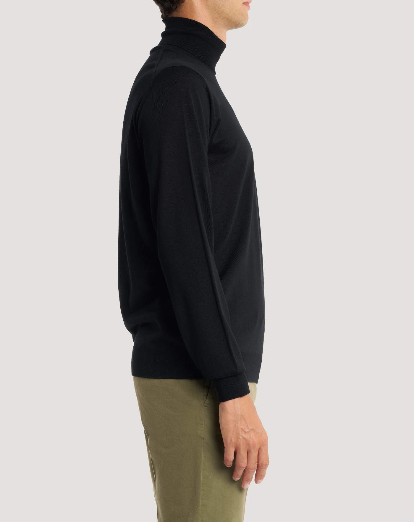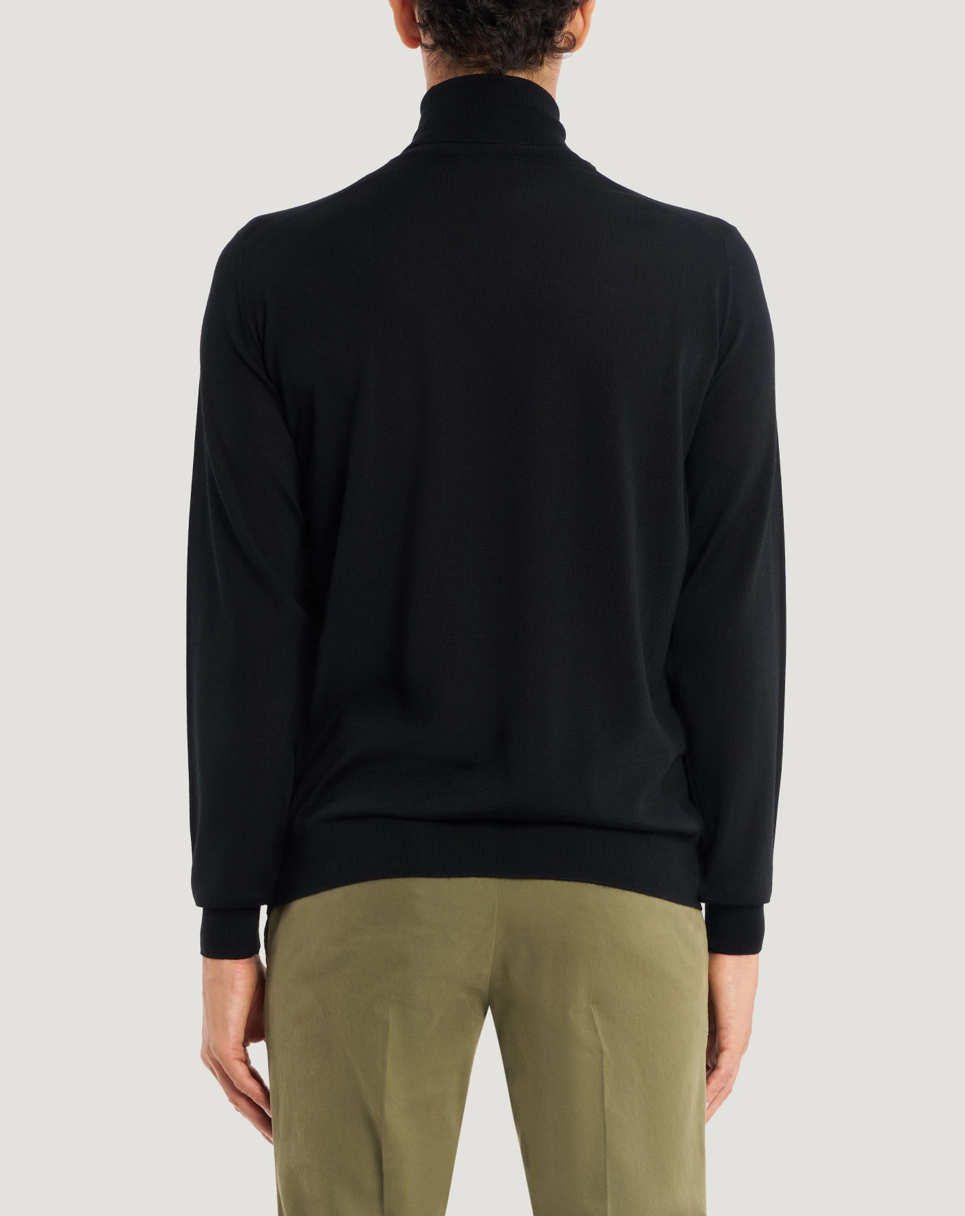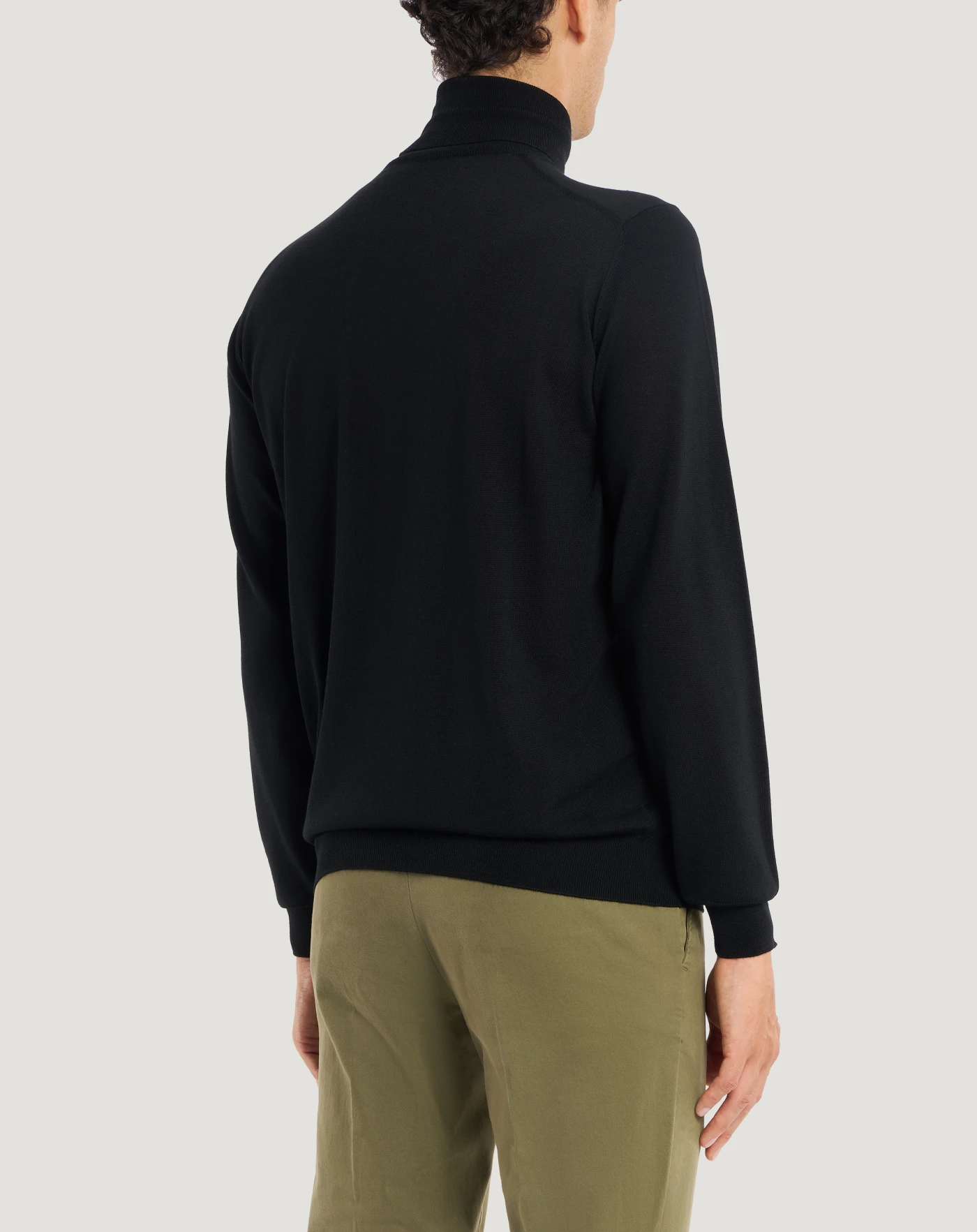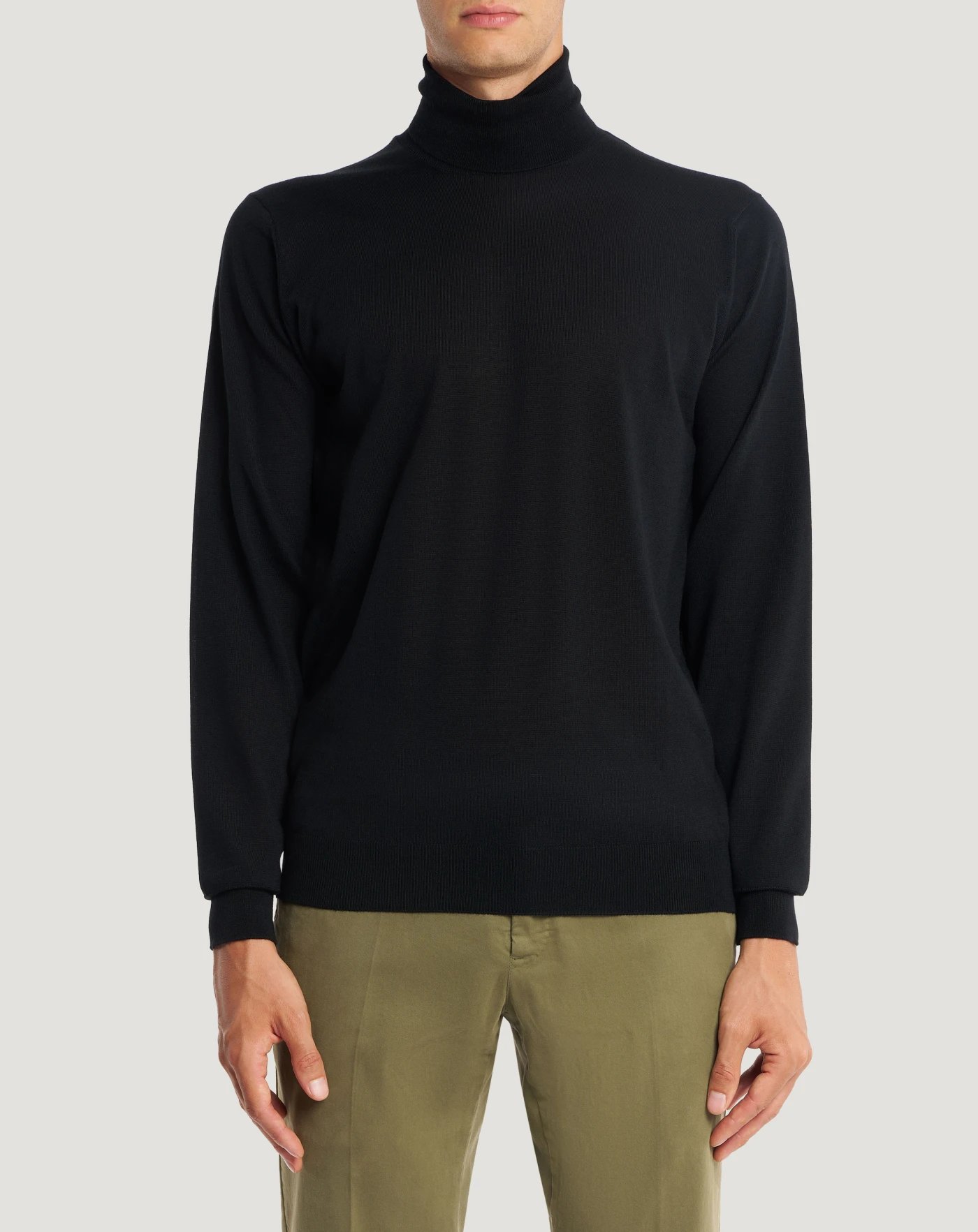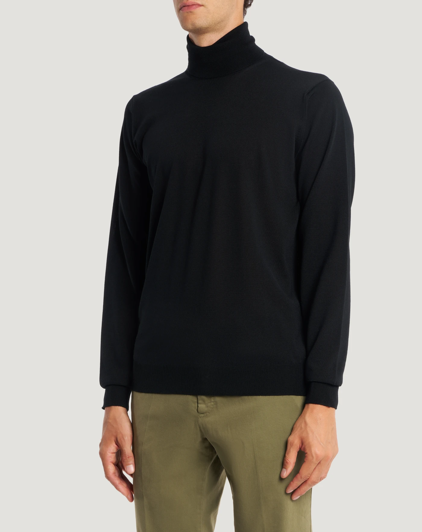 Stocking-stitch jumper in pure cotton fineness 16, which makes the garment lightweight and very comfortable.With a high neck and slim fit, the jumper features an essential and versatile design that completes formal and casual looks and is also perfect under a jacket. Choose the black variant to flaunt versatile elegance.