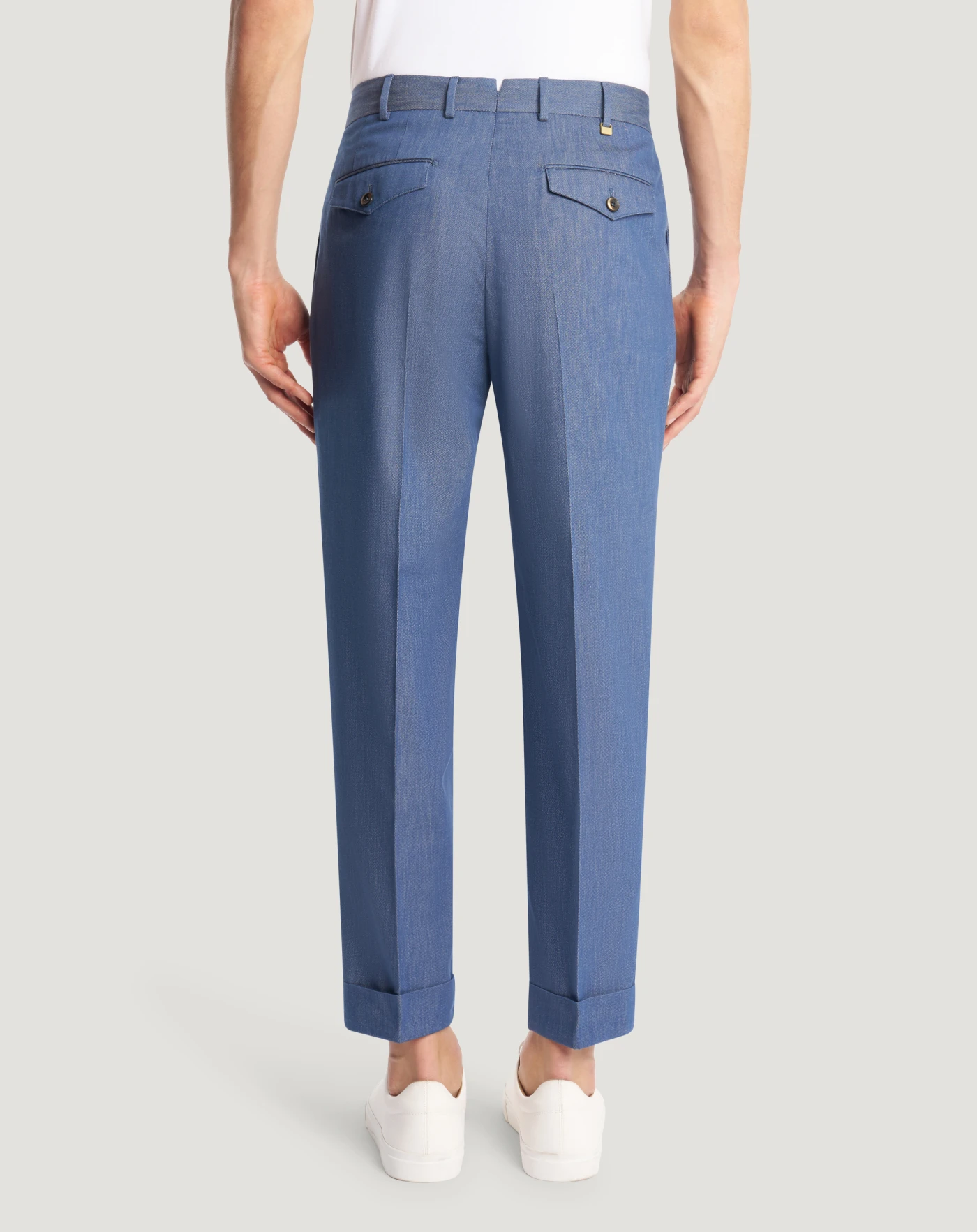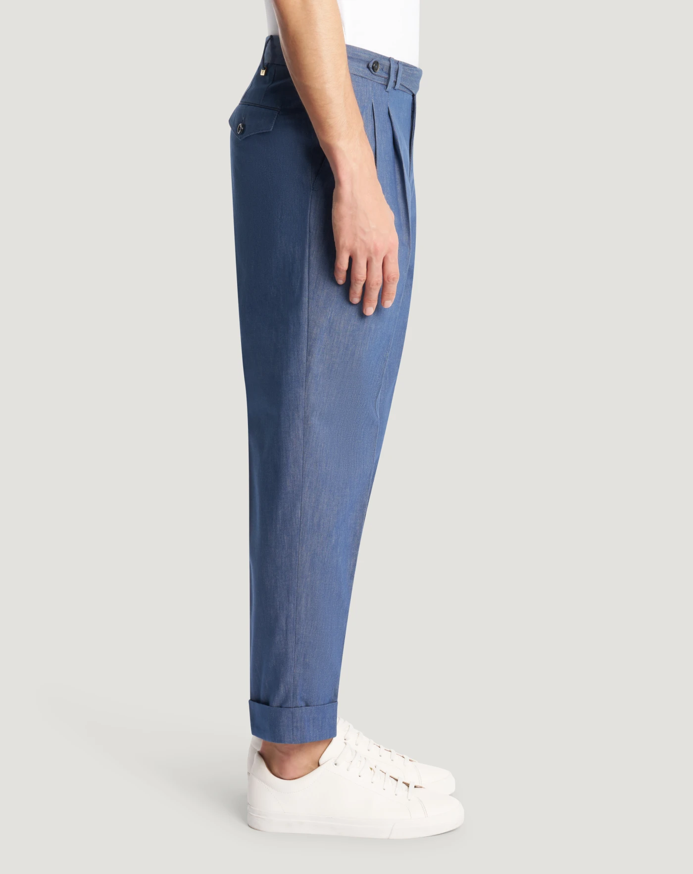 Trousers in lightweight recycled cotton denim, perfect for the season.With two front pleats and turn-ups, in navy blue they are perfect for versatile, casual looks.