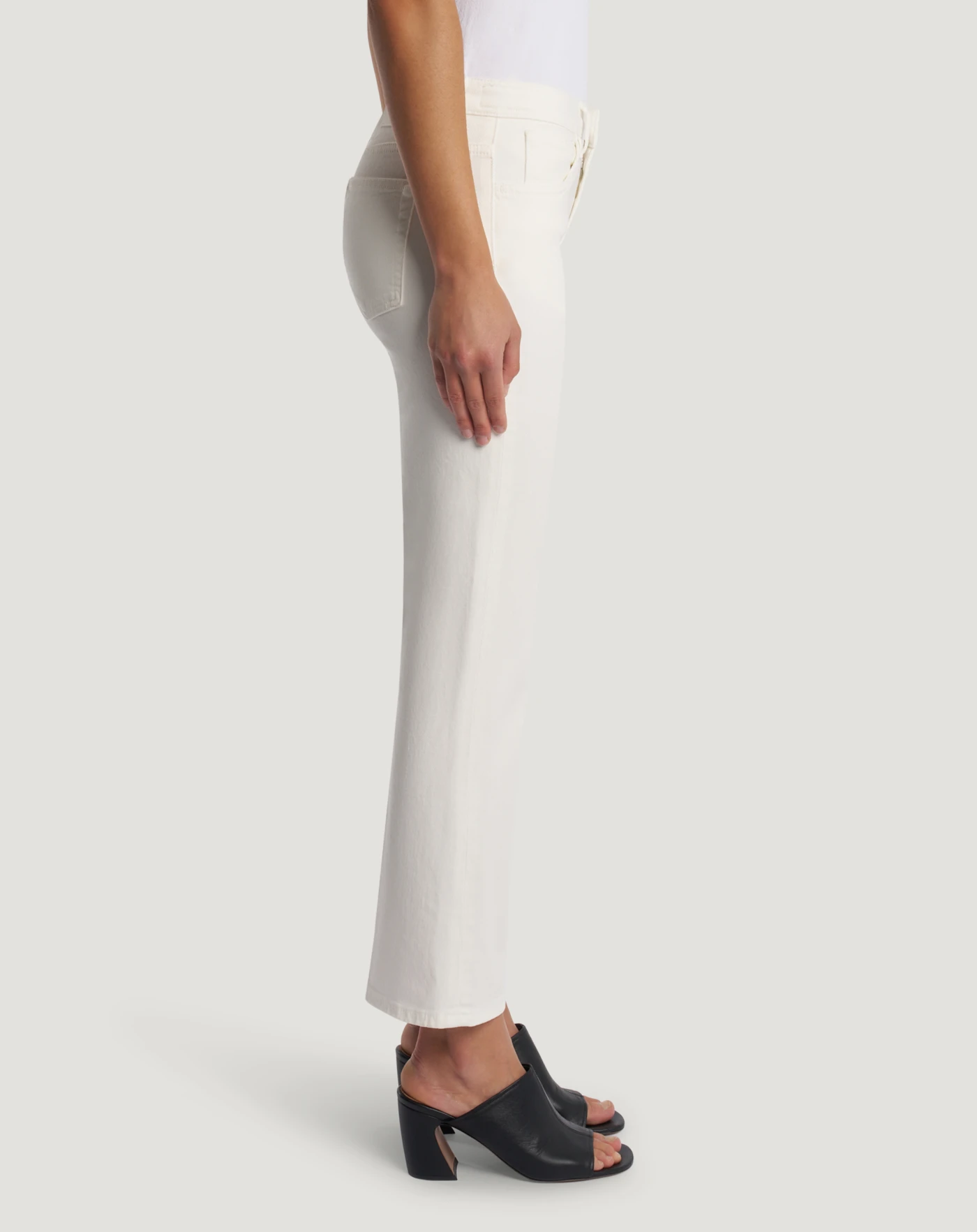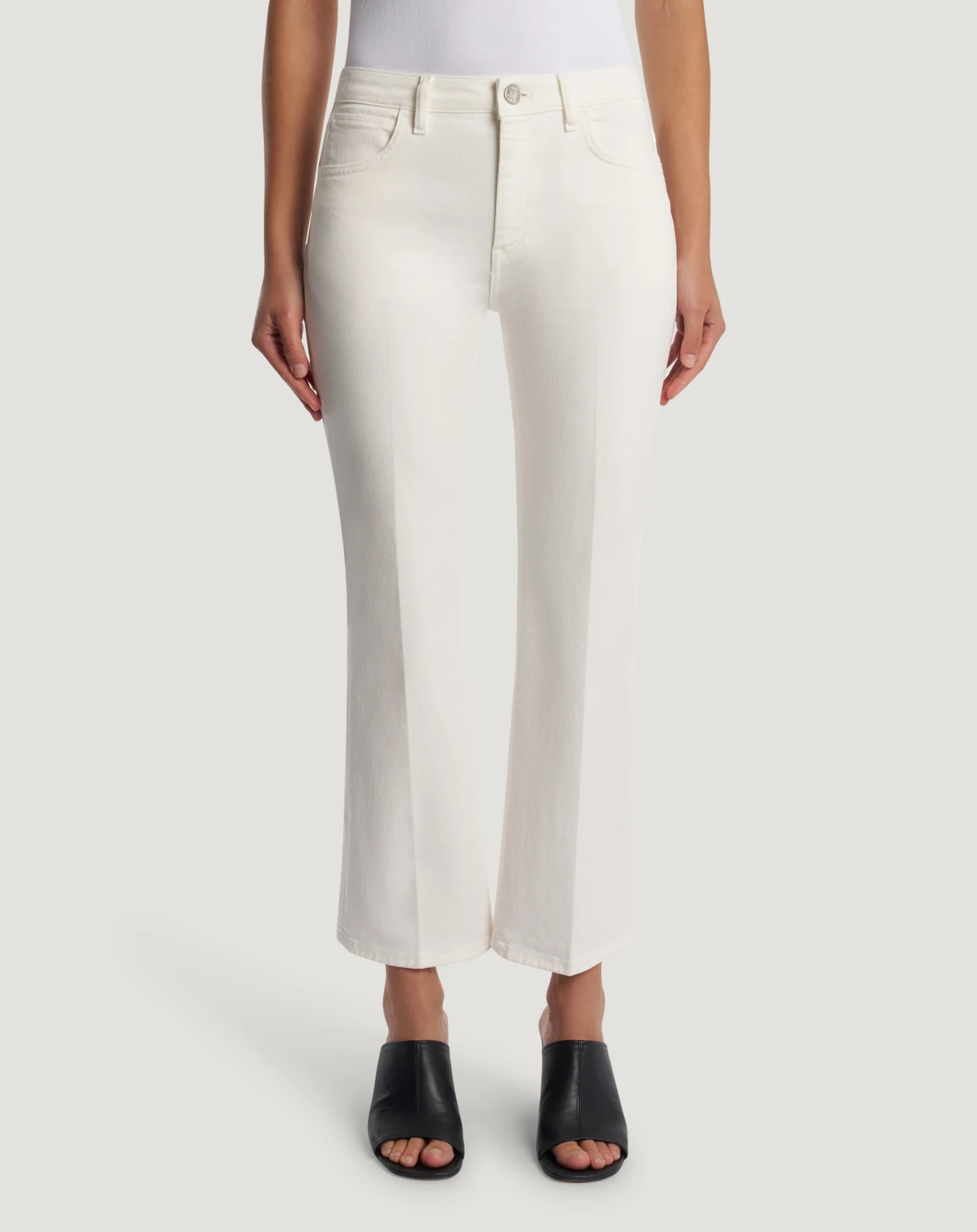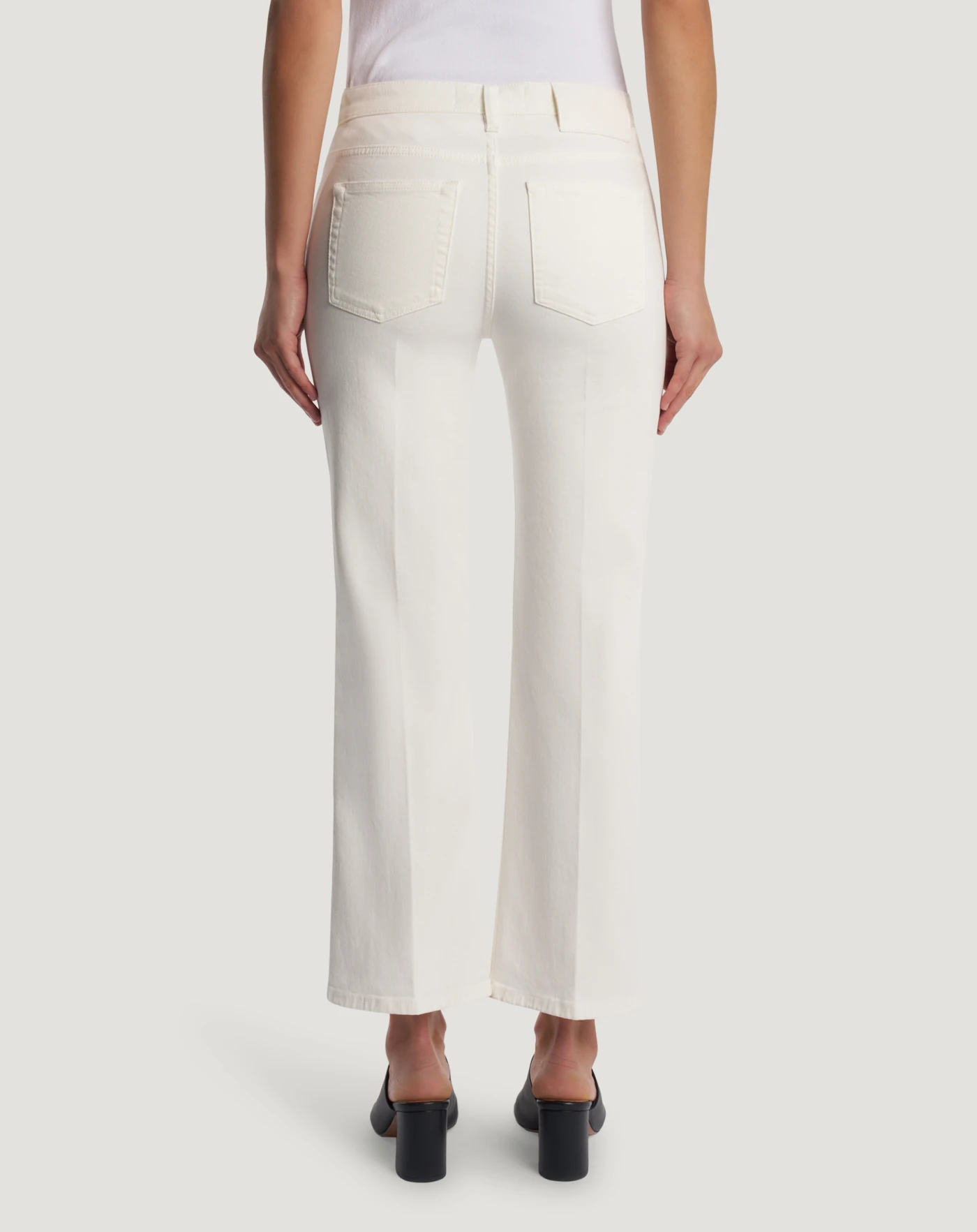 Trousers in stretch cotton bull denim, a compact and durable fabric that is perfect for everyday wear. A cropped, flared fit and regular waist make it the model for 24-hour looks.