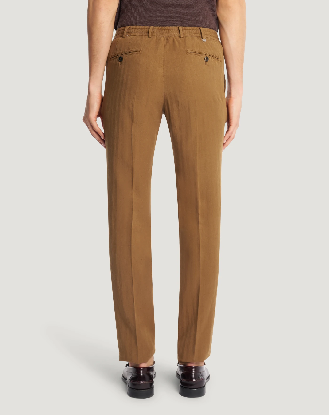 Trousers in cotton and linen, a fluid, soft fabric featuring a fine and delicate herringbone pattern.The garment is delivered unstitched, so that it can be finished to suit your length and style through simple tailoring.With an elasticated waist and drawstring, they have a relaxed yet elegant appearance that can be interpreted in myriad looks.