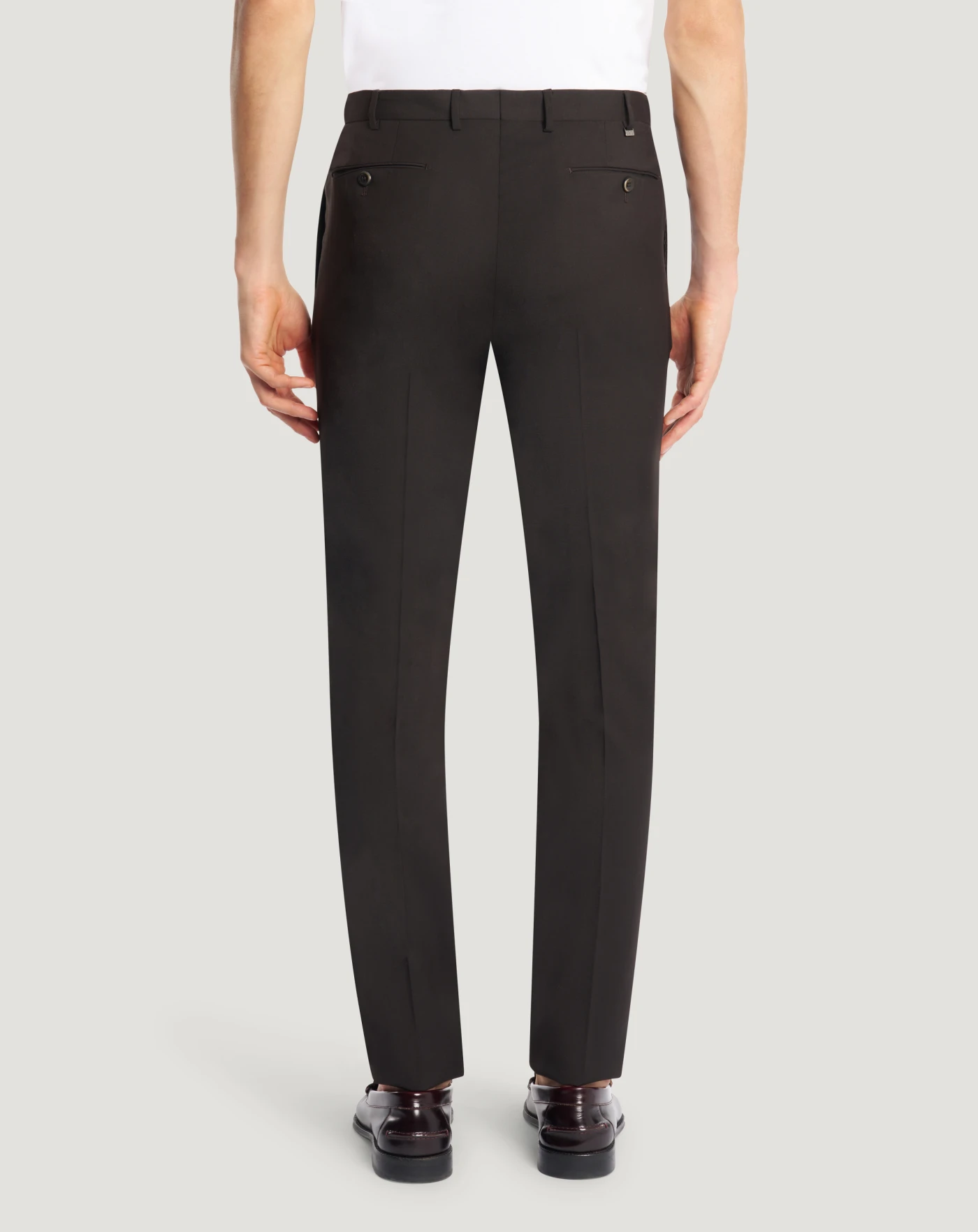 Trousers in a lightweight, modern techno fabric in plain weave that features elasticity and is completely washable in water without losing performance or appearance.The garment is delivered unstitched, so that it can be finished to suit your length and style through simple tailoring. Choose the brown variant for an edgy look.