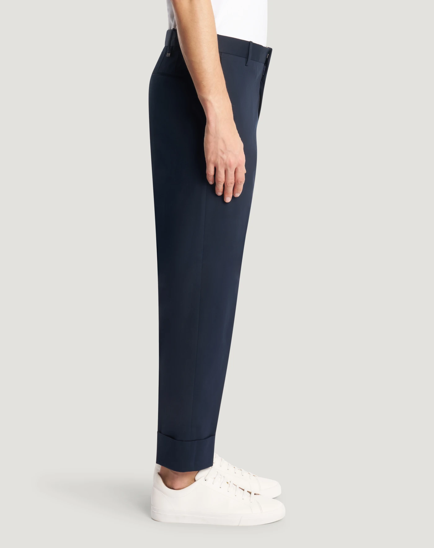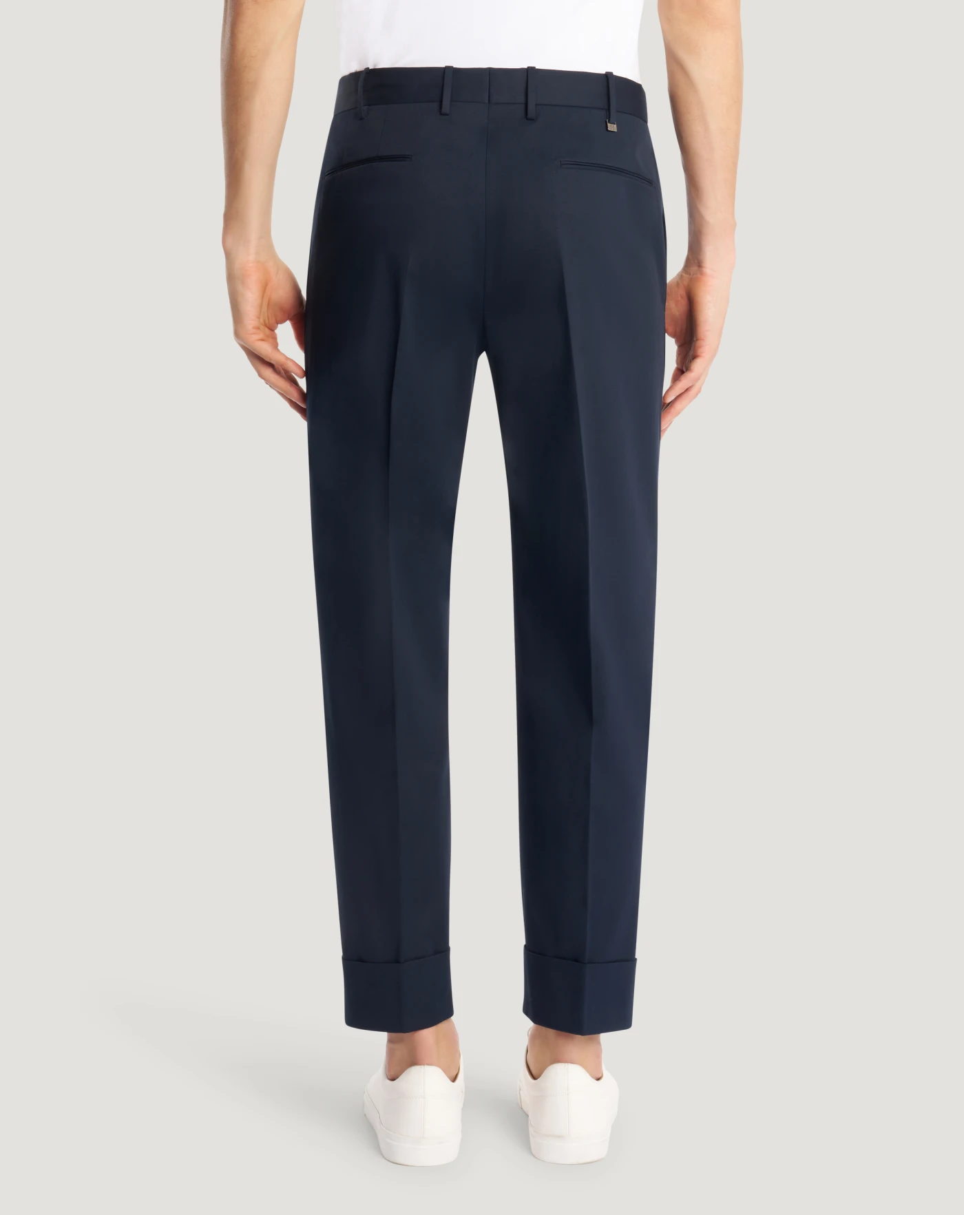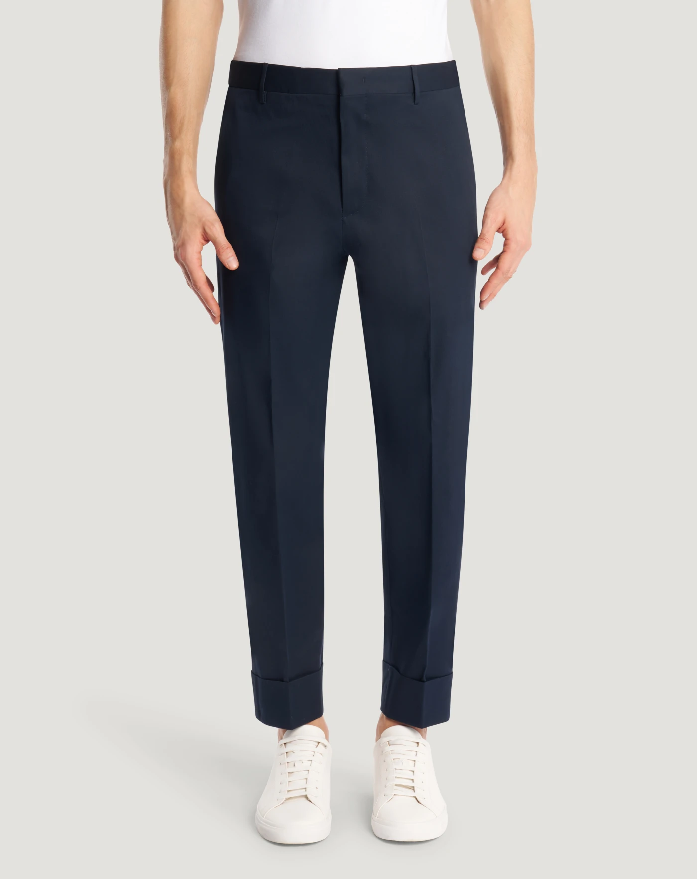 Trousers in stretch twill, a fabric with a fine and regular diagonal weave and a clean, elegant look.They have a slightly carrot fit with turn-ups: choose blue to give your style character.