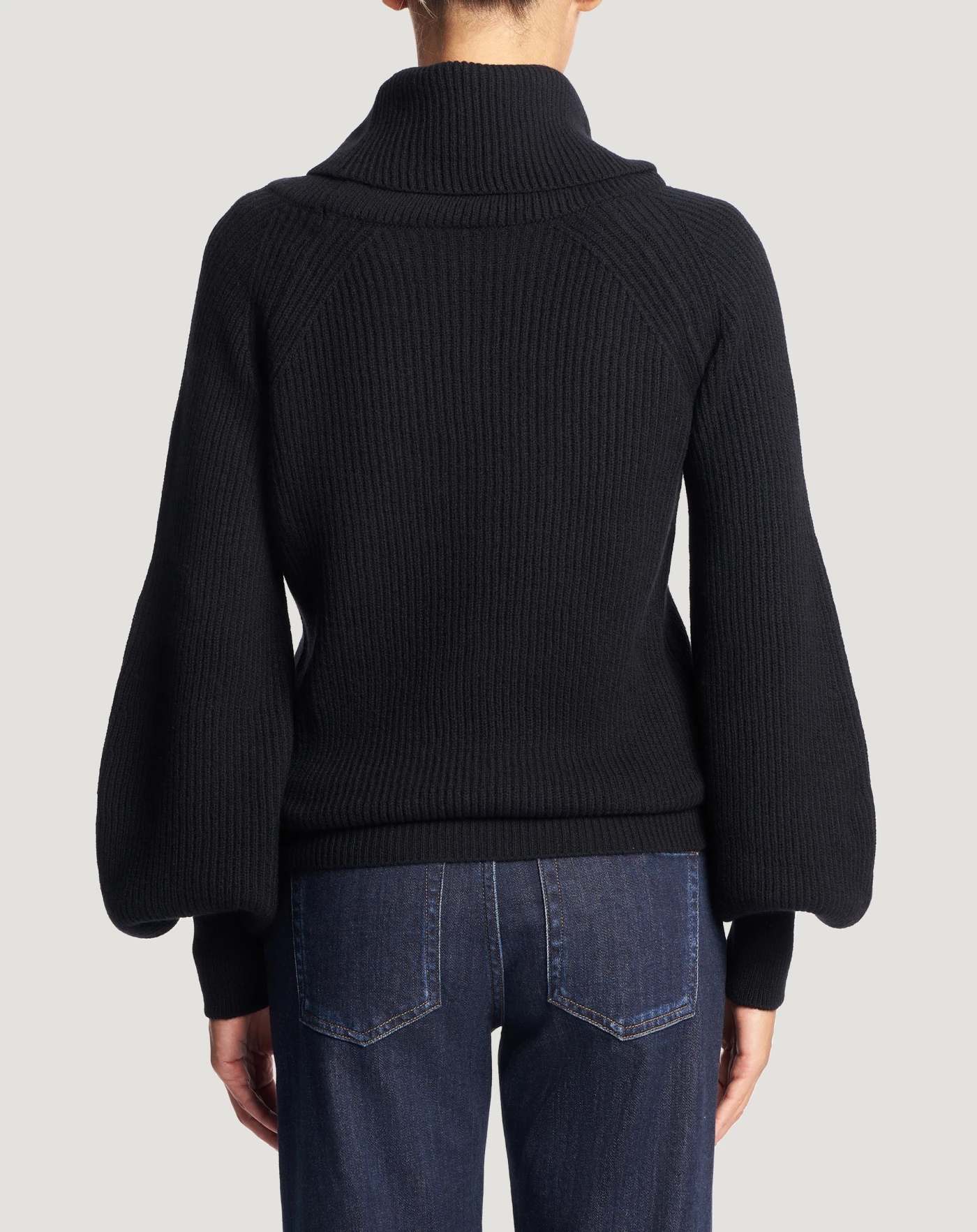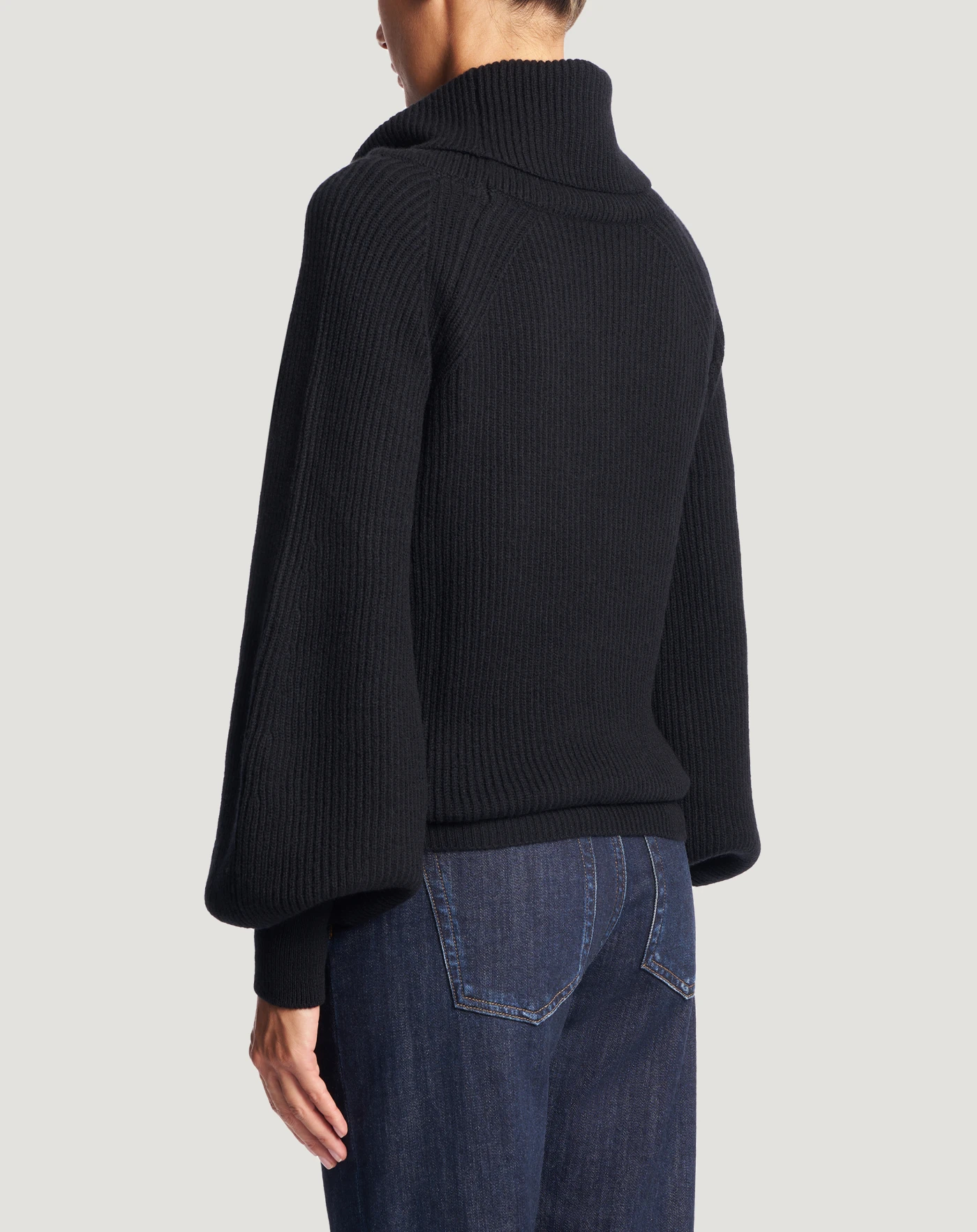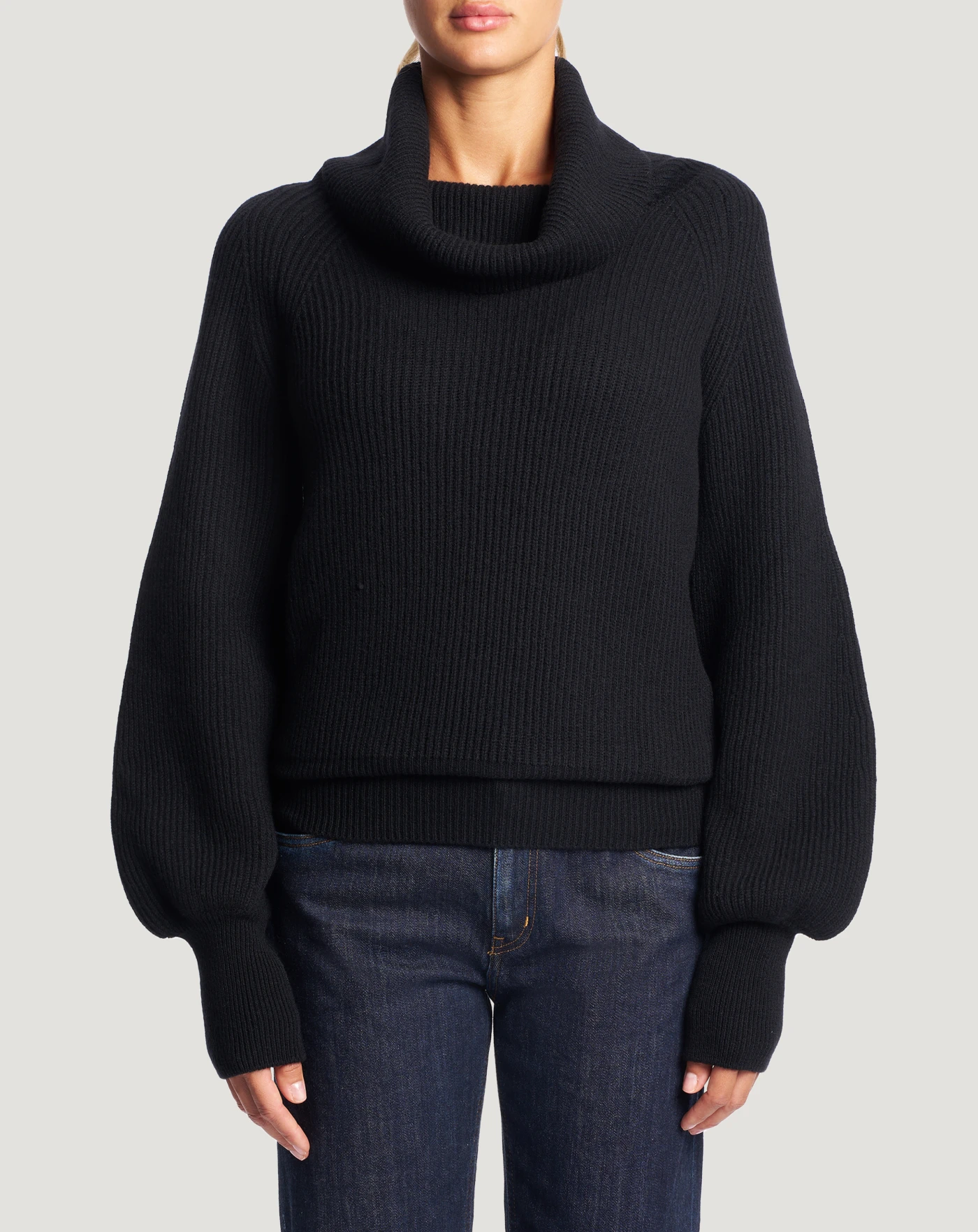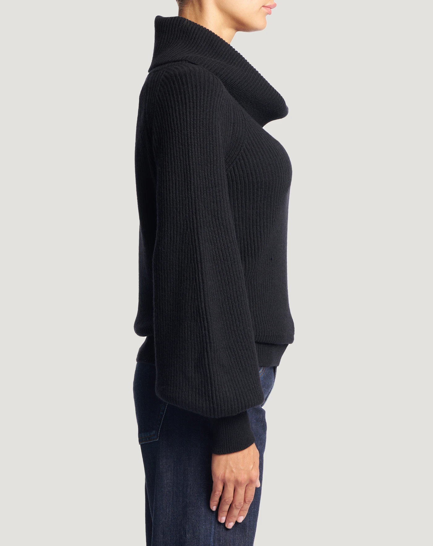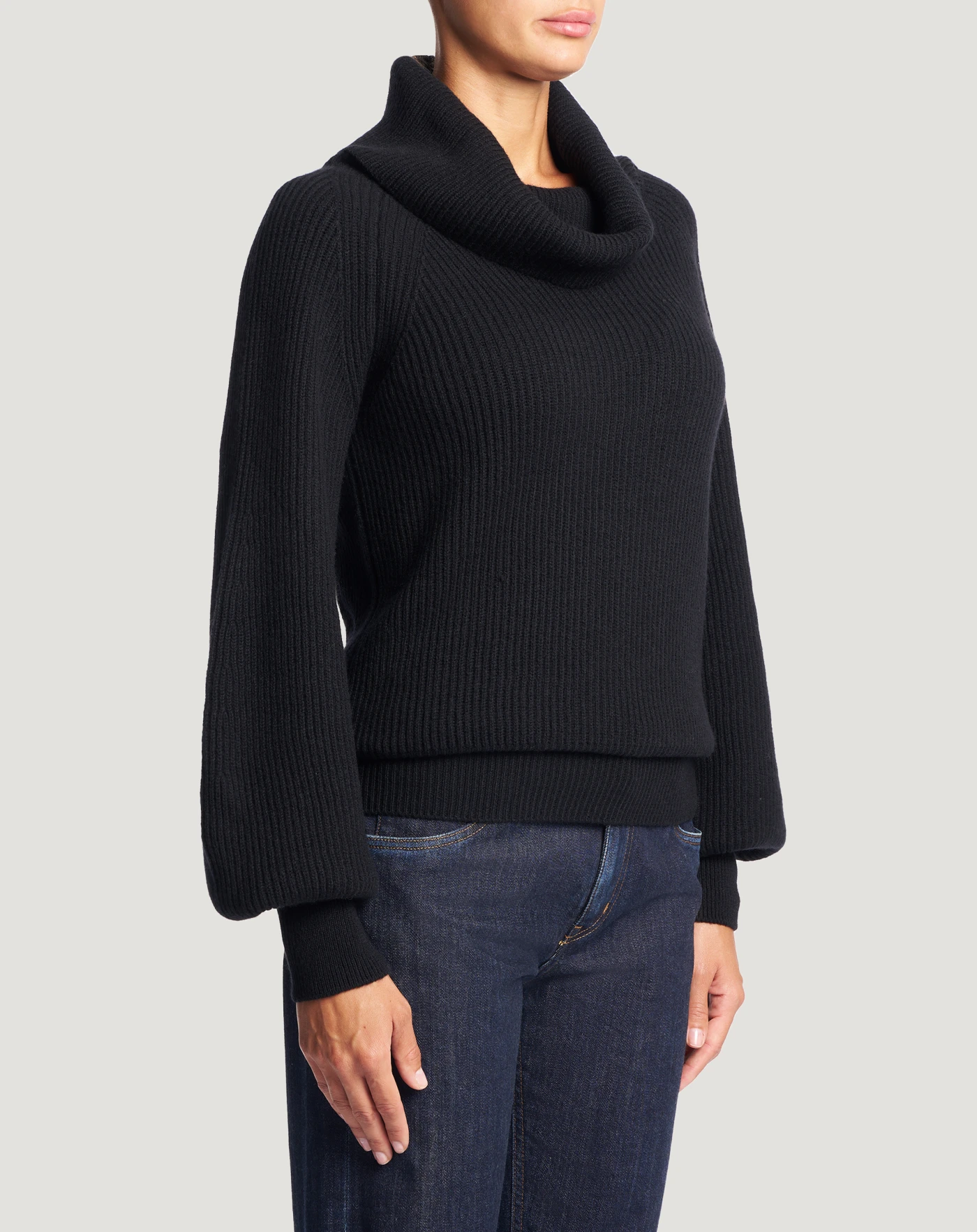 Fisherman’s rib jumper in wool and cashmere tricot, a soft and refined yarn.With a cowl neck and balloon sleeves that make it both cosy and chic.