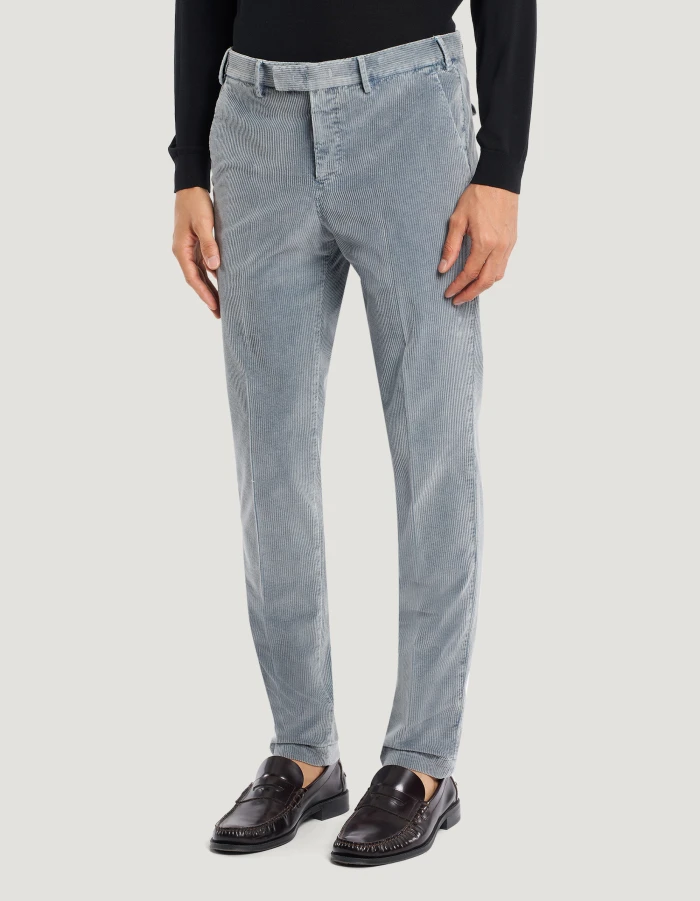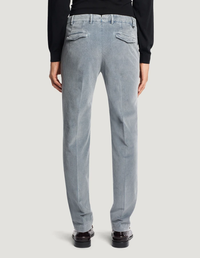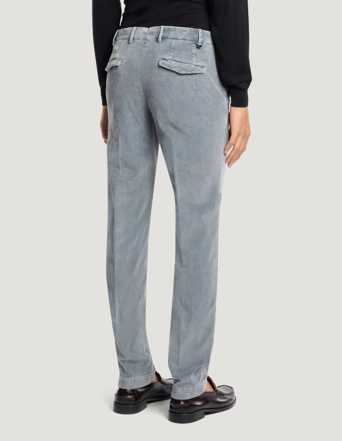 Trousers in stretch corduroy, a soft fabric with a faded look that adds character to your style.With a wide fit and front pleats for a dynamic effect, they are perfect to add personality to everyday and formal looks.