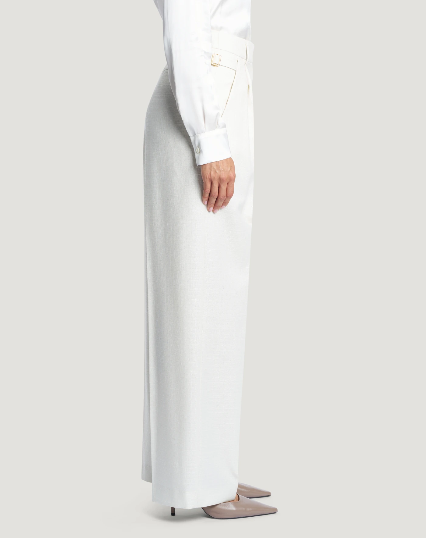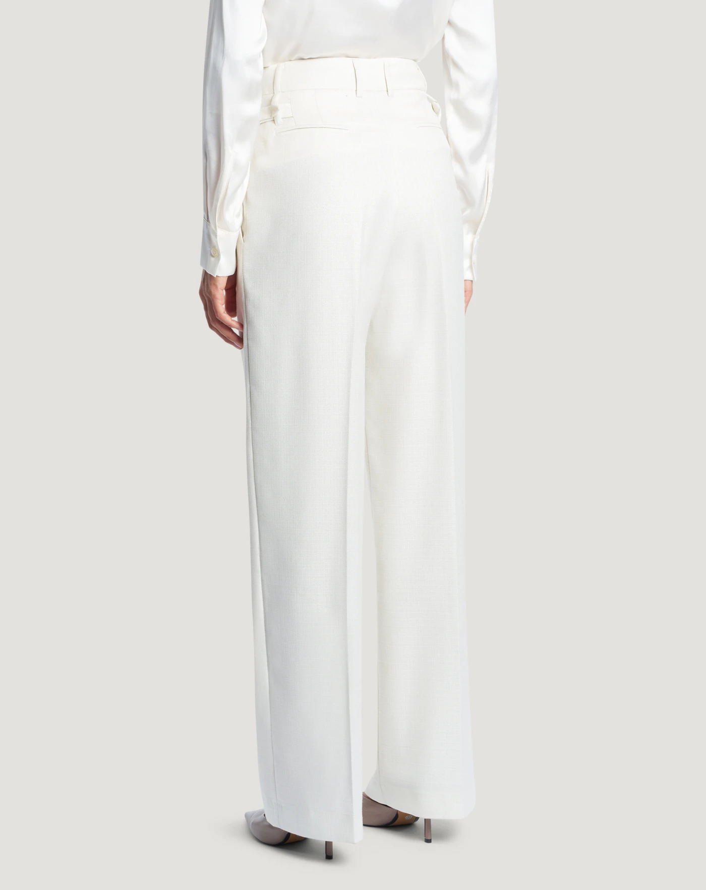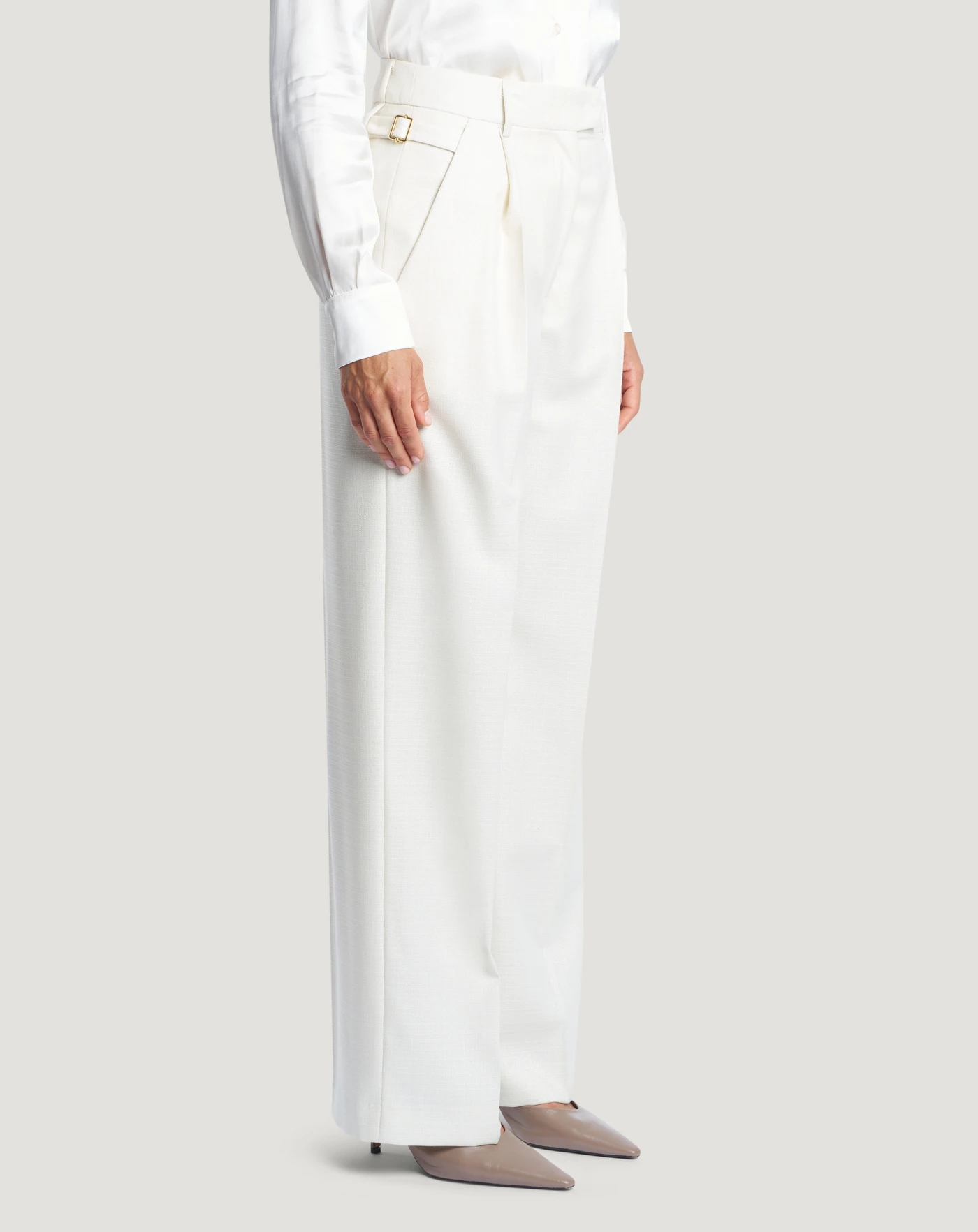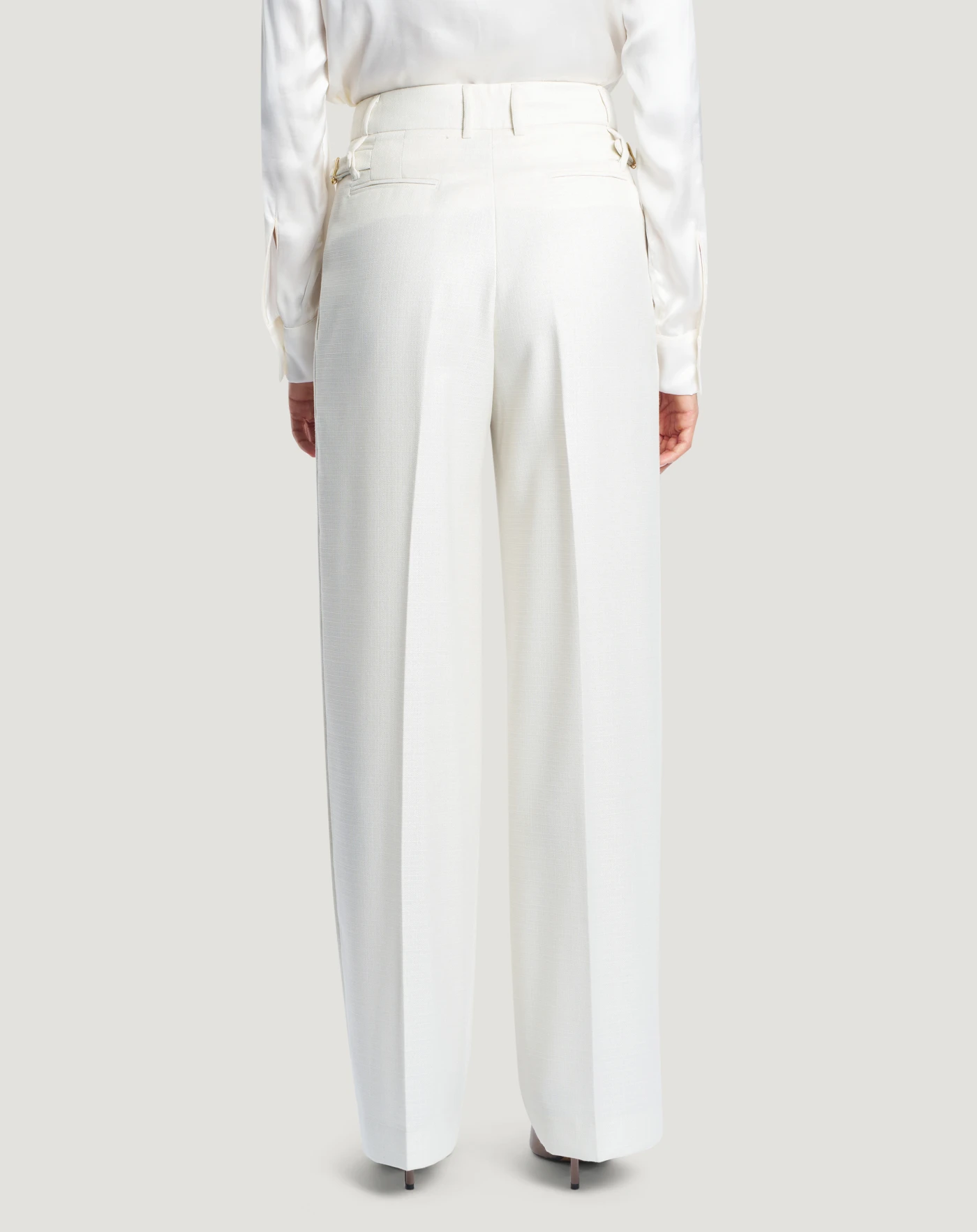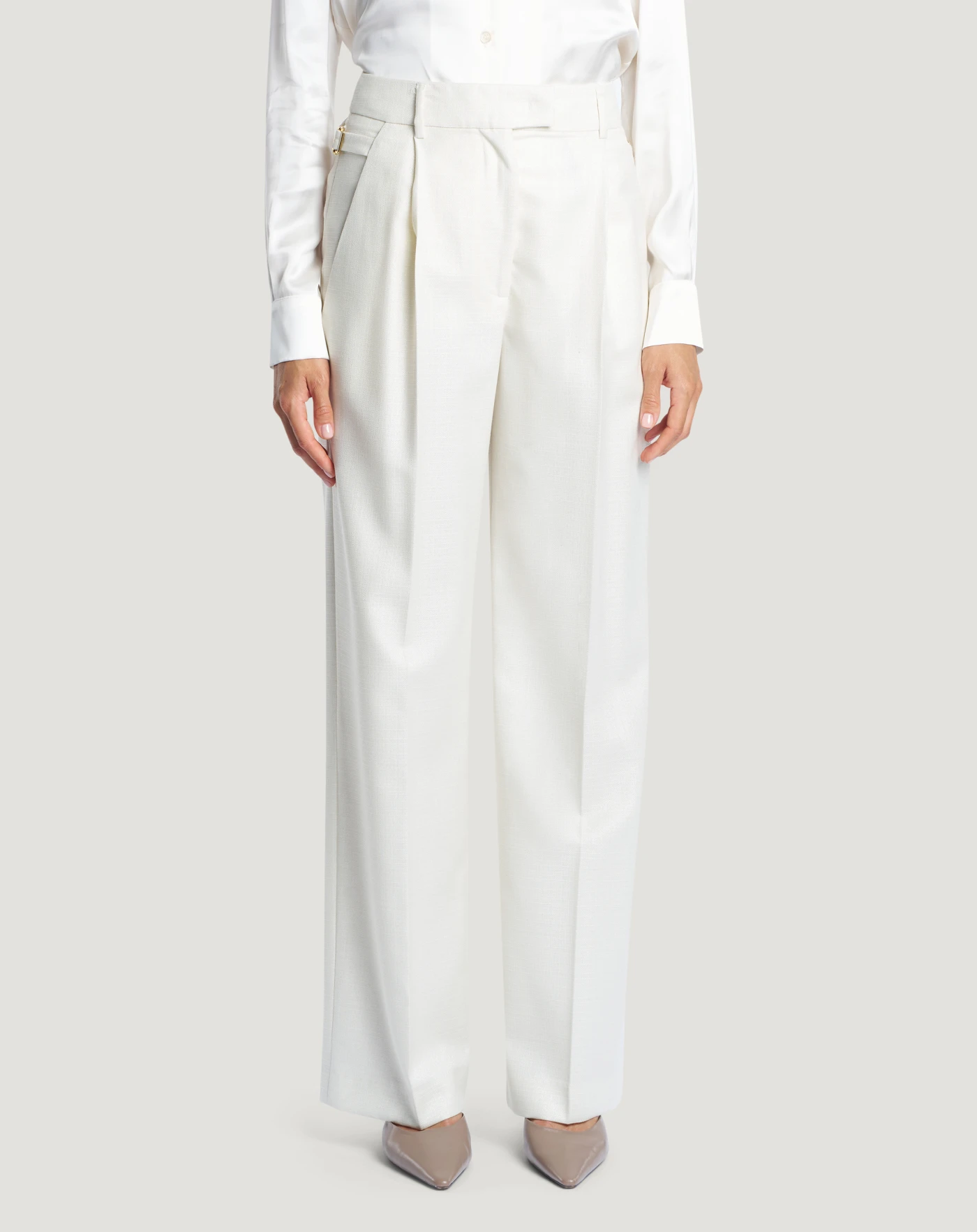 Hose aus Wolle mit Lurex, einem Stoff mit festem Griff und edler Struktur, der durch zarte metallische Reflexe akzentuiert wird.Das Modell mit normaler Passform, hohem Bund und seitlichen Schnallen aus Metall strahlt eine vielseitige, lässige Eleganz aus.