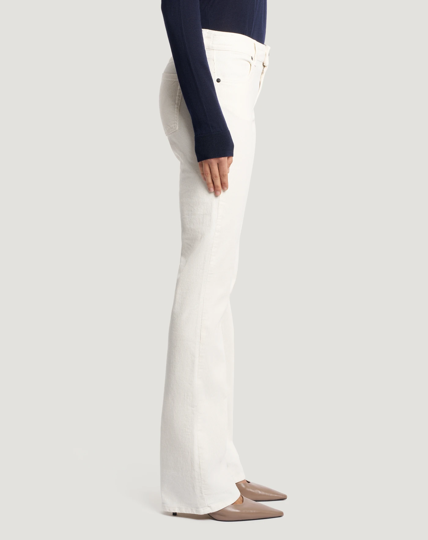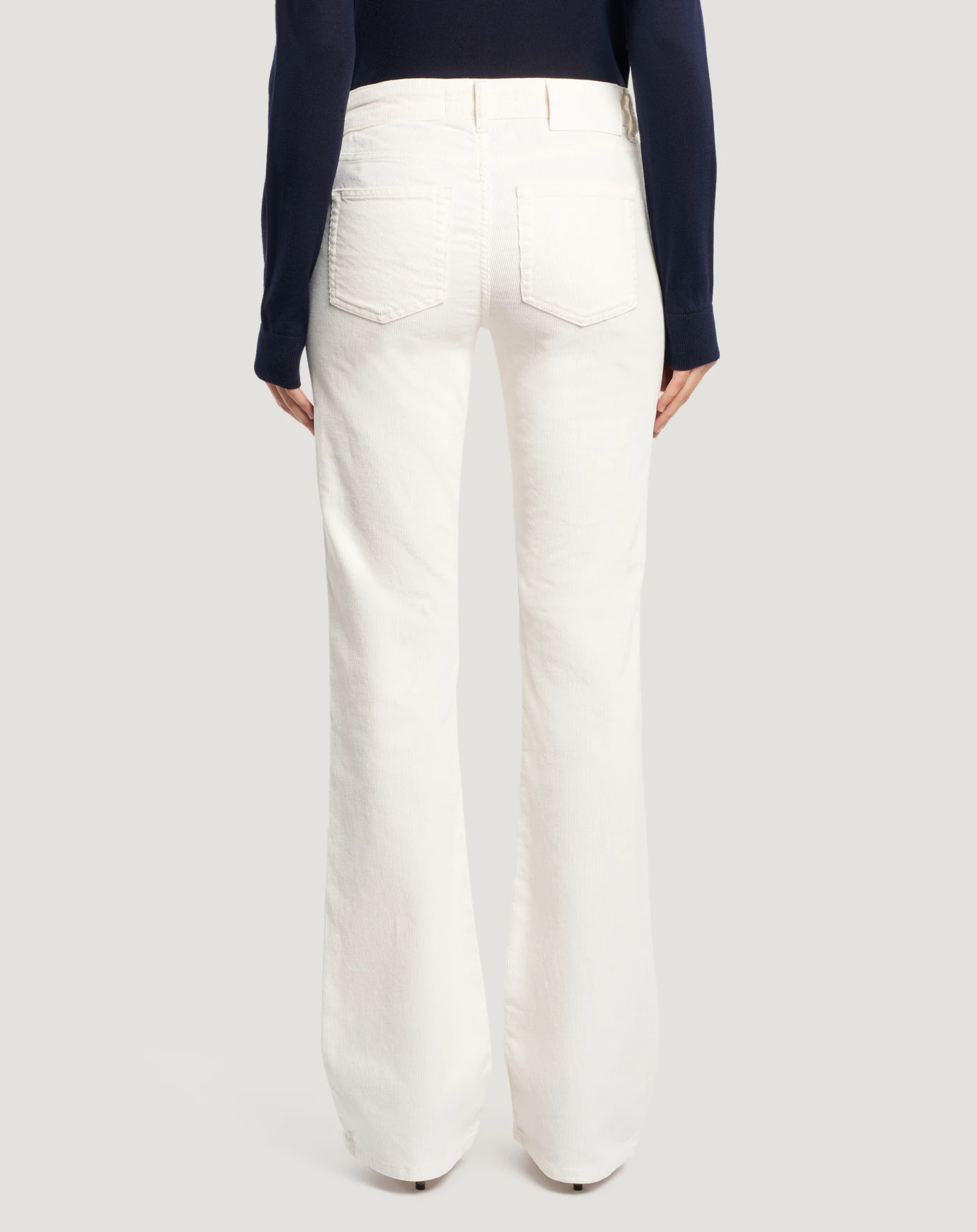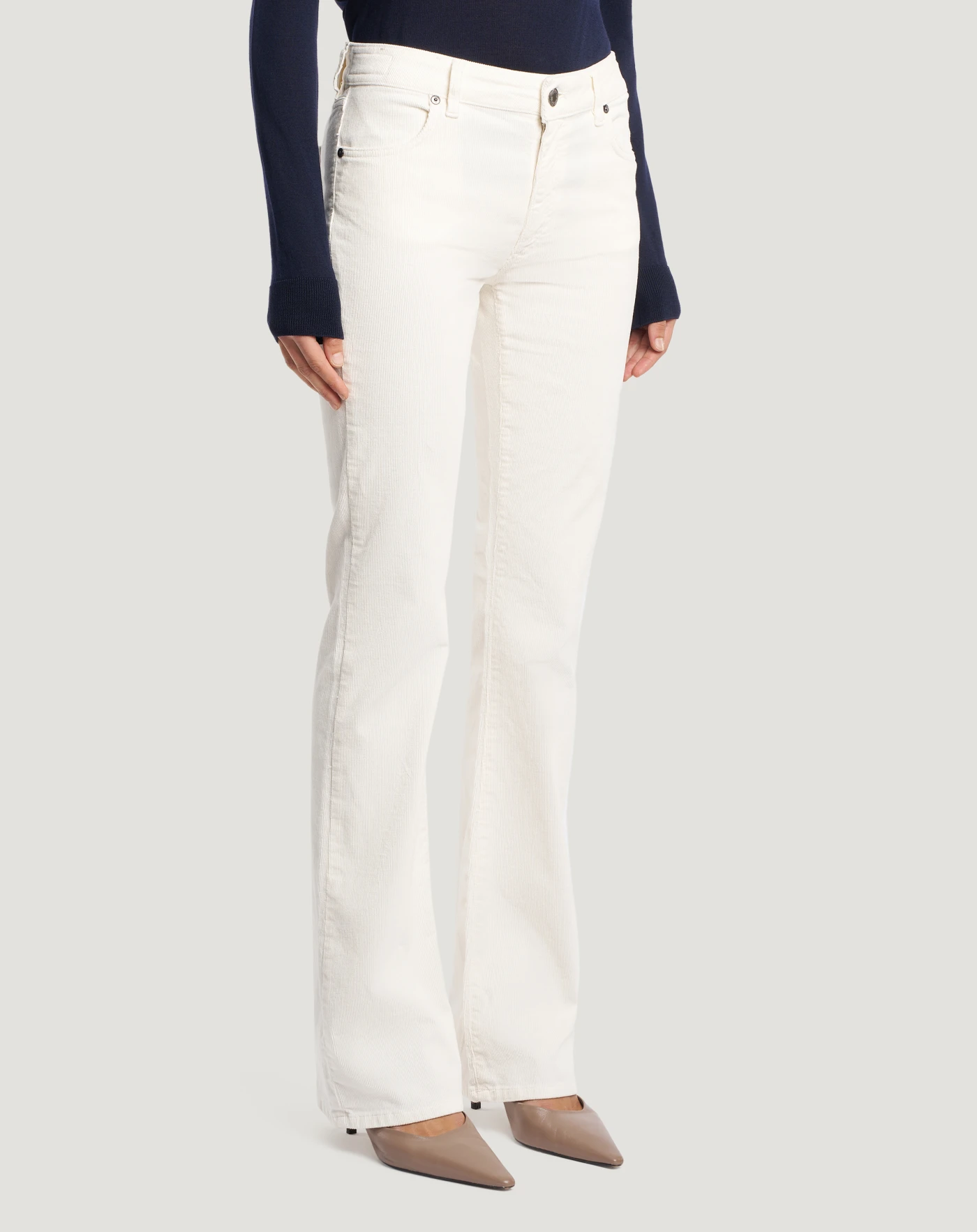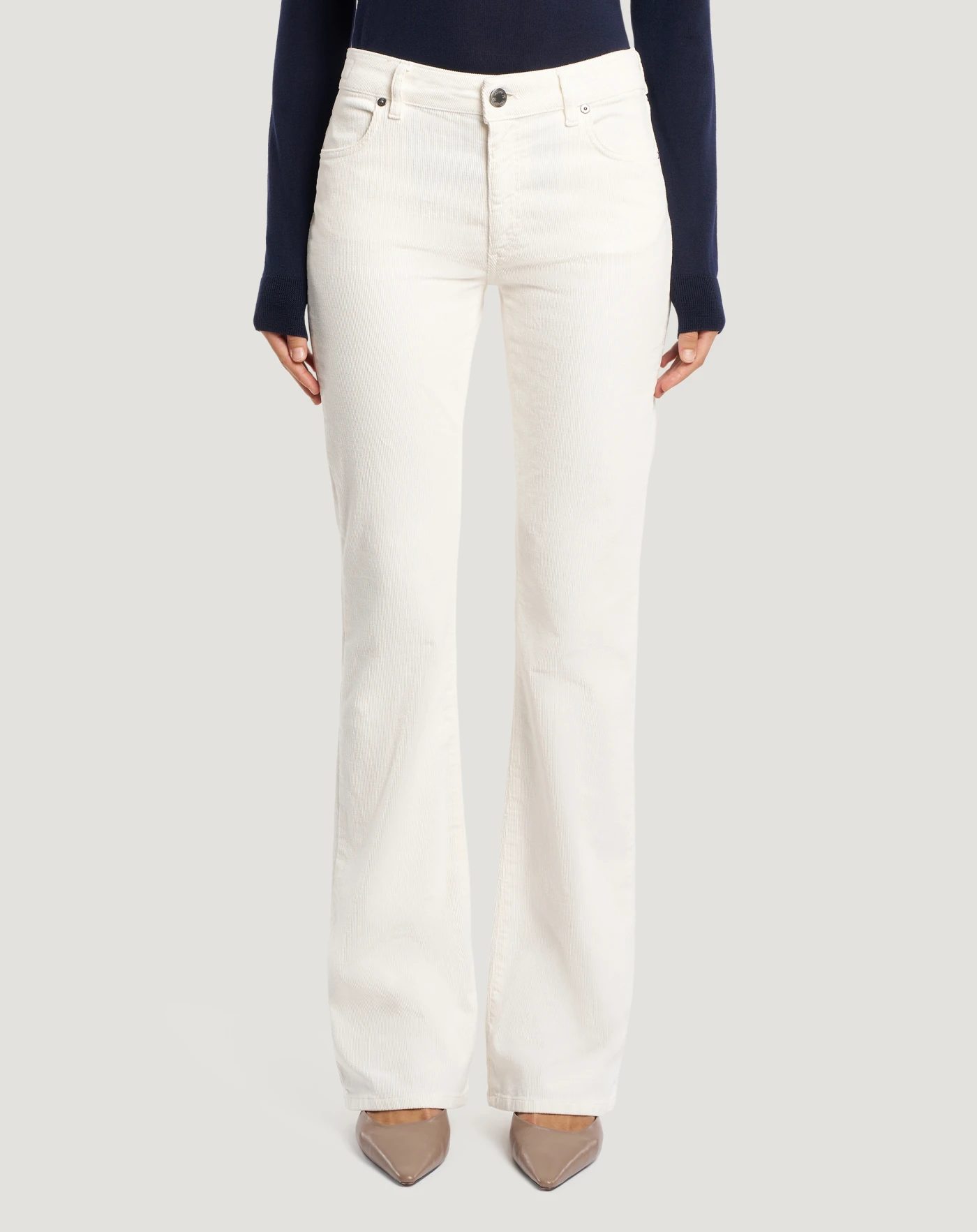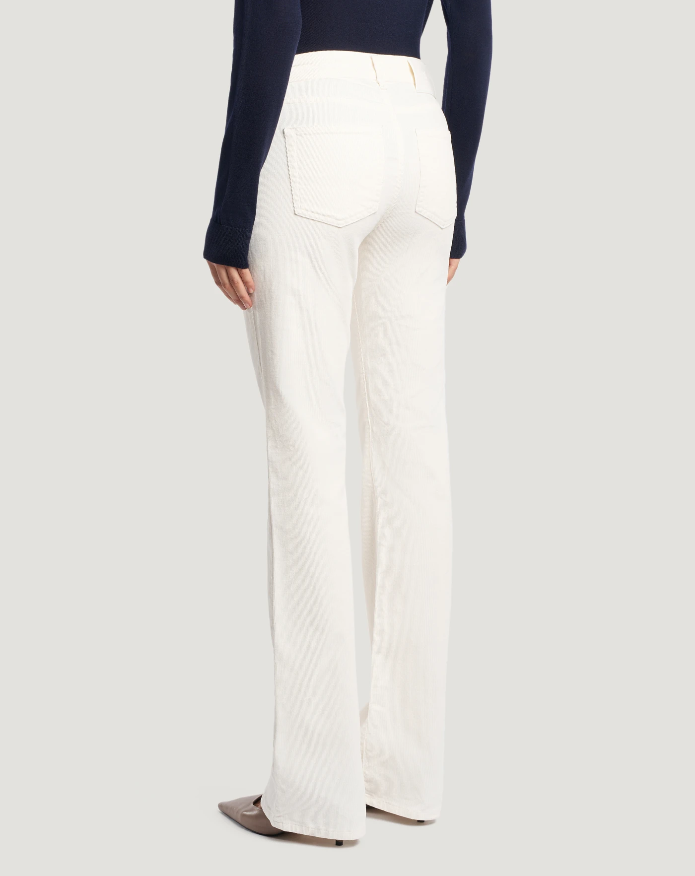 Hose aus Stretch-Baumwollsamt mit feiner Rippstruktur, die bequem und warm ist und perfekt für die Jahreszeit passt. Das Modell mit normalem Bund und ausgestelltem Schnitt rundet den Look mit einem modernen saloppen Touch ab. Wählen Sie die vielseitige Nuance Weiß, um Business- und Freizeitlooks abzurunden.