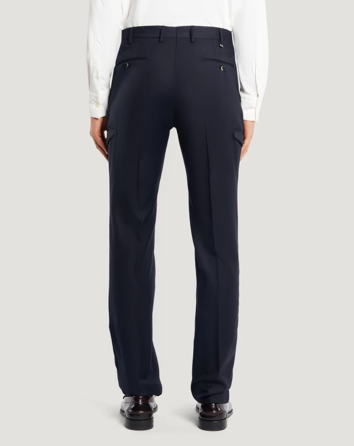 Hose aus elastischem Wolltwill, einem strukturierten und zugleich bequemen Stoff, ideal für Kleidungsstücke mit markantem Schnitt und Couture-Ästhetik.Das Modell wird ungesäumt geliefert und kann auf Wunsch in einfacher Handarbeit abgeändert werden, um Ihren Wünschen in Bezug auf Länge und Stil gerecht zu werden.Eine Neuinterpretation der klassischen Cargohose mit einem raffinierten Couture-Touch.
