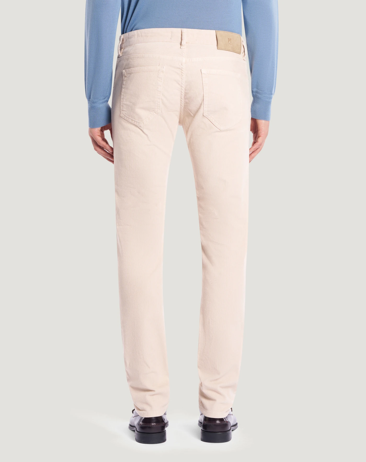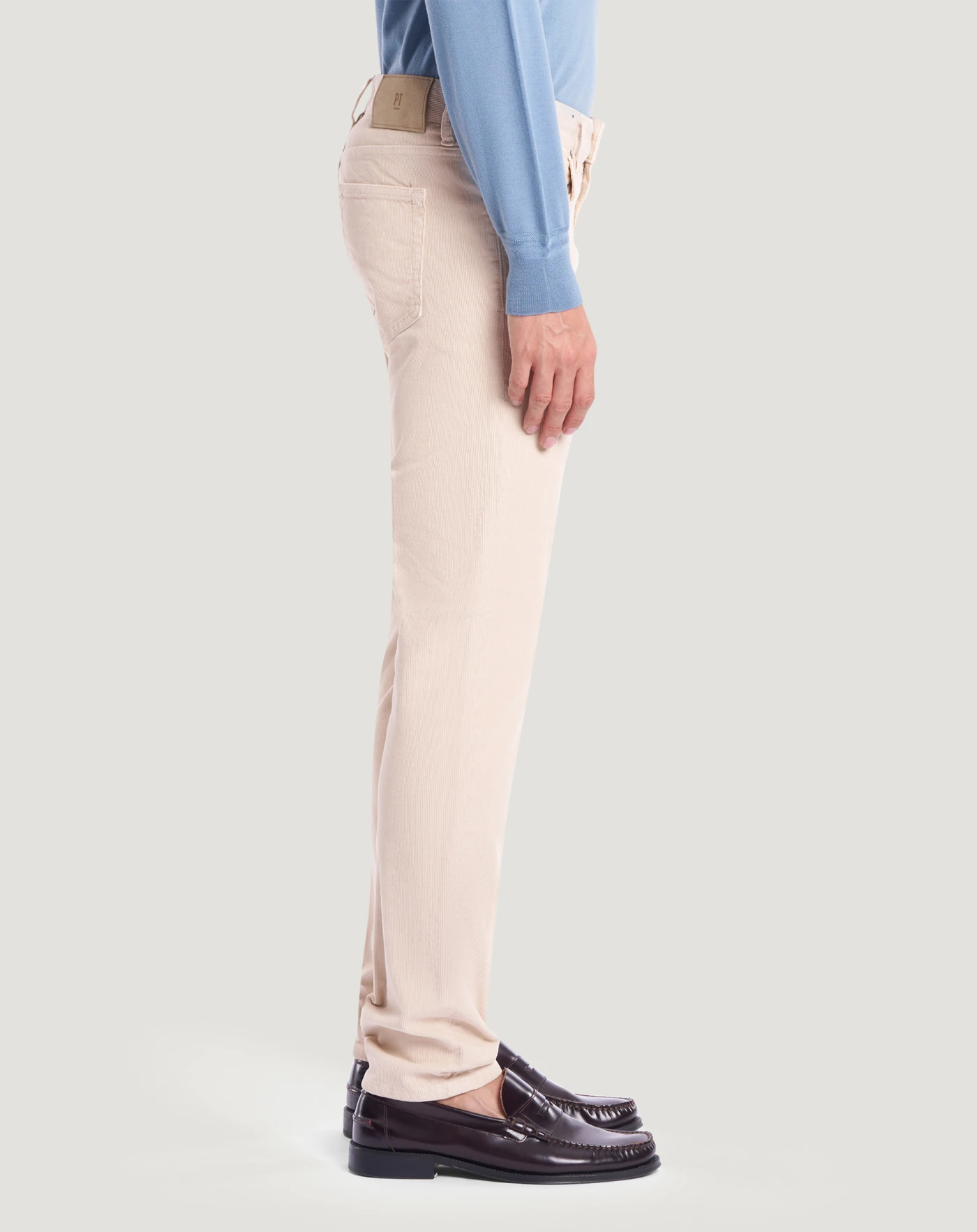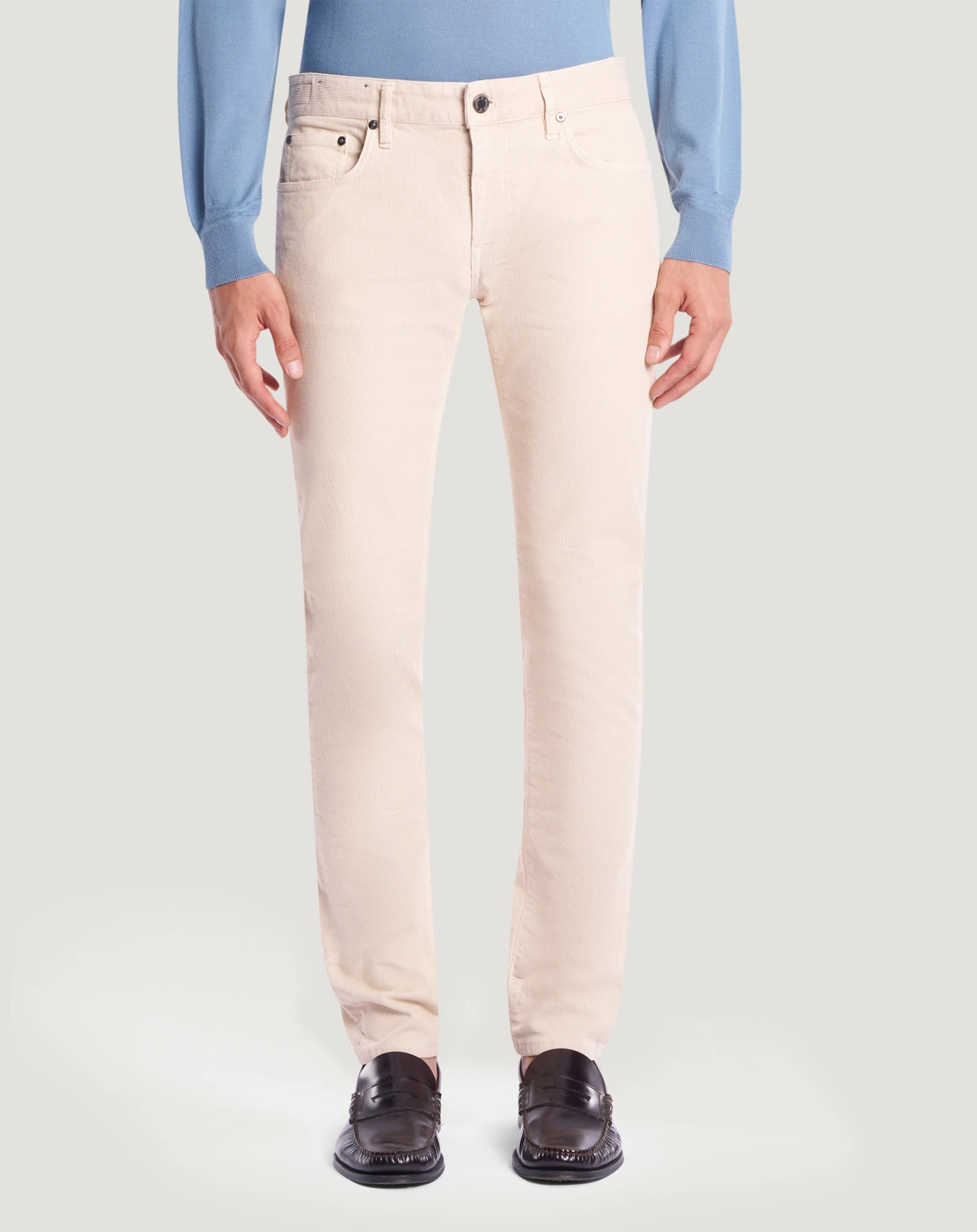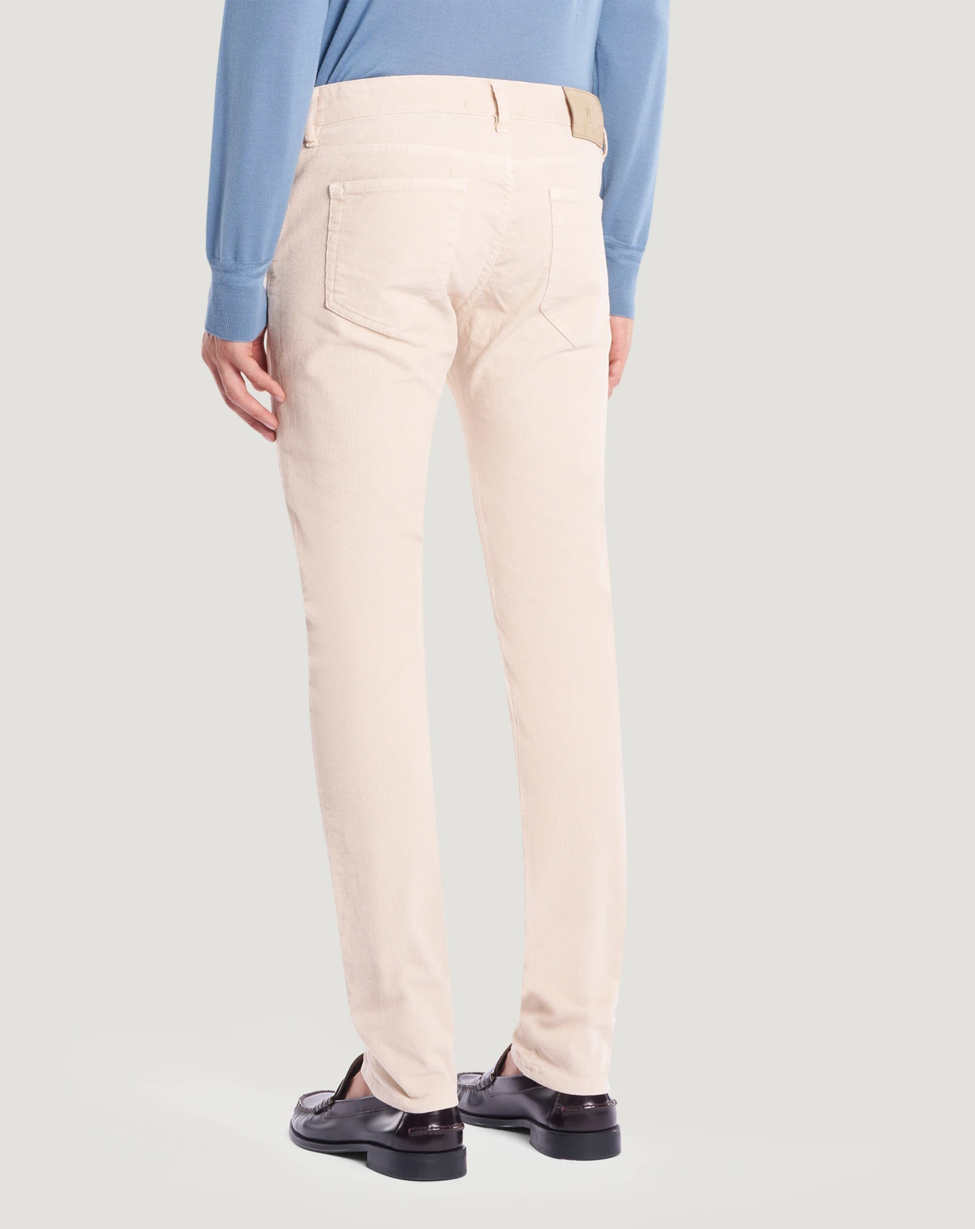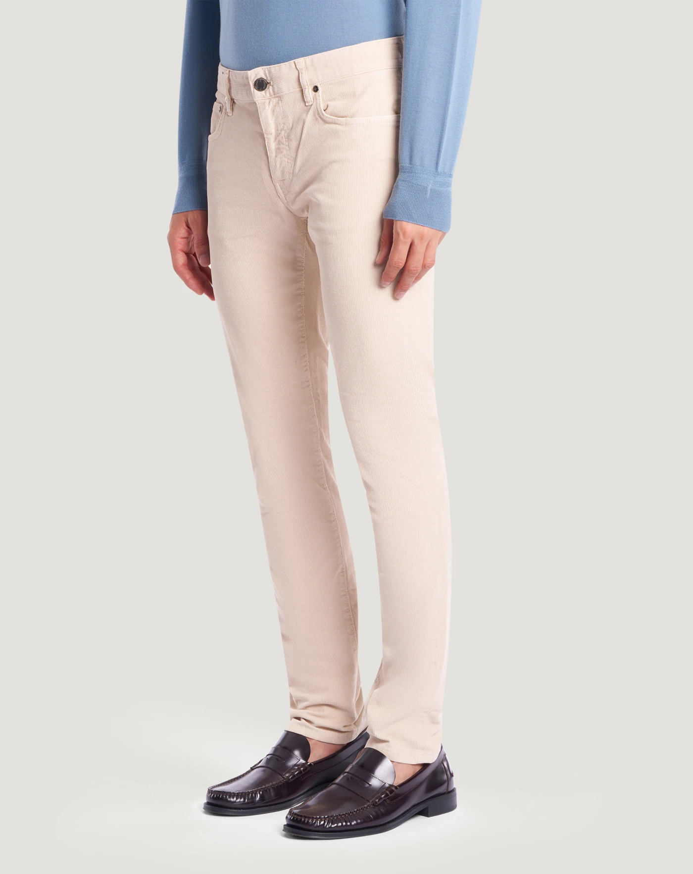 Hose aus Stretch-Baumwollsamt mit feiner Rippstruktur, die bequem und warm ist und perfekt für die Jahreszeit passt. Das Five-Pocket-Modell in super schmaler Passform mit normalem Bund lässt sich in der Variante Wollweiß zu eleganten und bequemen Outfits kombinieren.