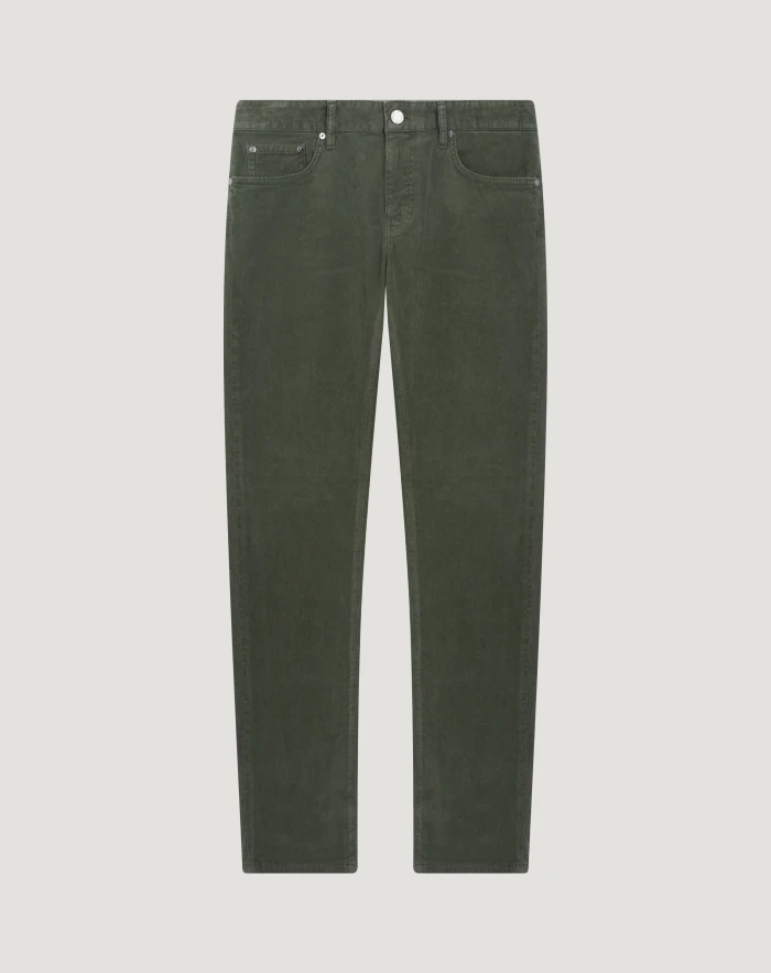 Hose aus Stretch-Baumwollsamt mit feiner Rippstruktur, die bequem und warm ist und perfekt für die Jahreszeit passt. Das Five-Pocket-Modell in super schmaler Passform mit normalem Bund verleiht in der Nuance Olivgrün Casual- und Freizeit-Looks einen modernen Touch.