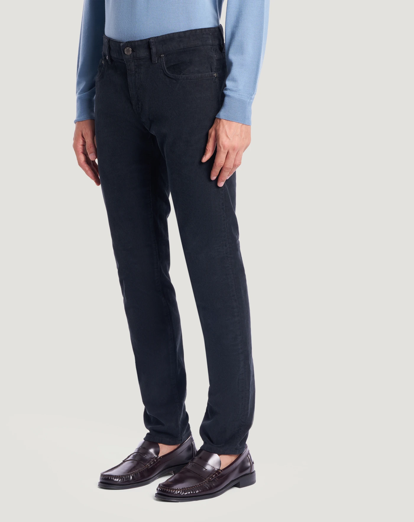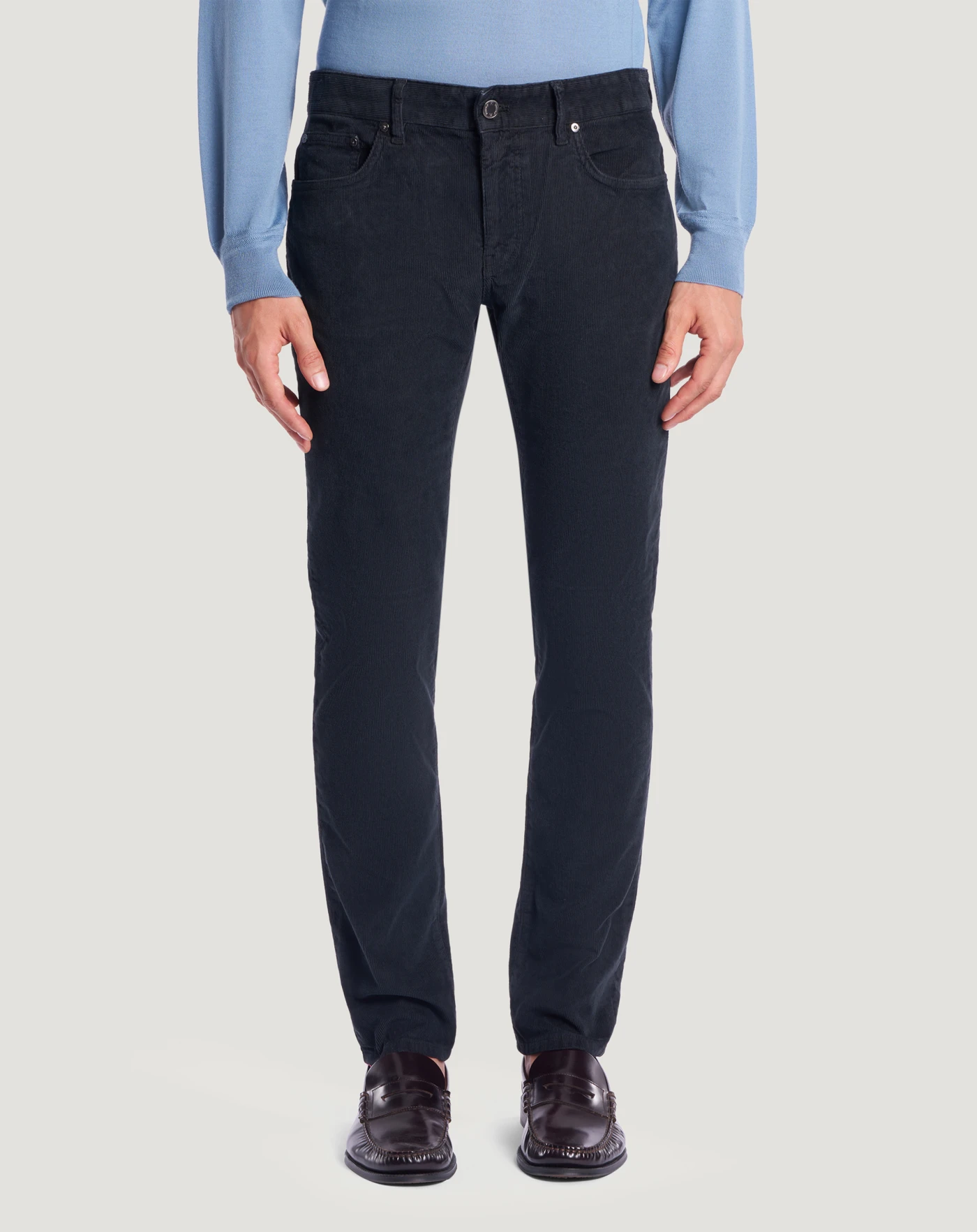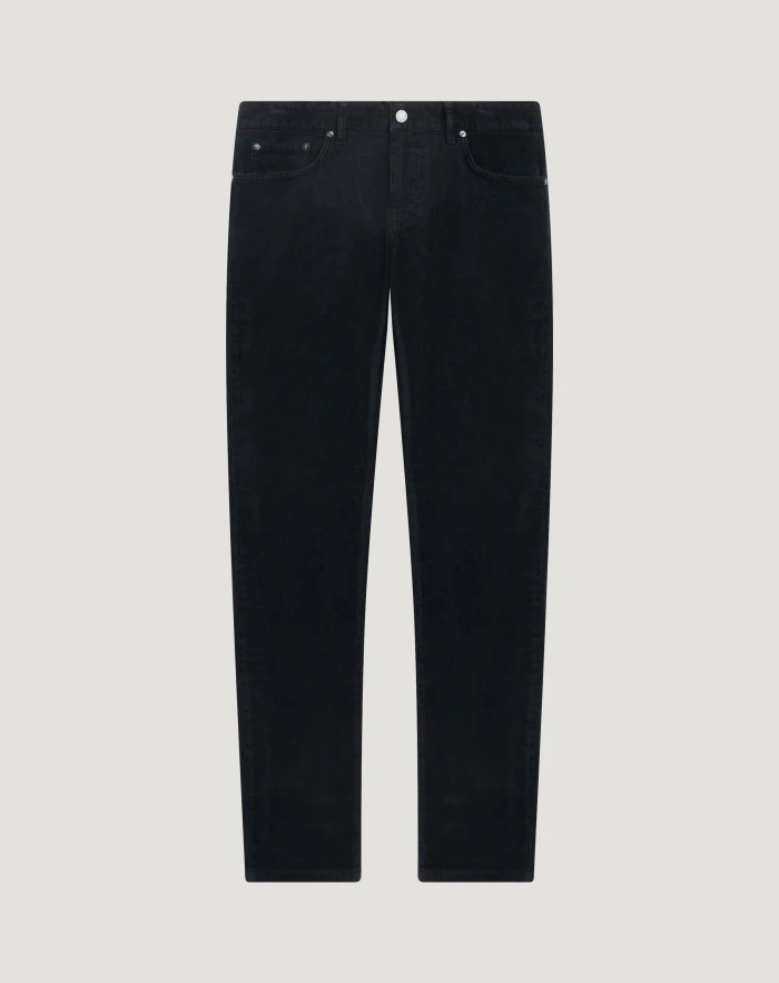 Hose aus Stretch-Baumwollsamt mit feiner Rippstruktur, die bequem und warm ist und perfekt für die Jahreszeit passt. Das Five-Pocket-Modell in super schmaler Passform mit normalem Bund ist in der Variante Schwarz ein vielseitiges Kleidungsstück für die Freizeit und darüber hinaus.
