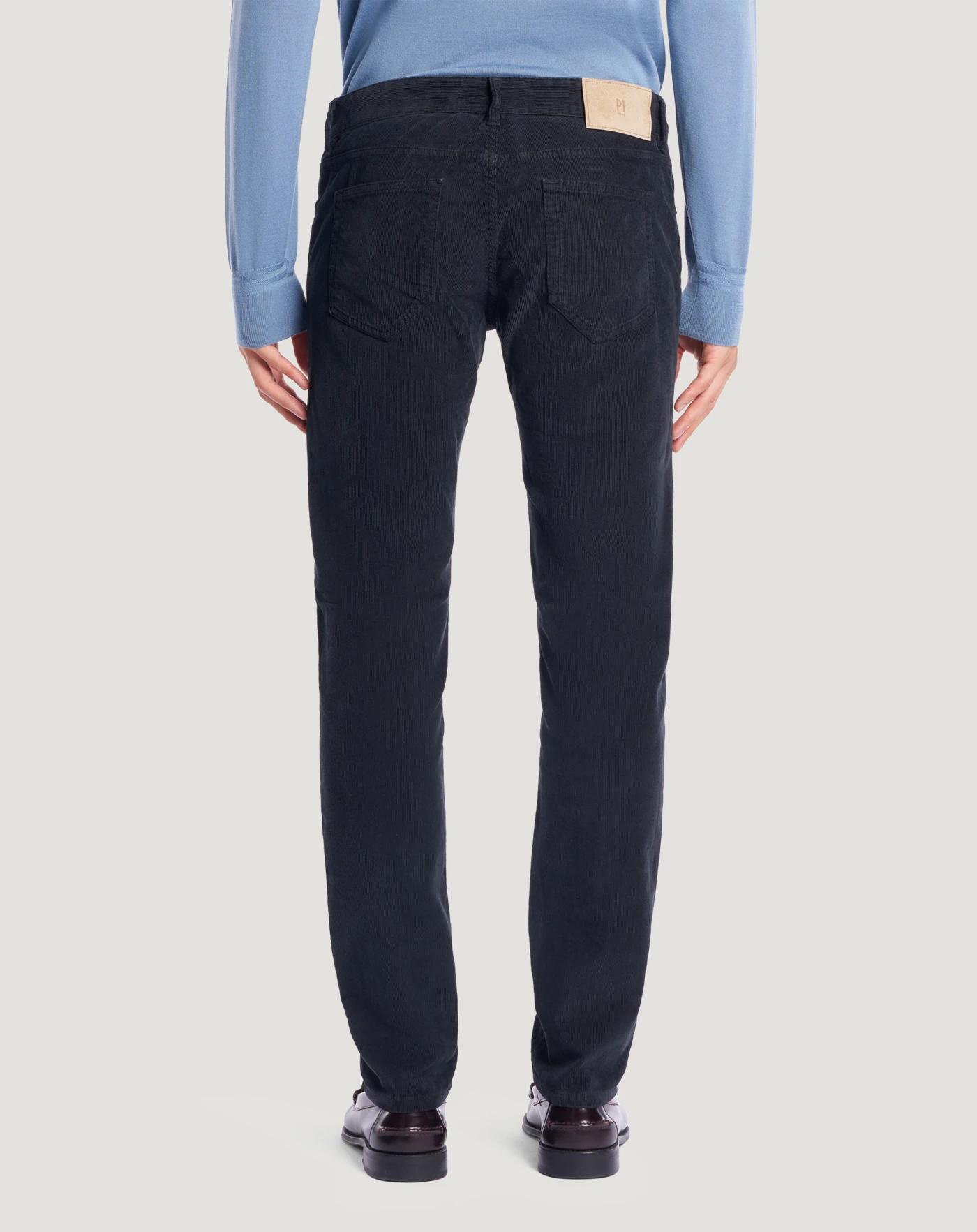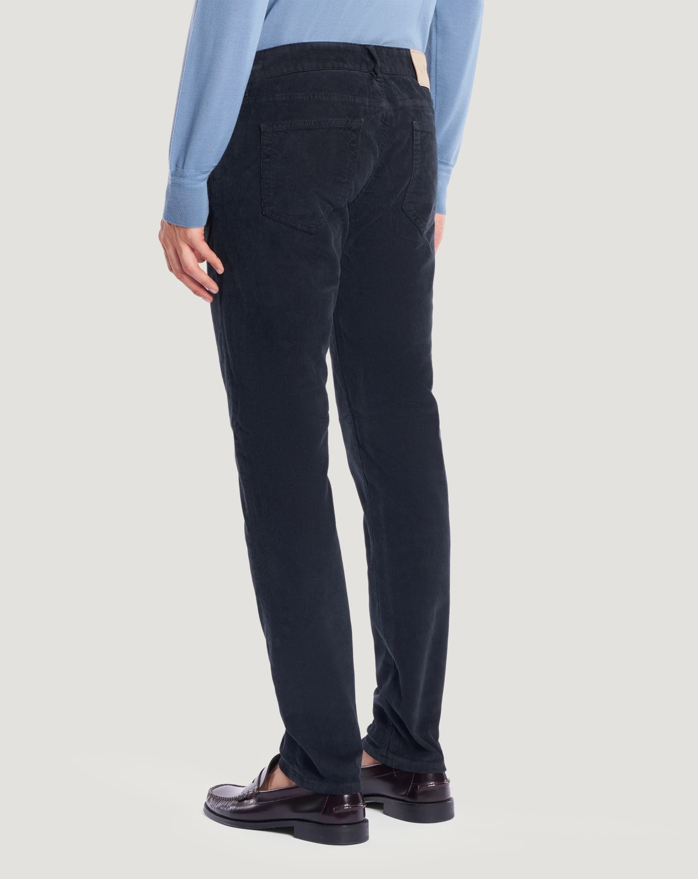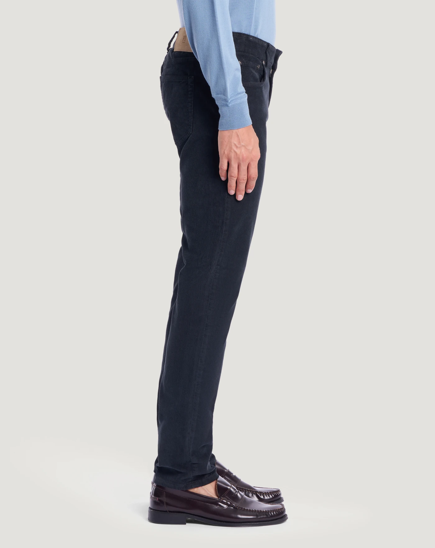 Hose aus Stretch-Baumwollsamt mit feiner Rippstruktur, die bequem und warm ist und perfekt für die Jahreszeit passt. Das Five-Pocket-Modell in super schmaler Passform mit normalem Bund ist in der Variante Schwarz ein vielseitiges Kleidungsstück für die Freizeit und darüber hinaus.
