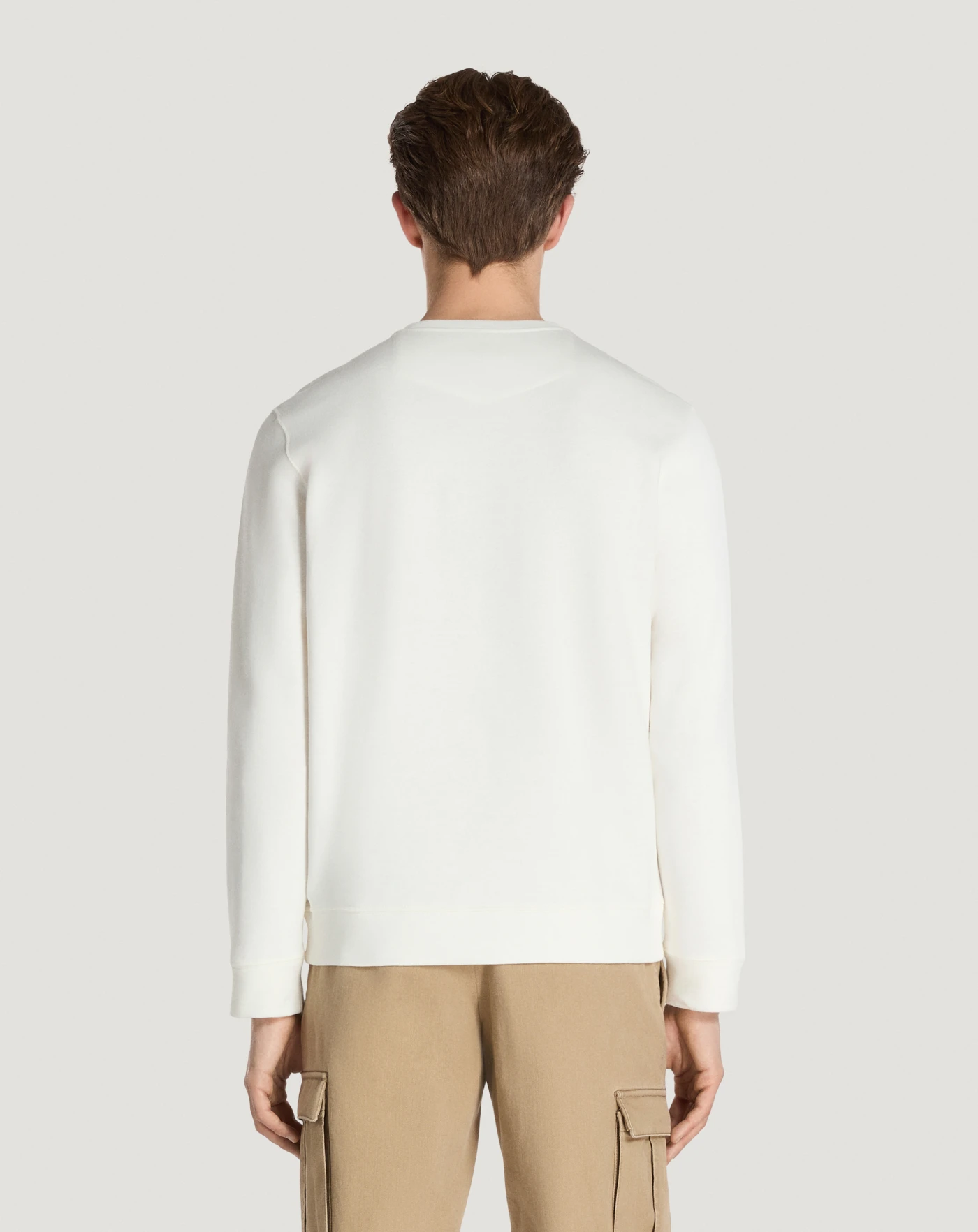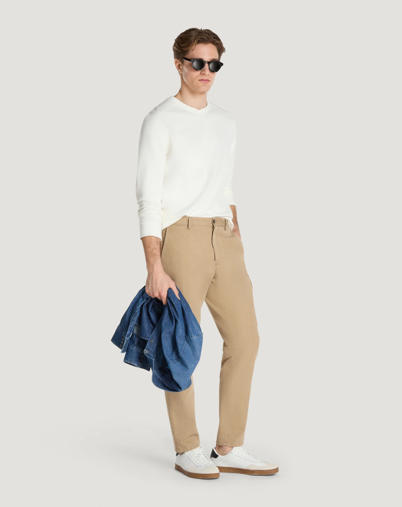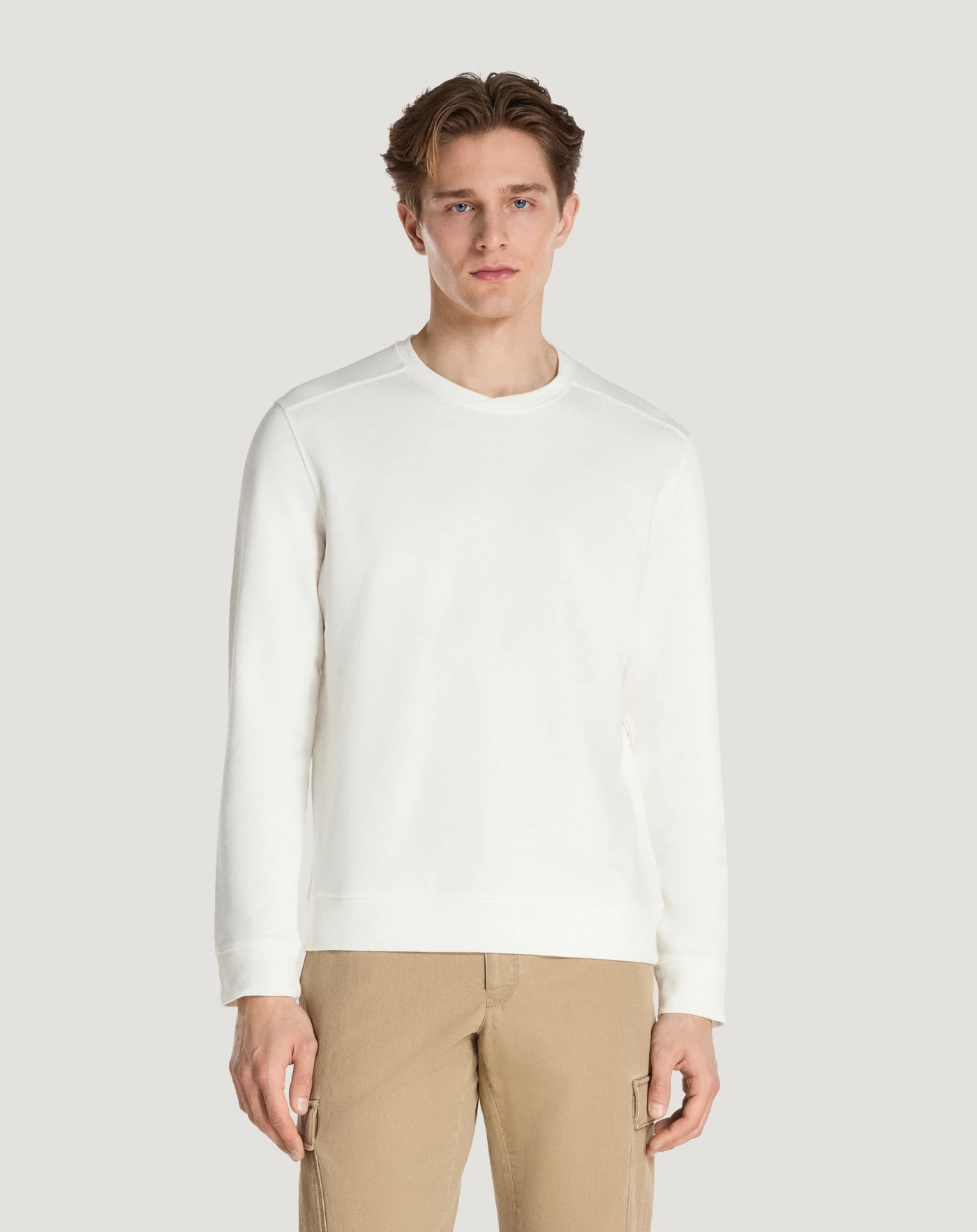 Pullover aus Baumwoll- und Leinenjersey, einem atmungsaktiven, frischen und bequemen Gewebe, perfekt für die Saison.Das schmal geschnittene Modell mit Rundhalsausschnitt ist bequem und vielseitig und lässt sich alleine oder unter der Jacke tragen.