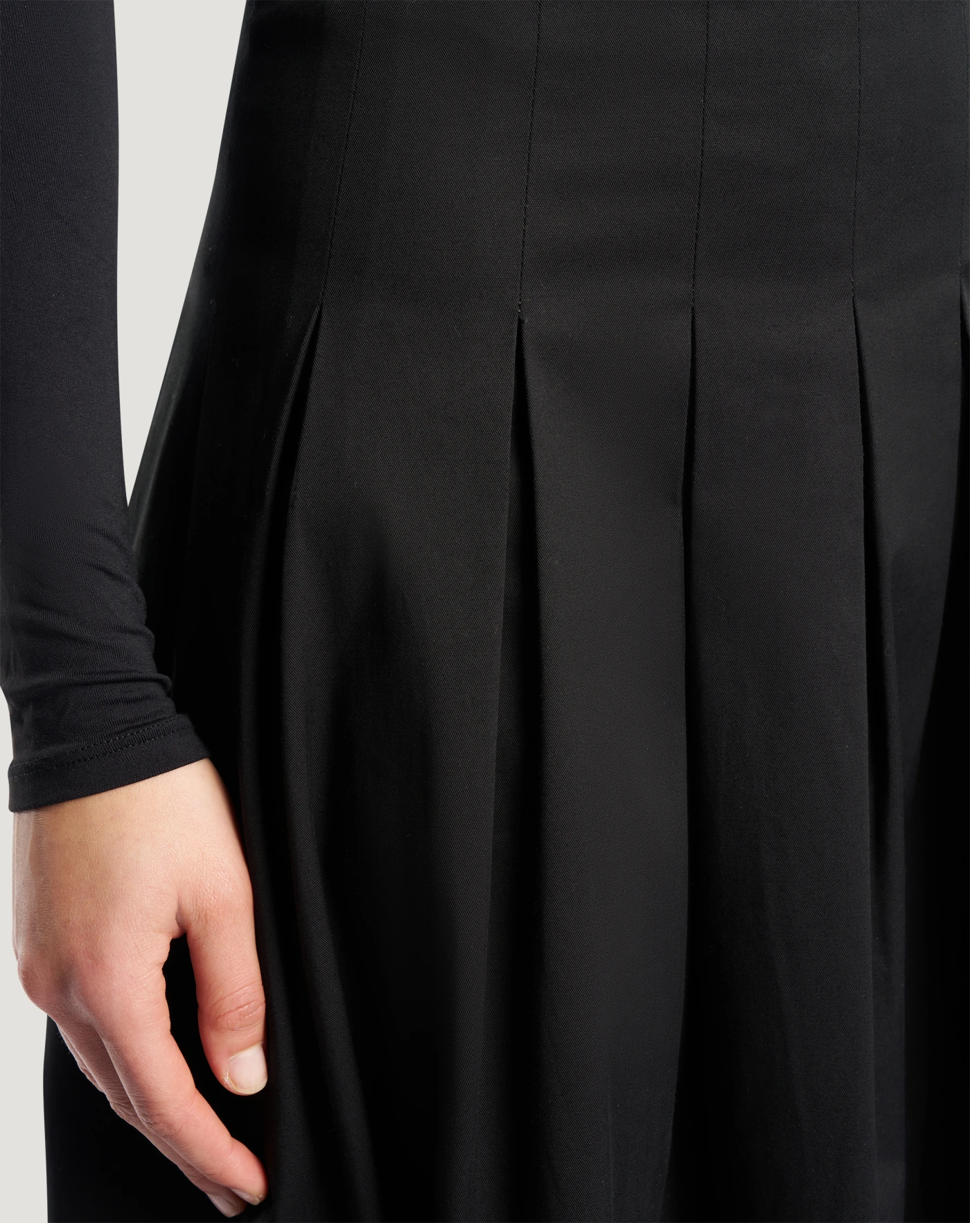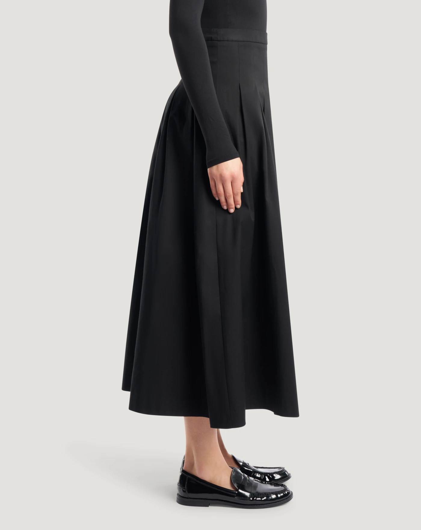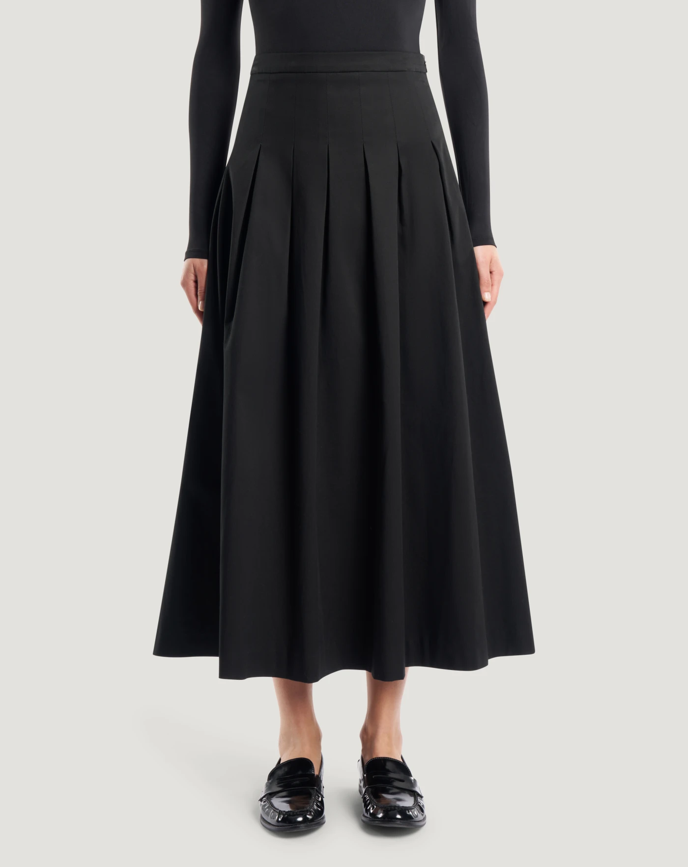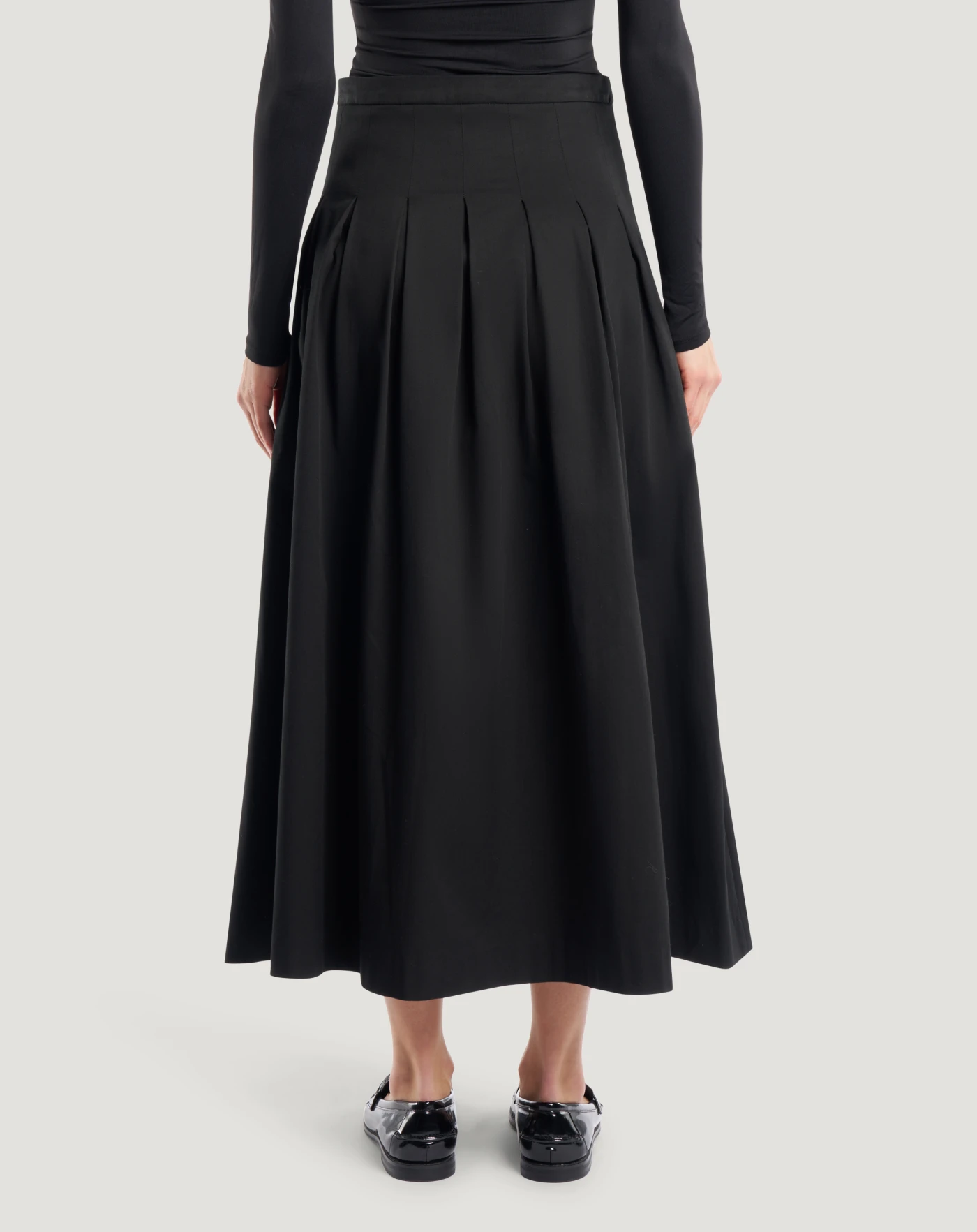 Rock aus Stretch-Baumwollgabardine, einem unkomplizierten Stoff, perfekt für vielseitige Looks durch seinen klaren und modernen Stil. Mit gesteppten Falten, die für Bewegung sorgen, verleiht es dem Stil einen dynamischen Twist.