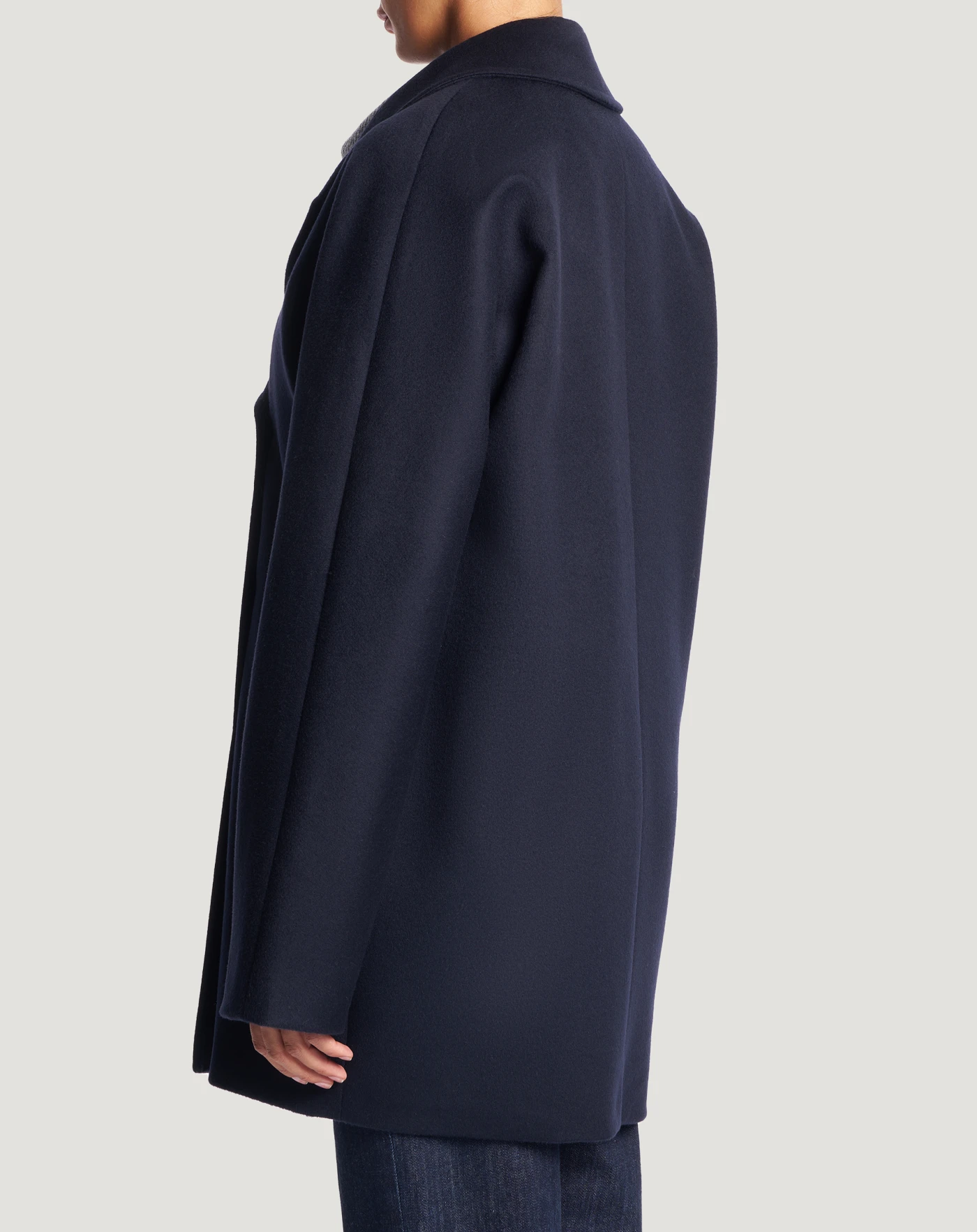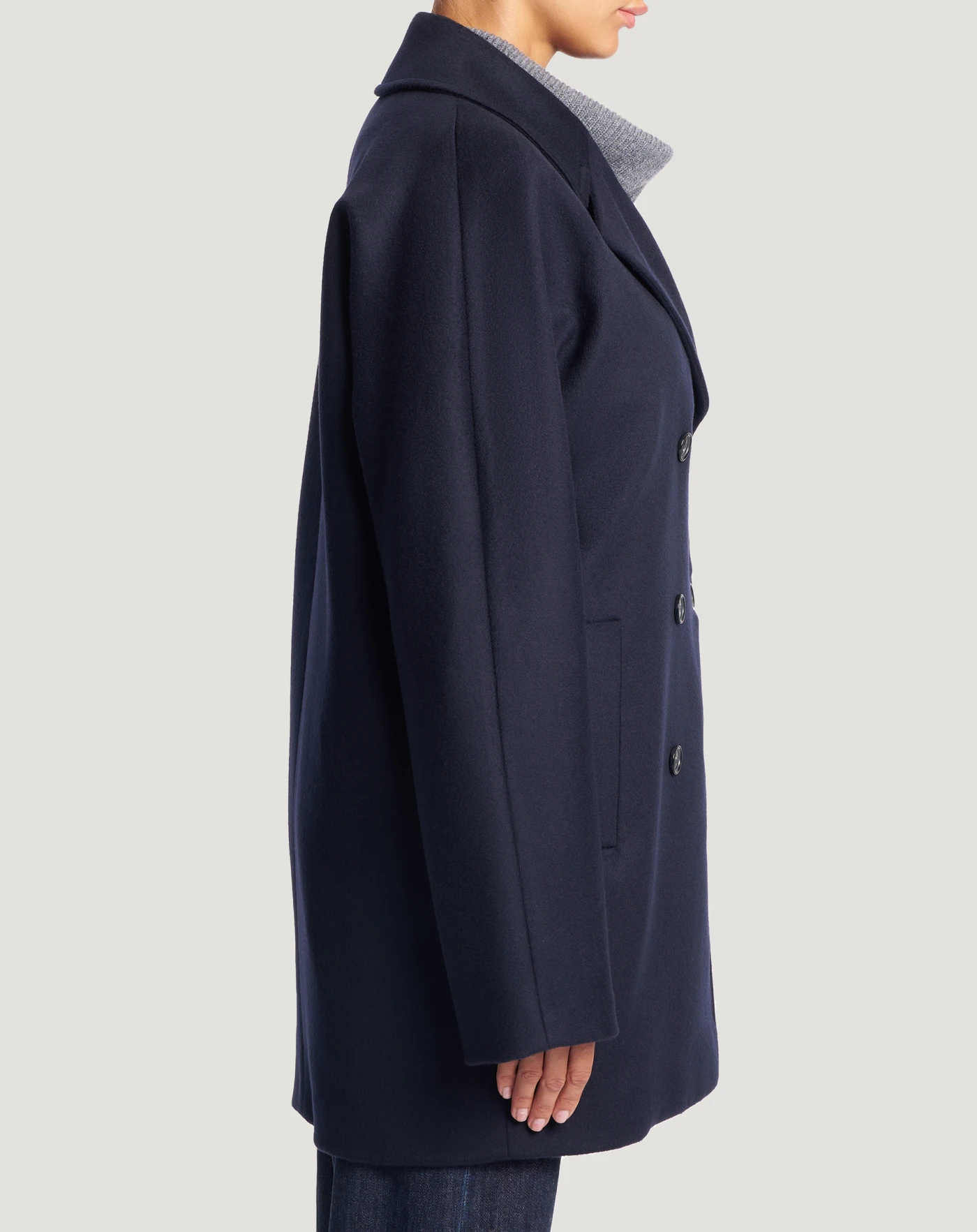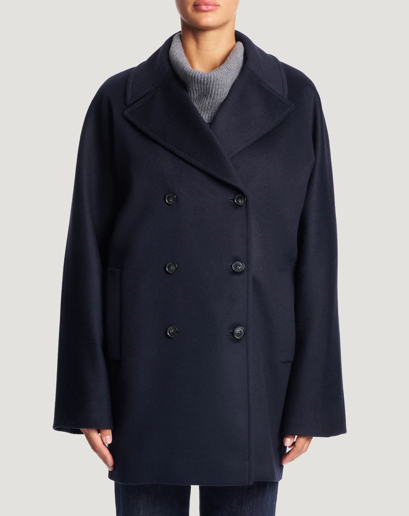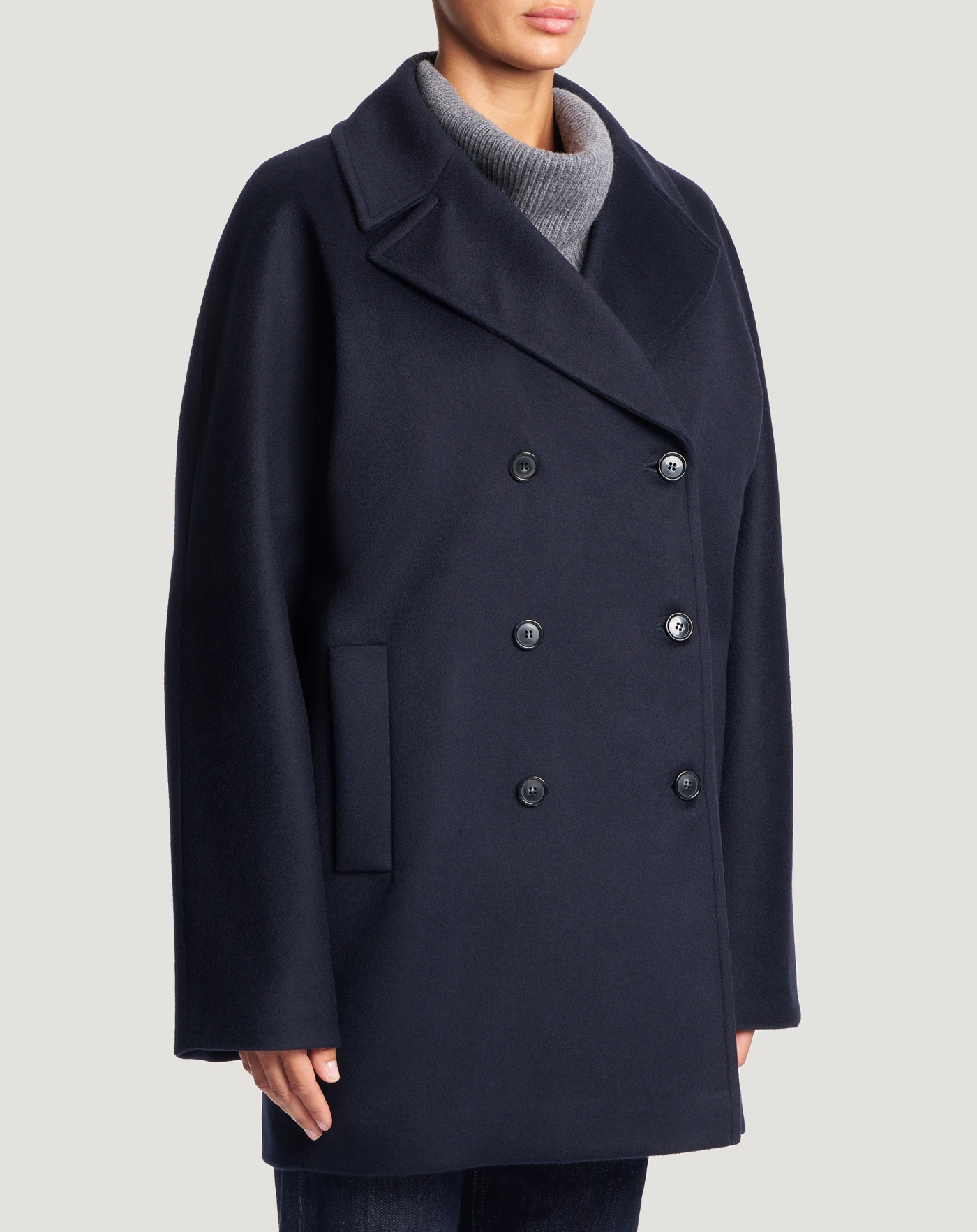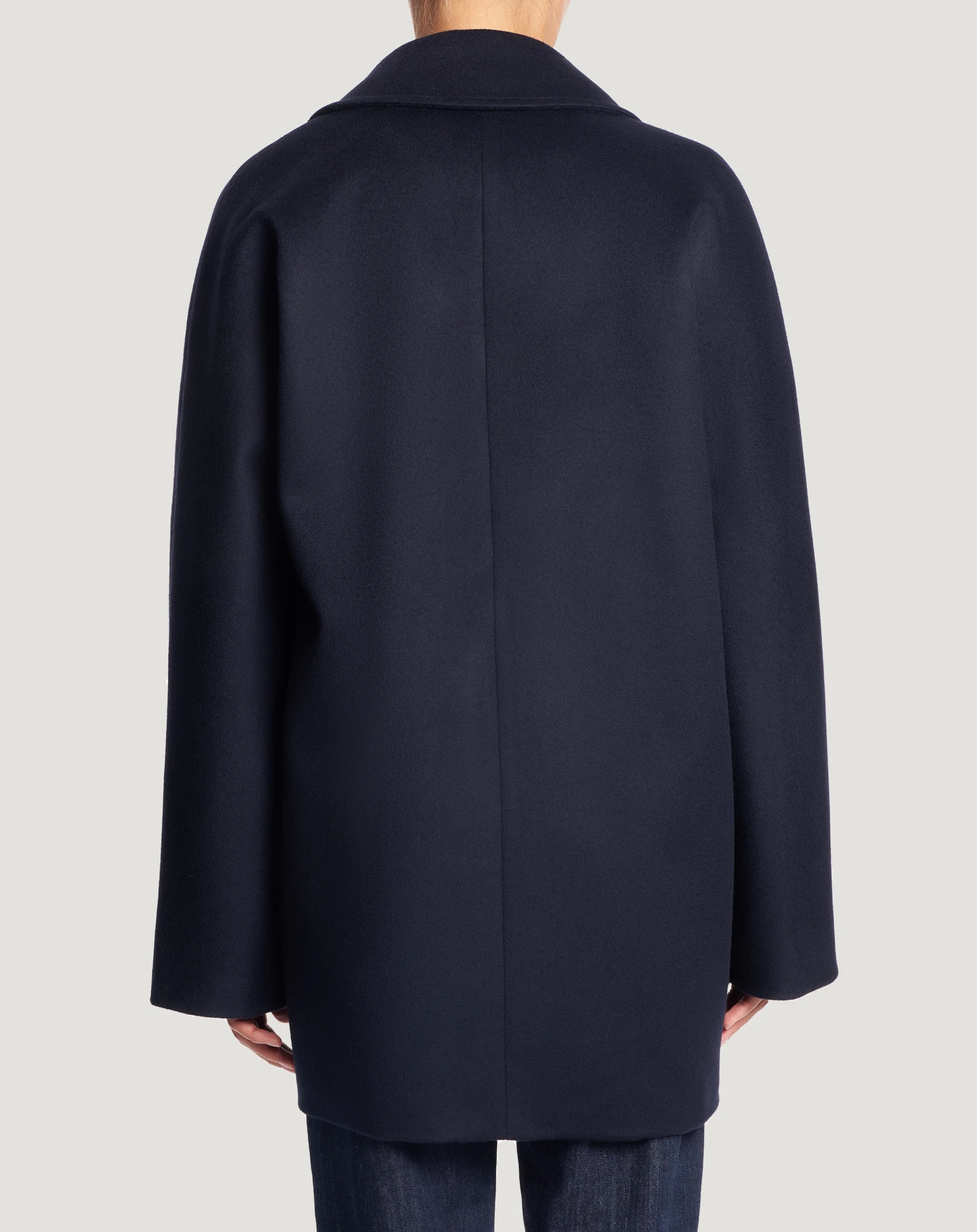 Coat in wool and cashmere drap, a fine, warm and comfortable fabric.Double-breasted kimono-style cut with large lapels and a versatile, stand-out city look.