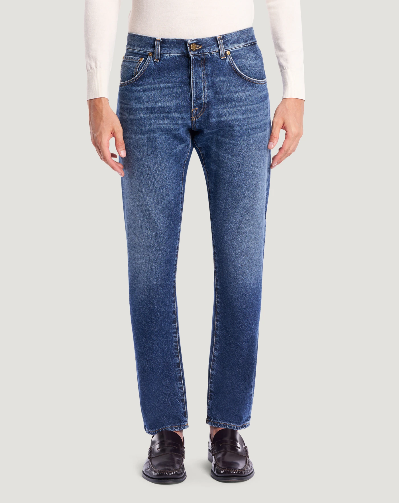 Jeans in cotton denim, a firm, comfortable and durable fabric (11.5 oz) with a wash featuring whiskering and localised fading.With five pockets and a regular fit, they are the ideal model to combine with a myriad of casual looks.