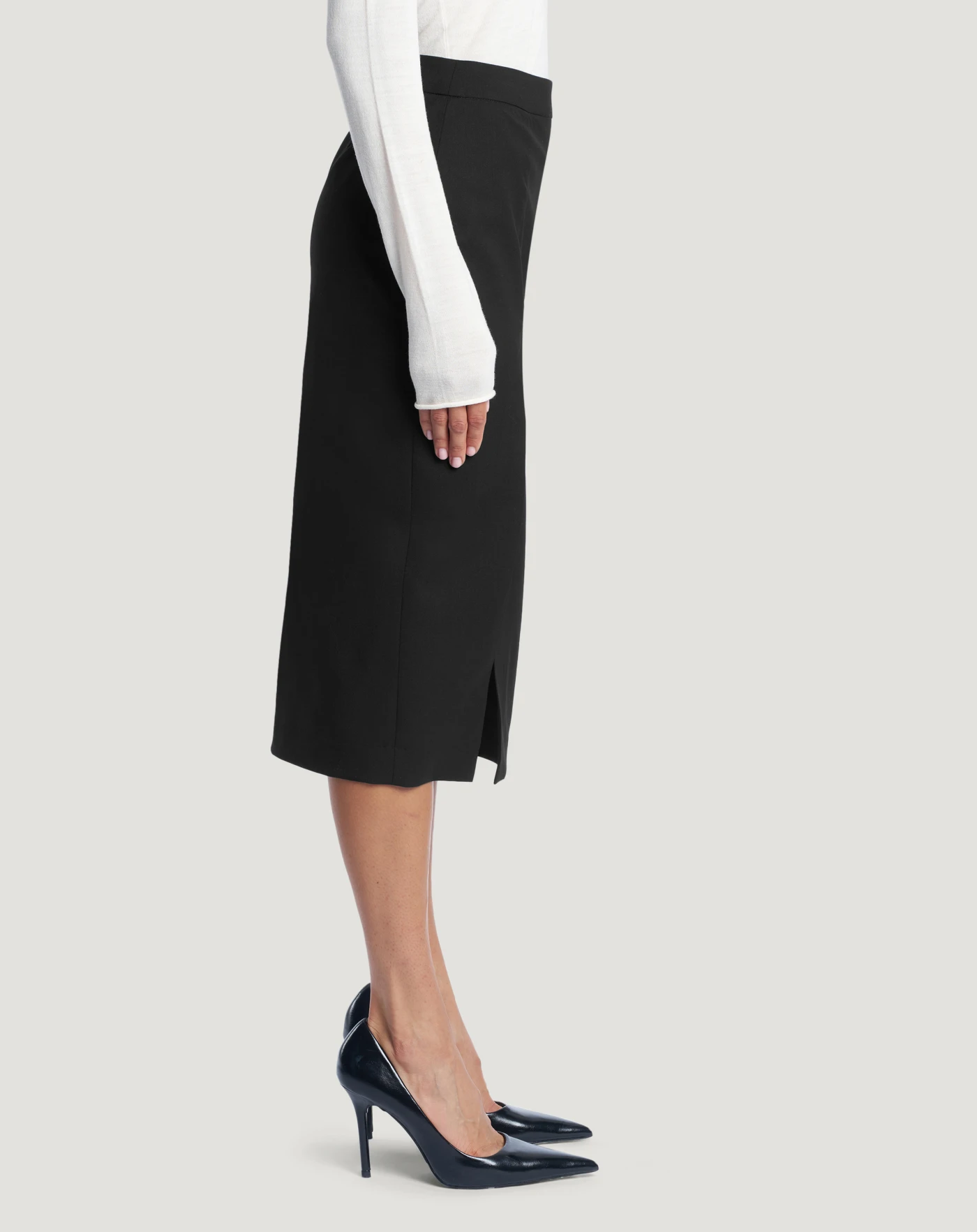 Skirt in bi-stretch batavia wool, a fabric distinguished by a stretch weave that adapts to body movements, ensuring an elegant yet comfortable and lightweight look.With a high waist and side slit, the black variant will be perfect to complete an outfit for a special occasion. Wear them with a matching jacket.
