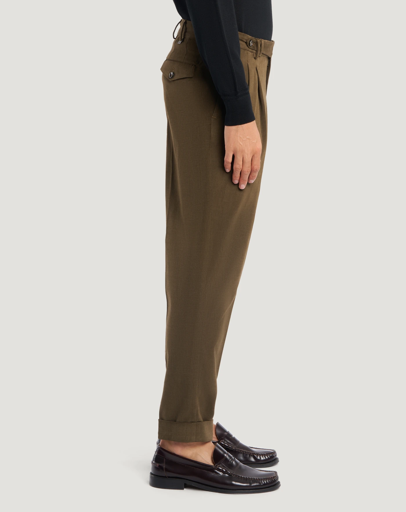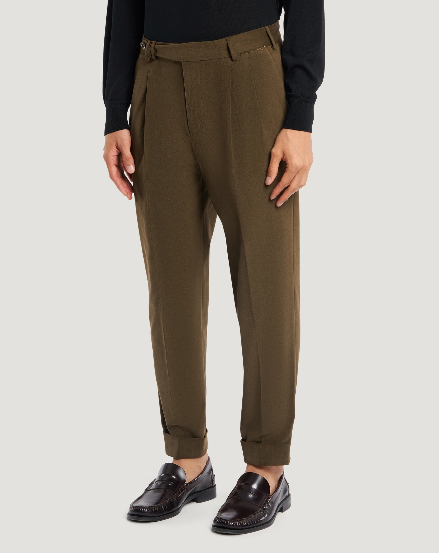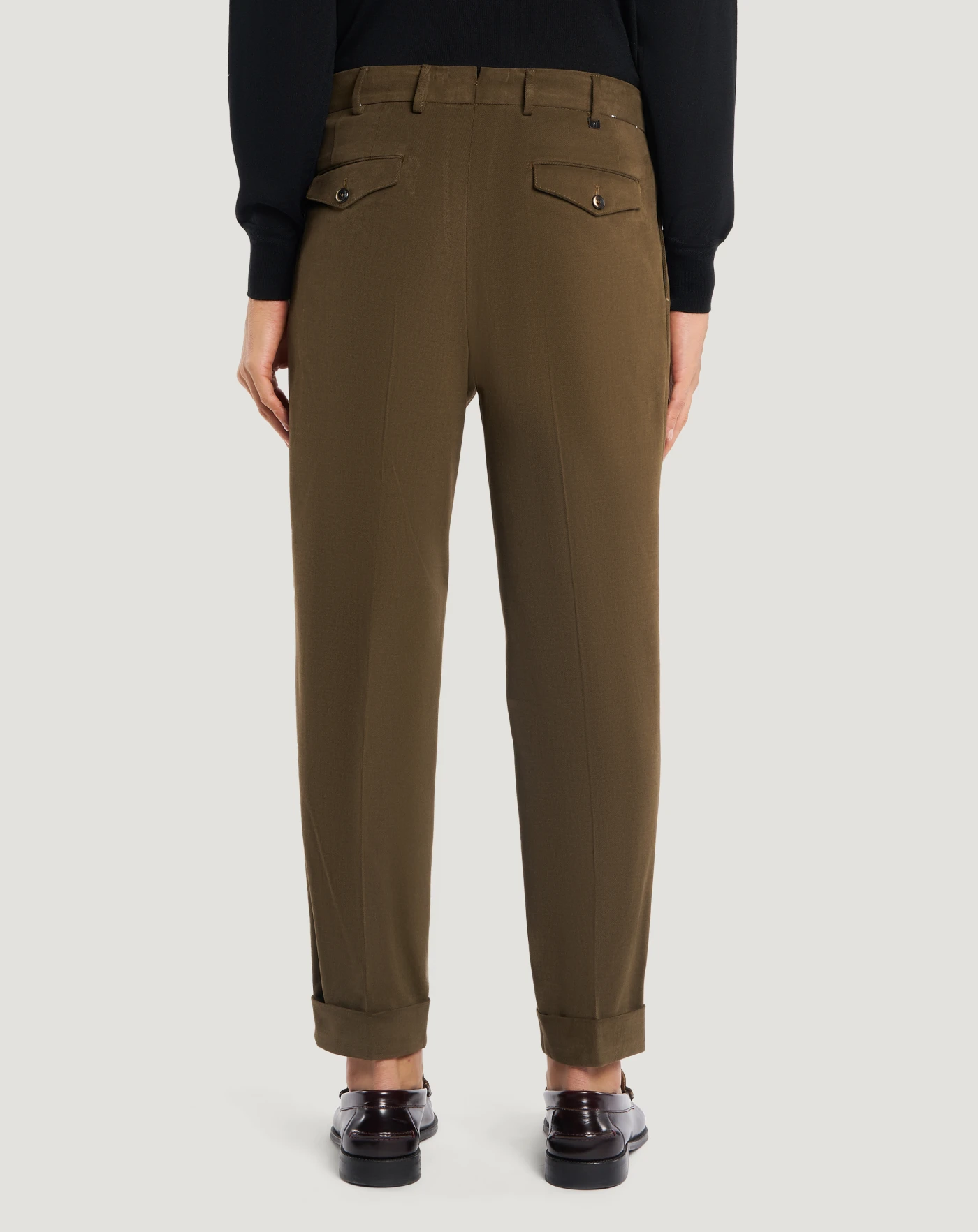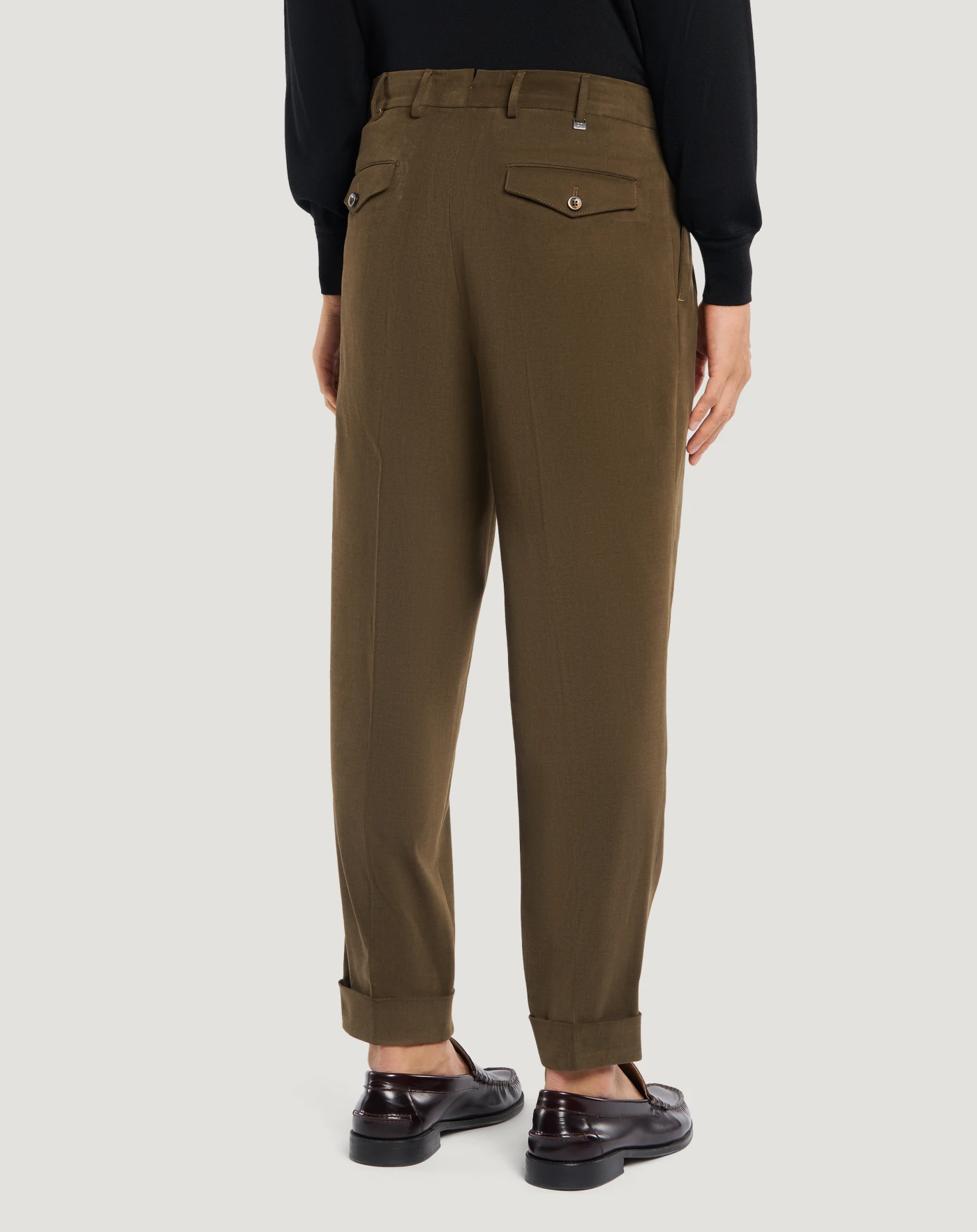 Trousers in stretch cotton drill with a light yet warm structure and diagonal weave for durability.Relaxed, tailored design with pleats at the front and flap pockets at the back – the green variant completes your style with a refined chromatic note.