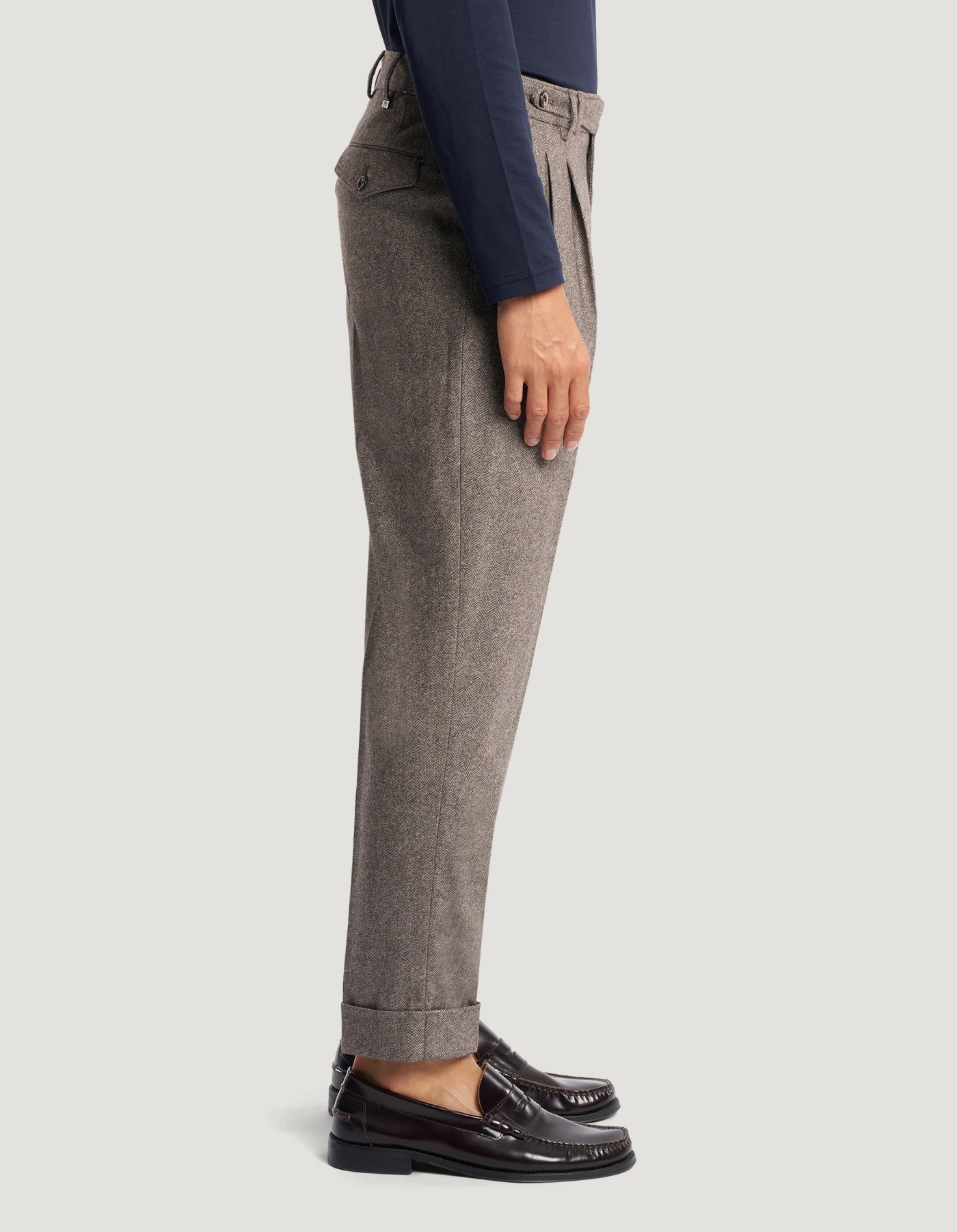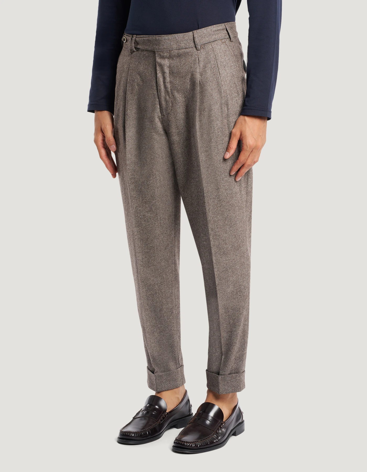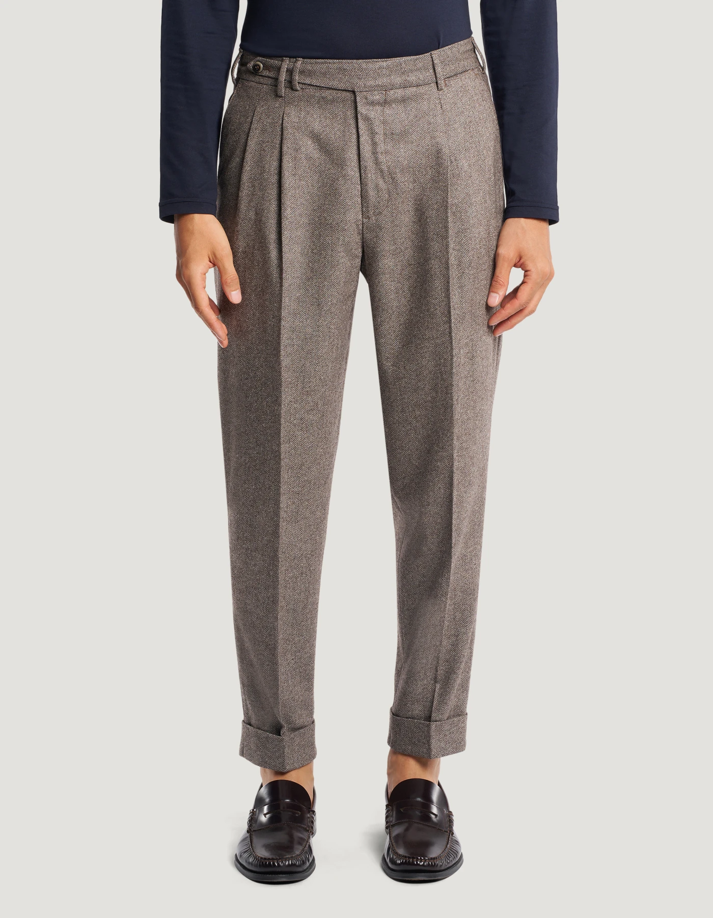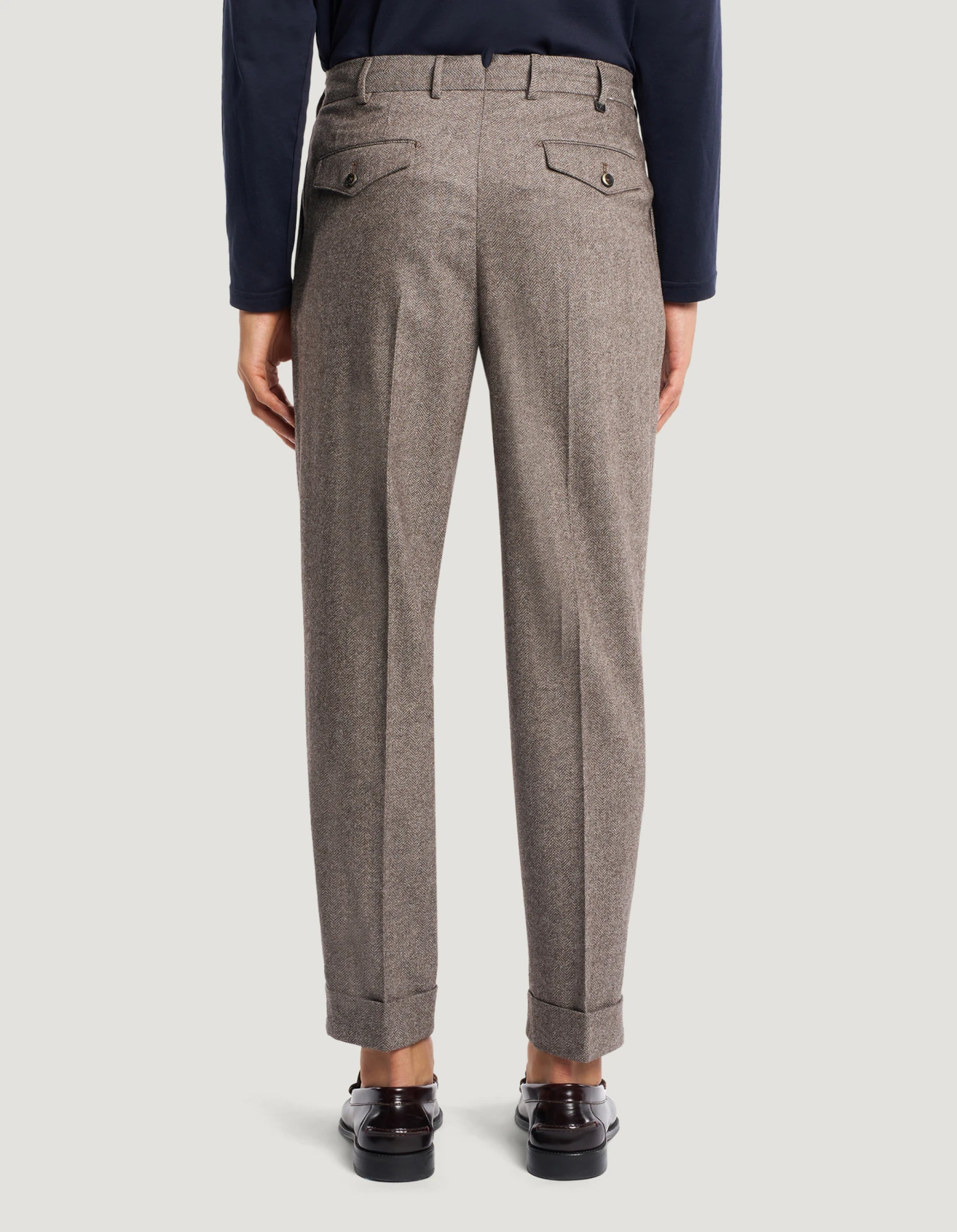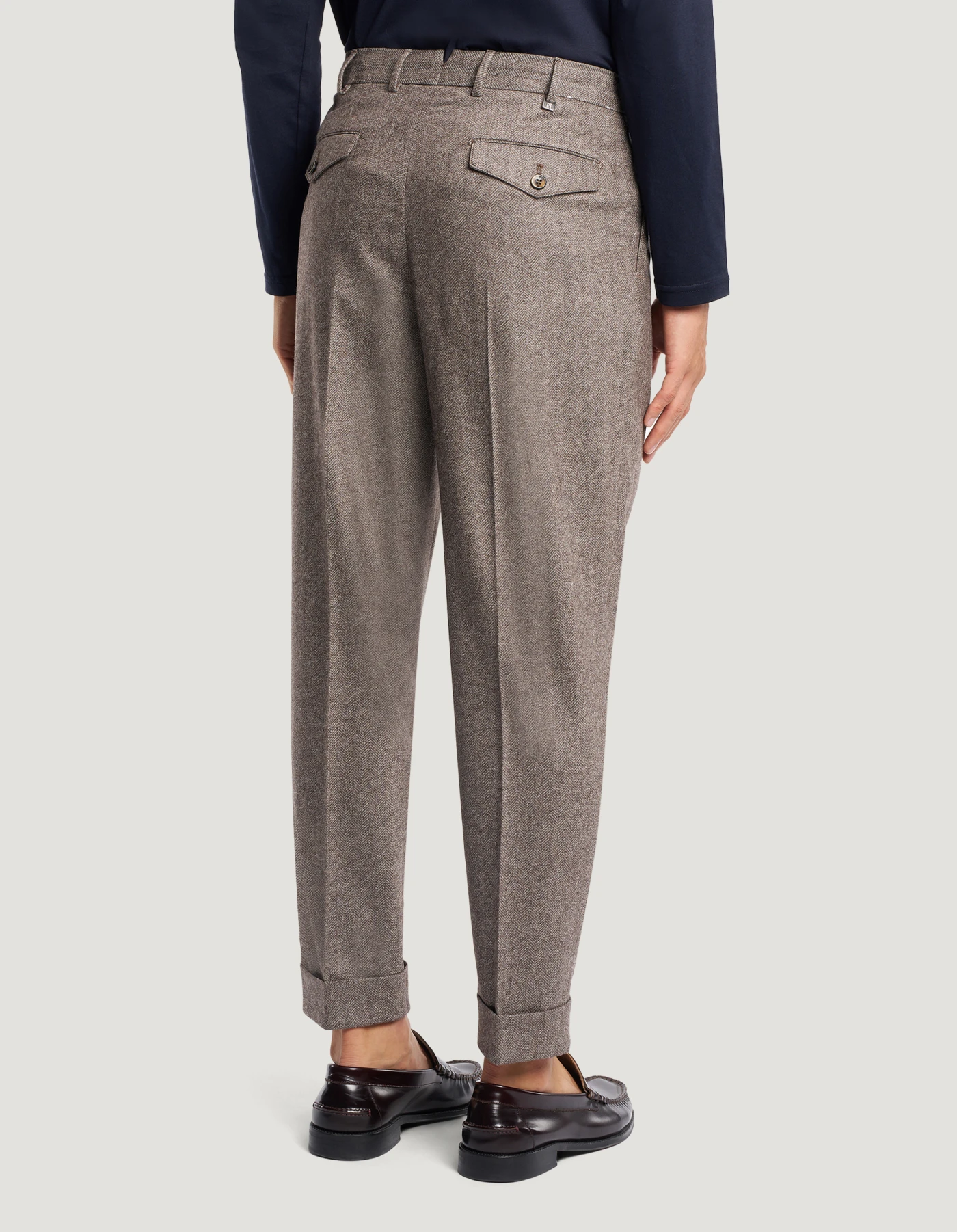 Trousers in wool and cashmere flannel, a soft and refined fabric with a micro chevron pattern.Their relaxed, tailored design with pleats at the front and flap pockets at the back gives your on- and off-duty looks a refined touch.