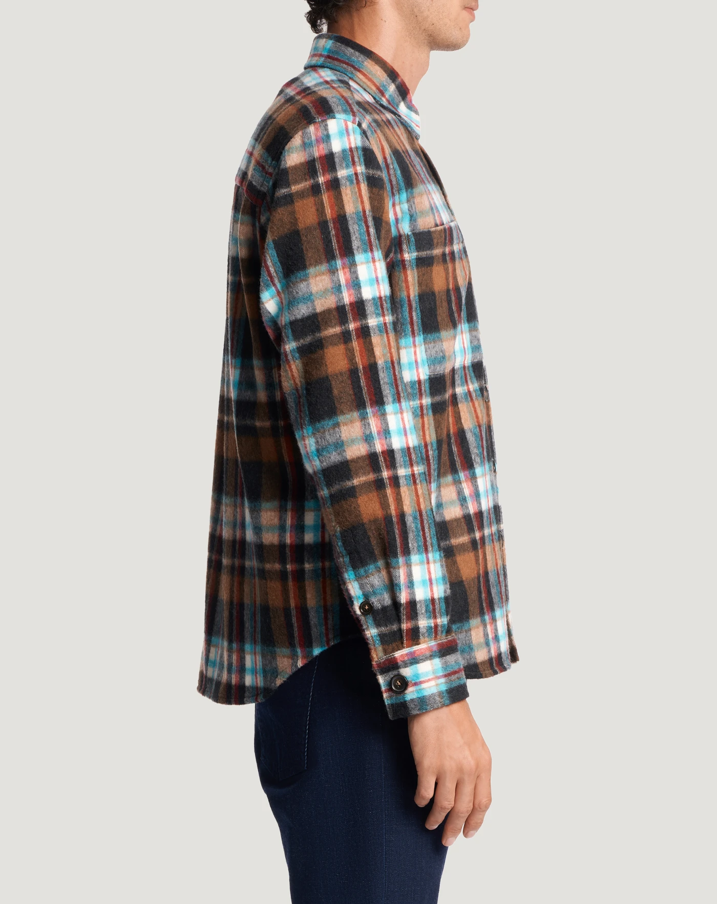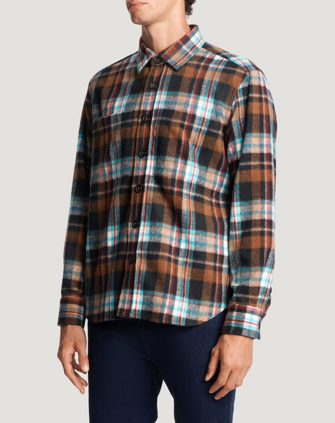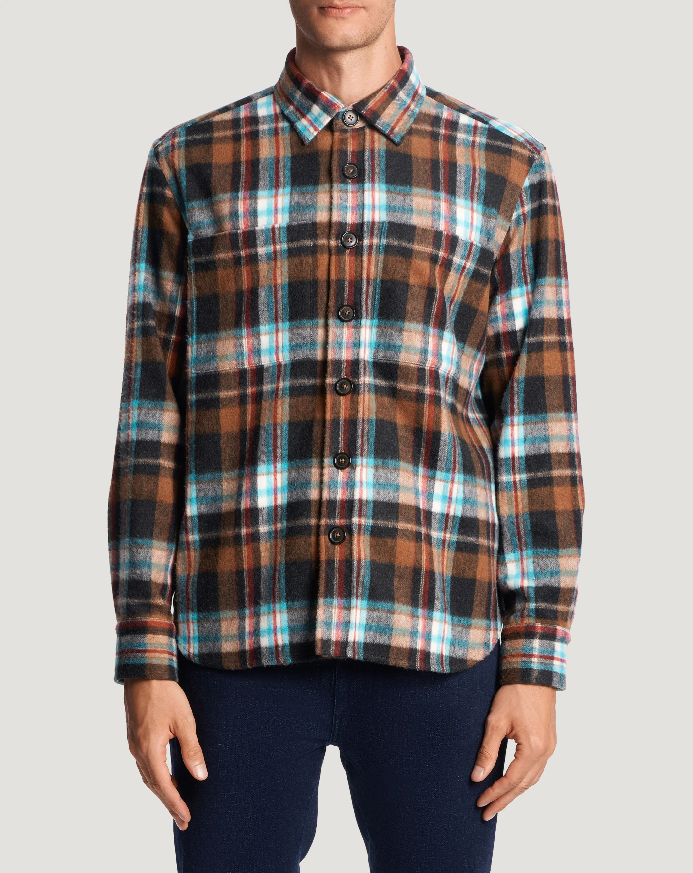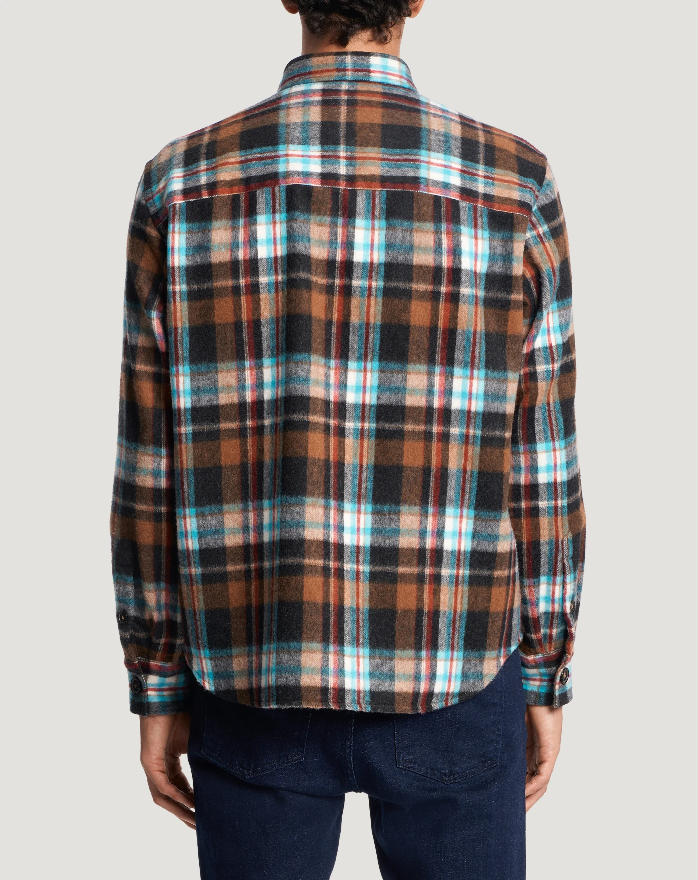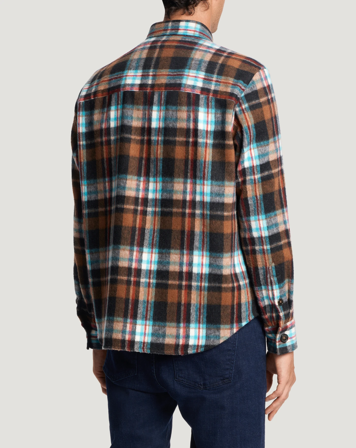 Overshirt-style jacket in a wool blend, a fabric featuring a checked design and overcheck motif – an overlaid, larger checked pattern that creates an elegant, graphic contrast.With a collar and patch pockets, this versatile garment can be worn as layering or as outerwear at the start of the season.