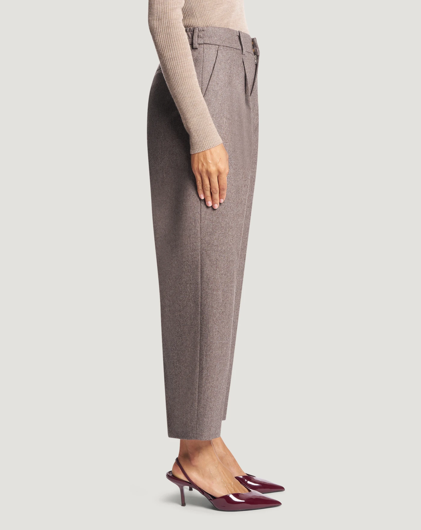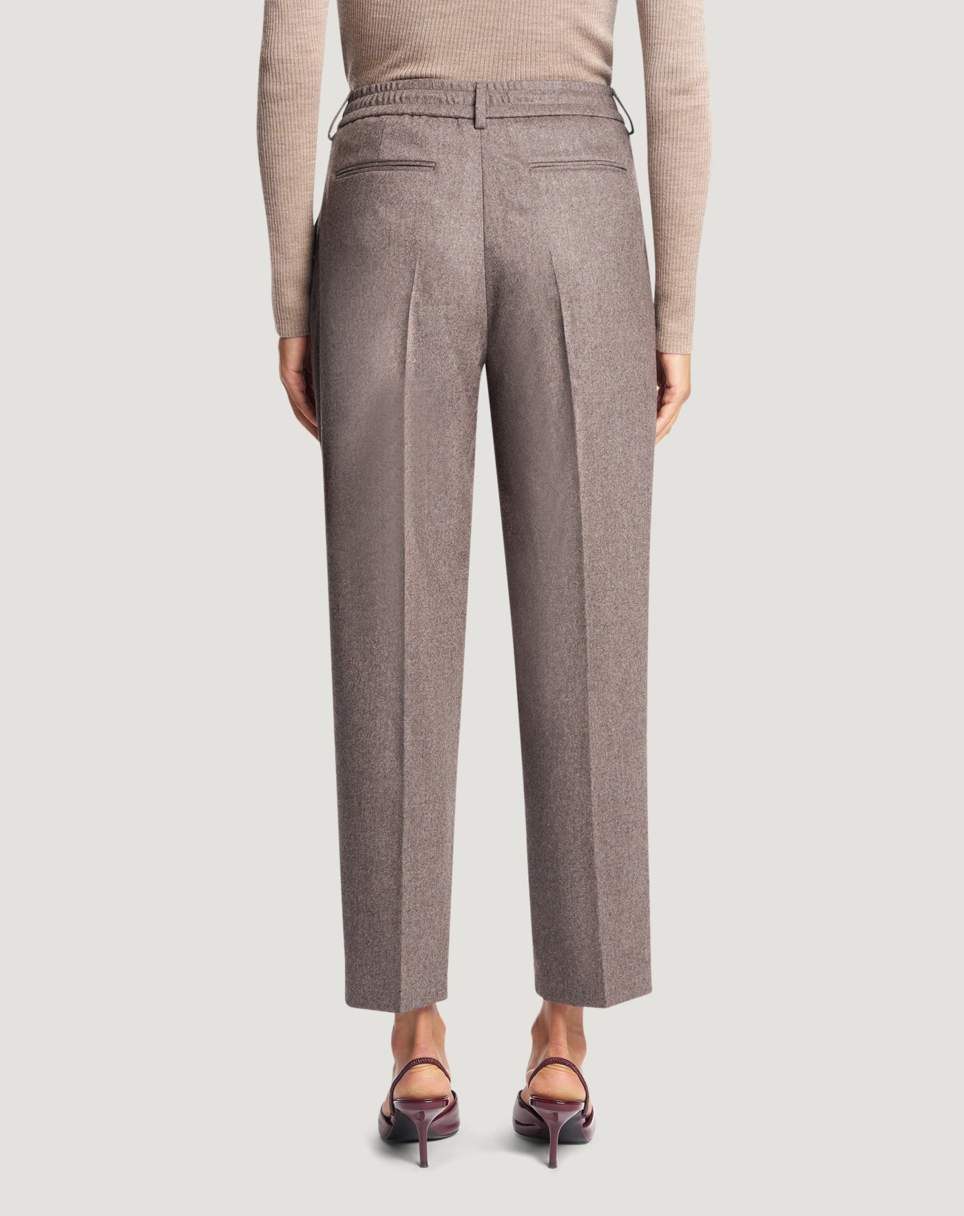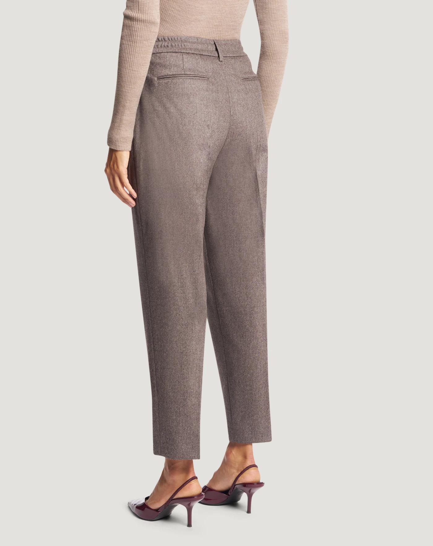 Trousers in wool and cashmere flannel, a soft, warm fabric that will complete seasonal looks to perfection.With pleats at the front and elasticated back, the dove grey variant will brighten up an elegant style.