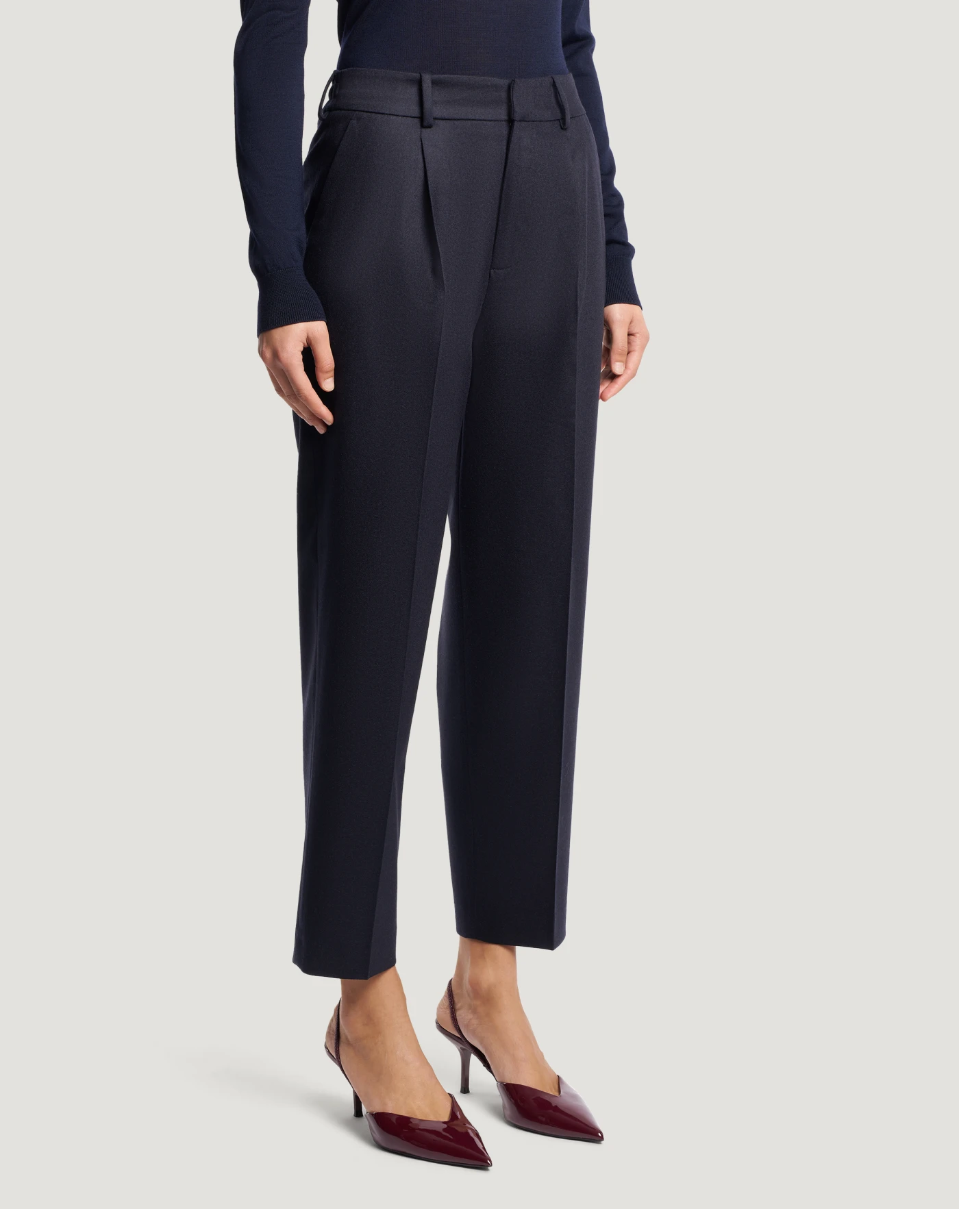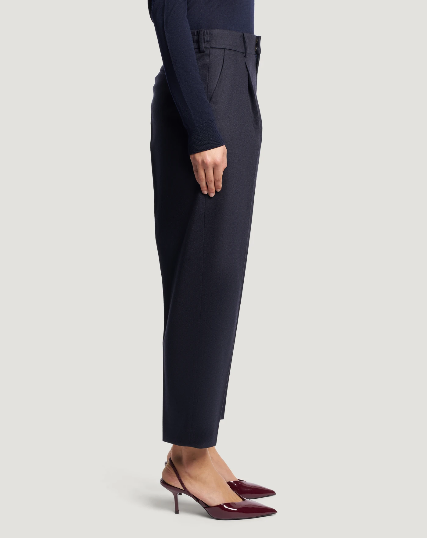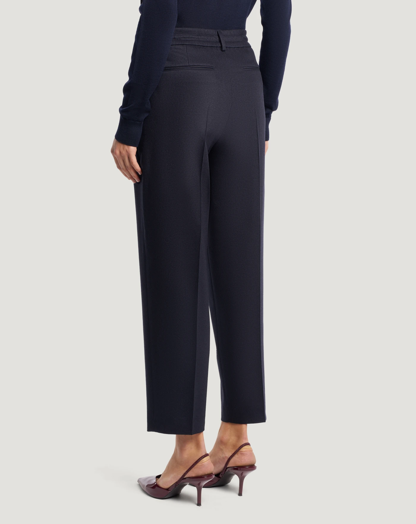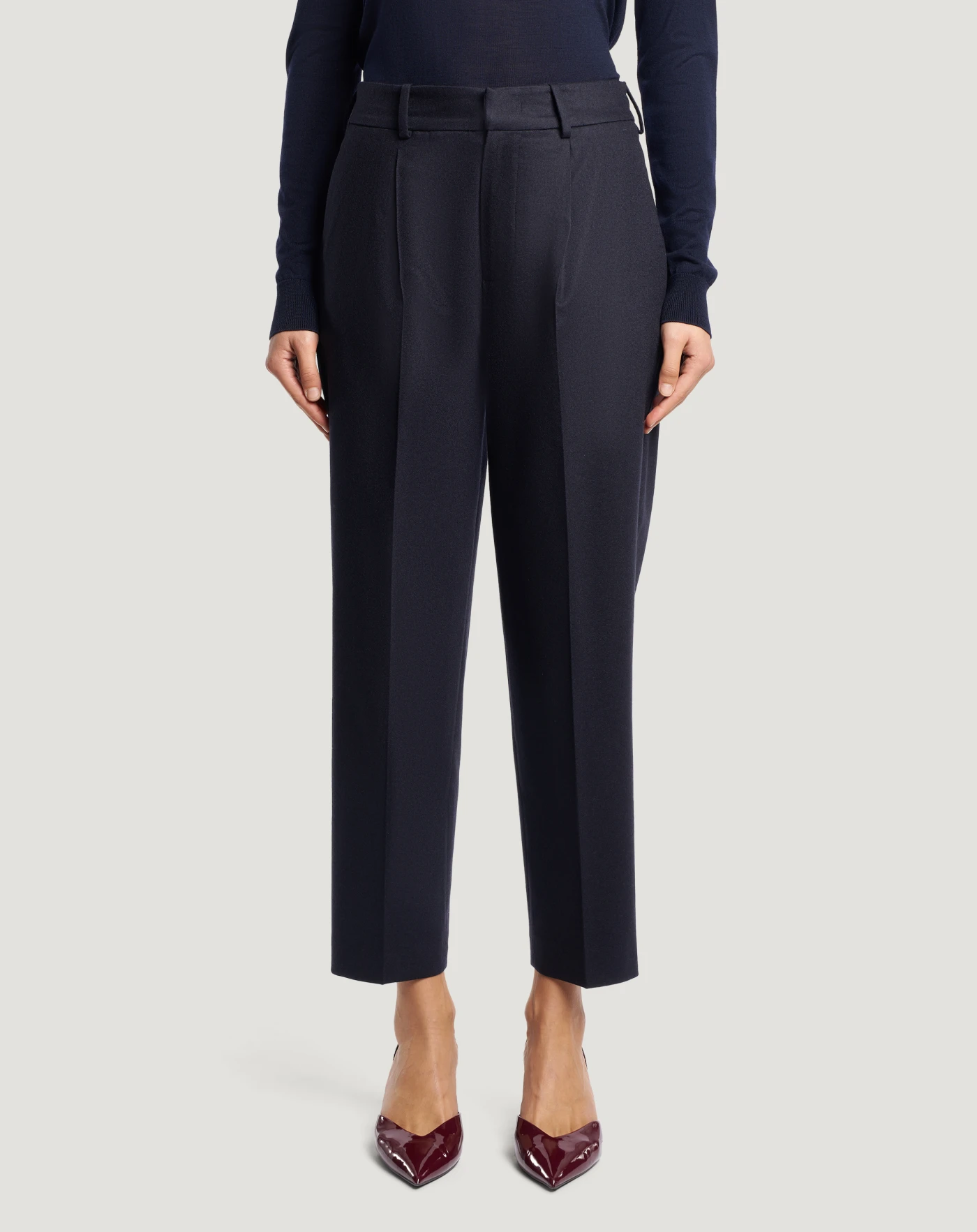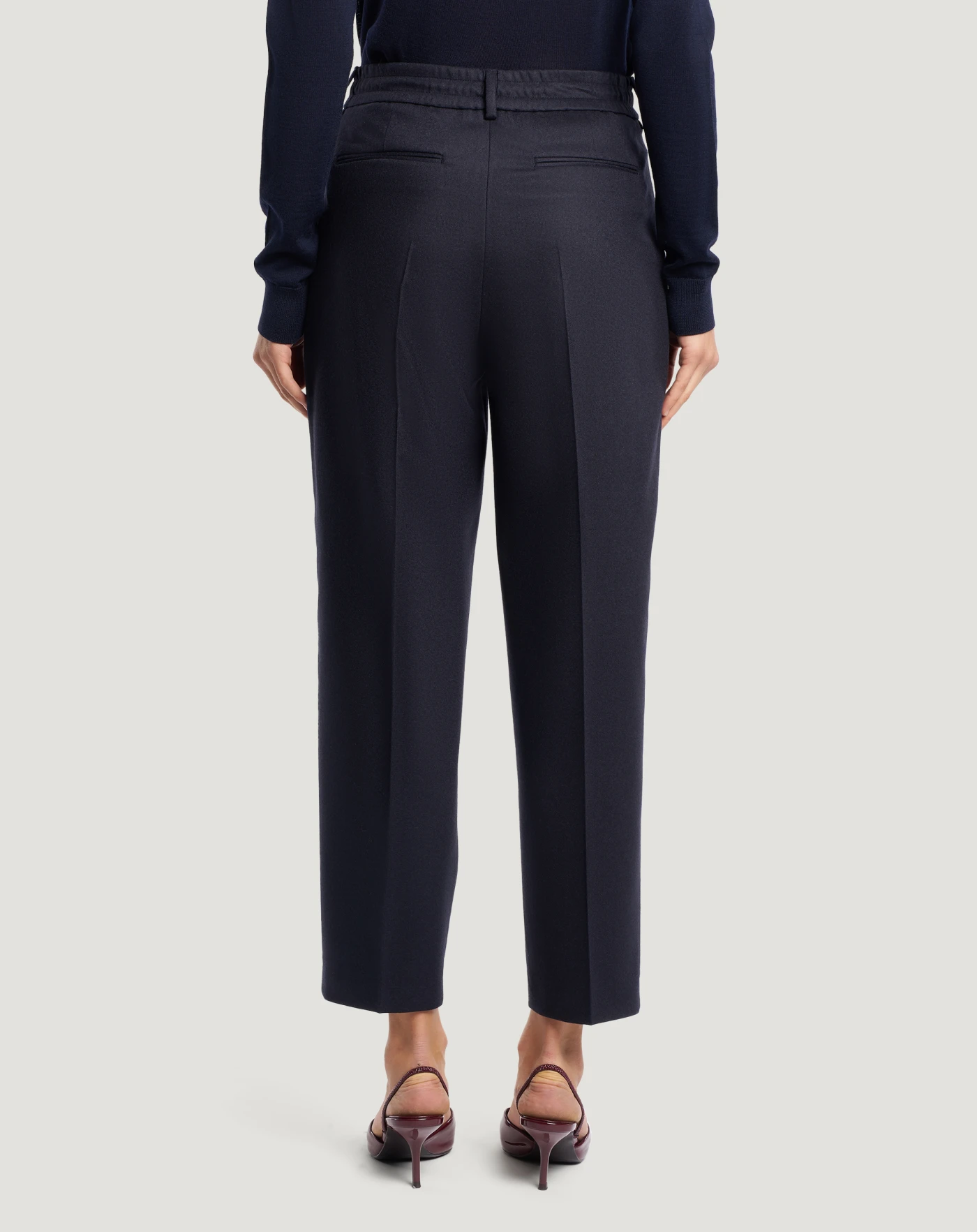Trousers in wool and cashmere flannel, a soft, warm fabric that will complete seasonal looks to perfection.With pleats at the front and elasticated back, in navy blue for an easy-to-pair garment.