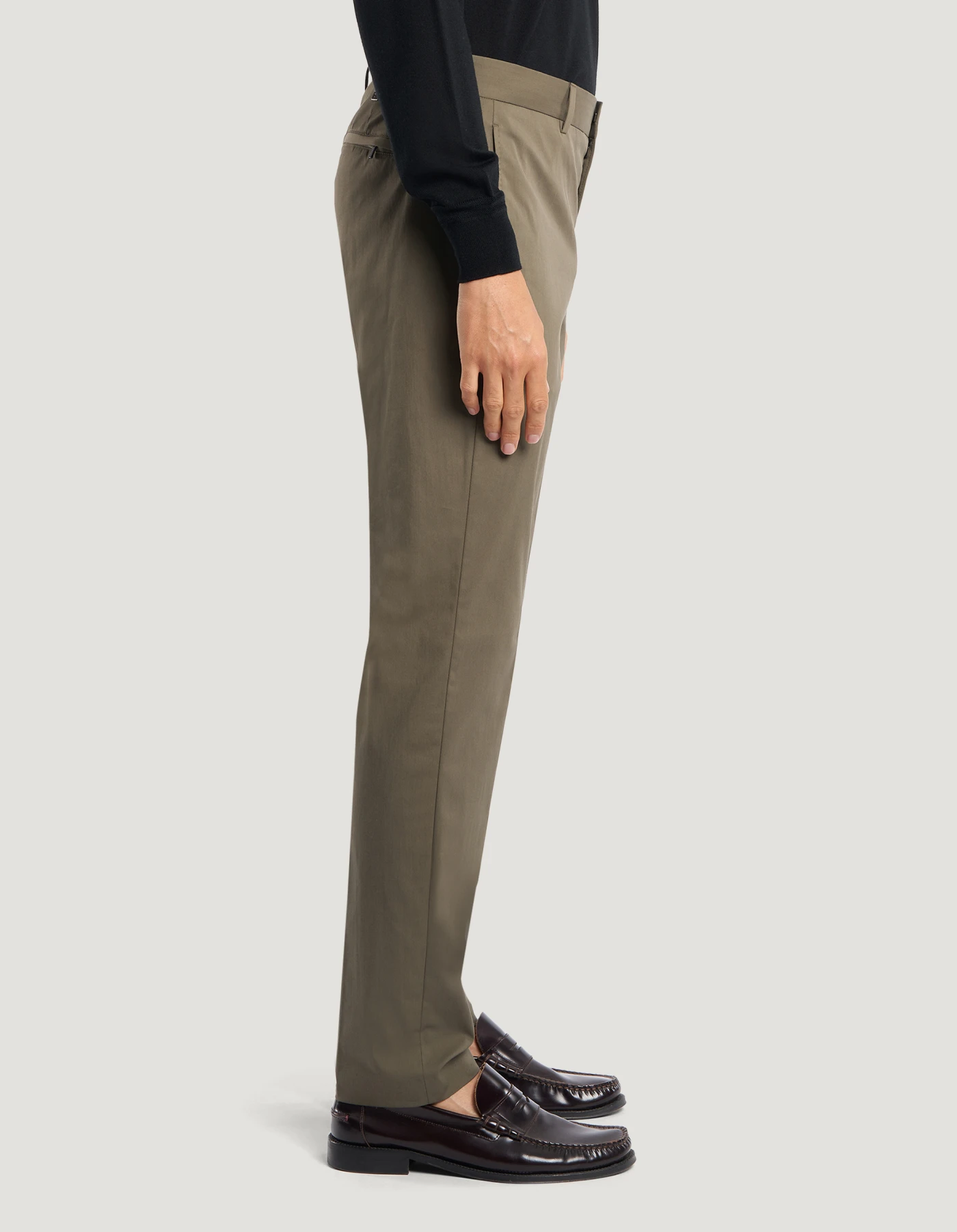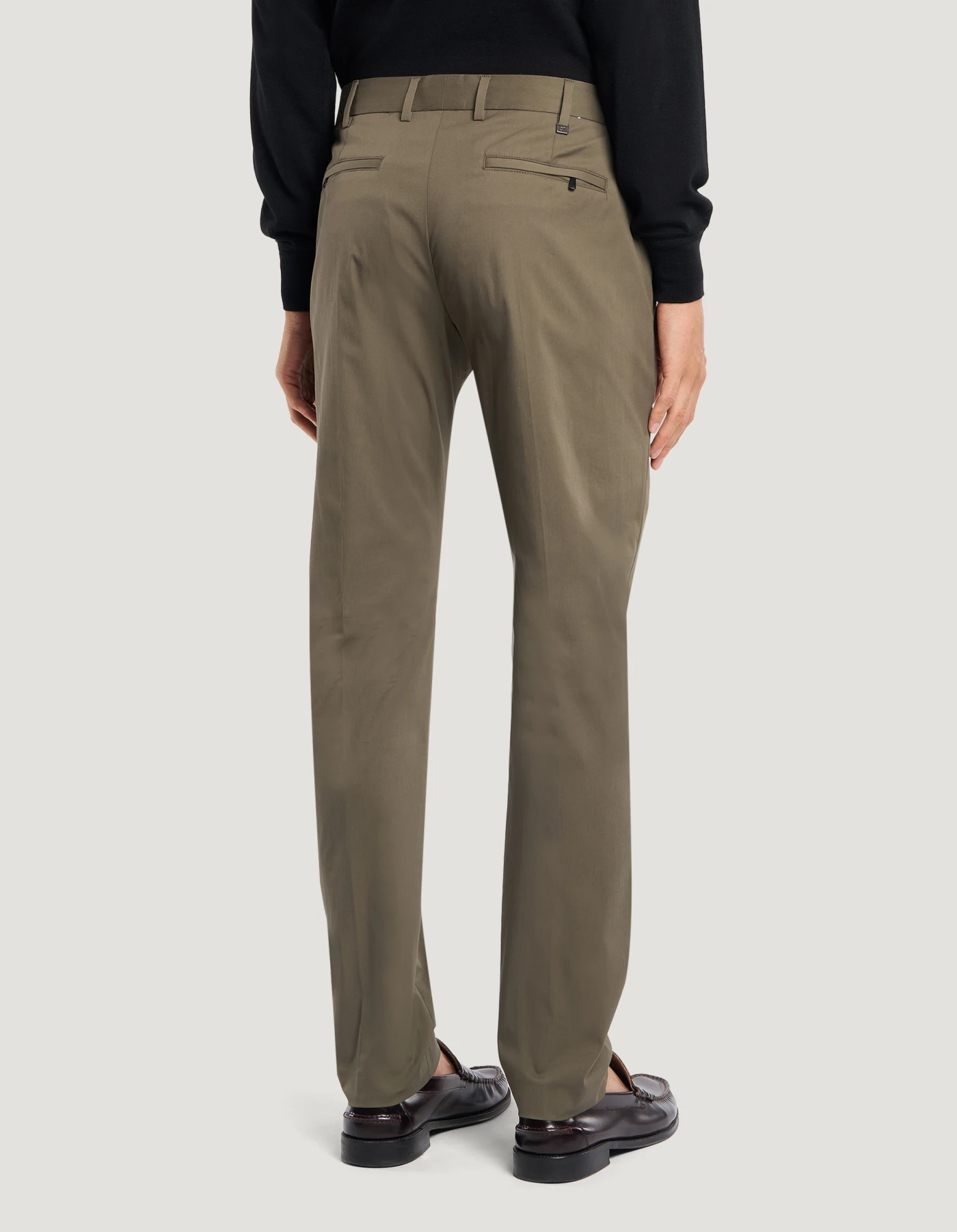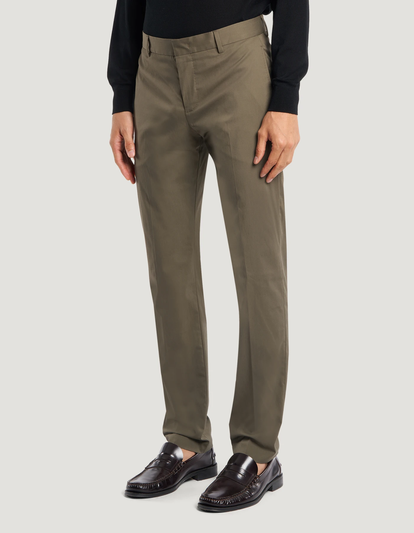 Trousers in stretch techno cotton twill, a fresh, durable and easy-maintenance fabric.Super-slim fit, smooth front and zip pockets at the back for an ankle-length tailored model with refined details. The military variant is ideal for smart casual looks that won’t go unnoticed.