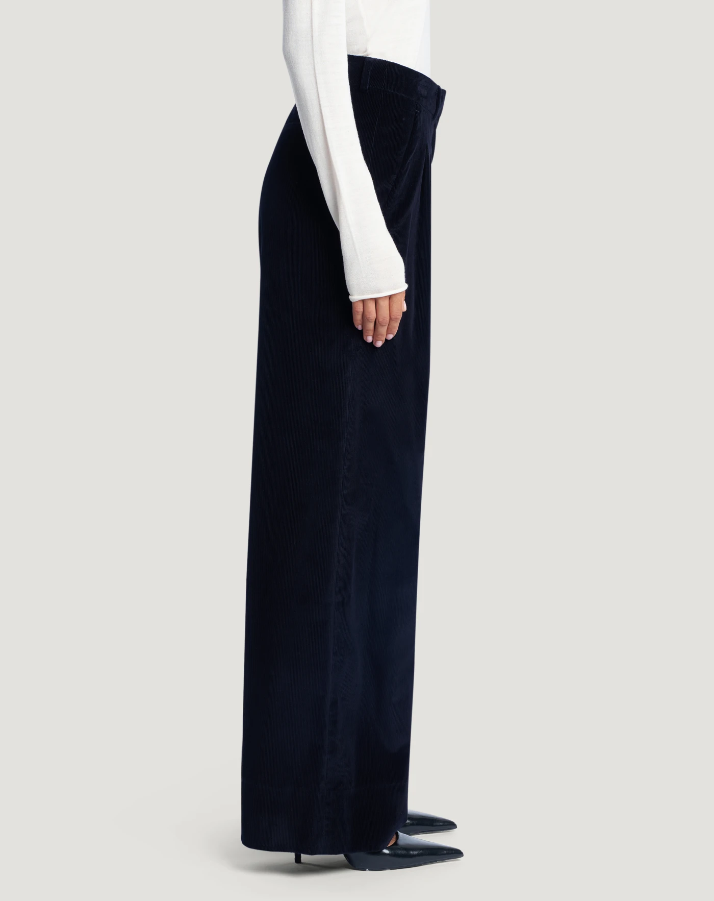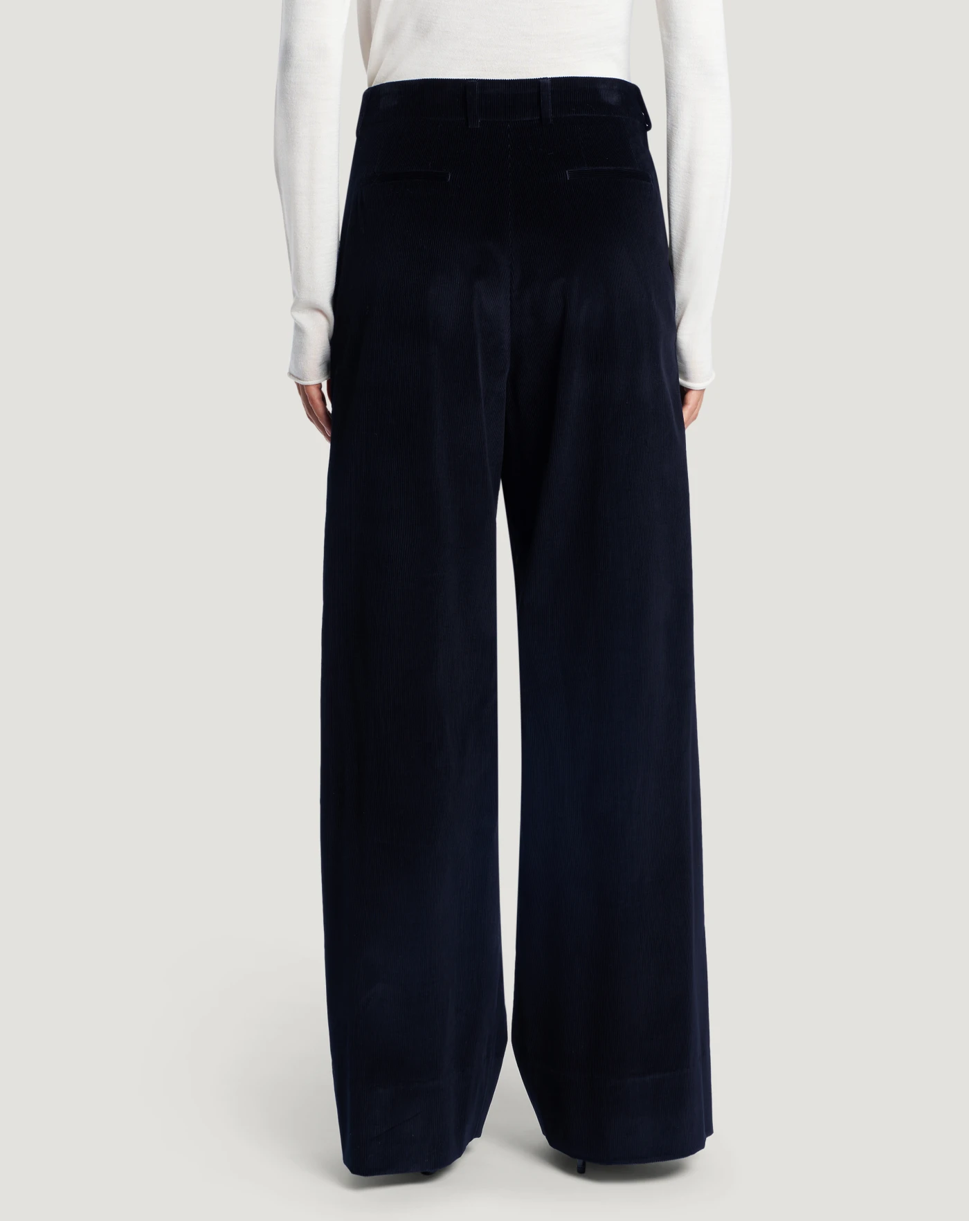 Trousers in stretch cotton blend fine rib velvet with a super-soft texture and bright colour.With a wide fit and pleats at the front adding dynamism, in the blue variant they are perfect for completing your style with relaxed elegance.