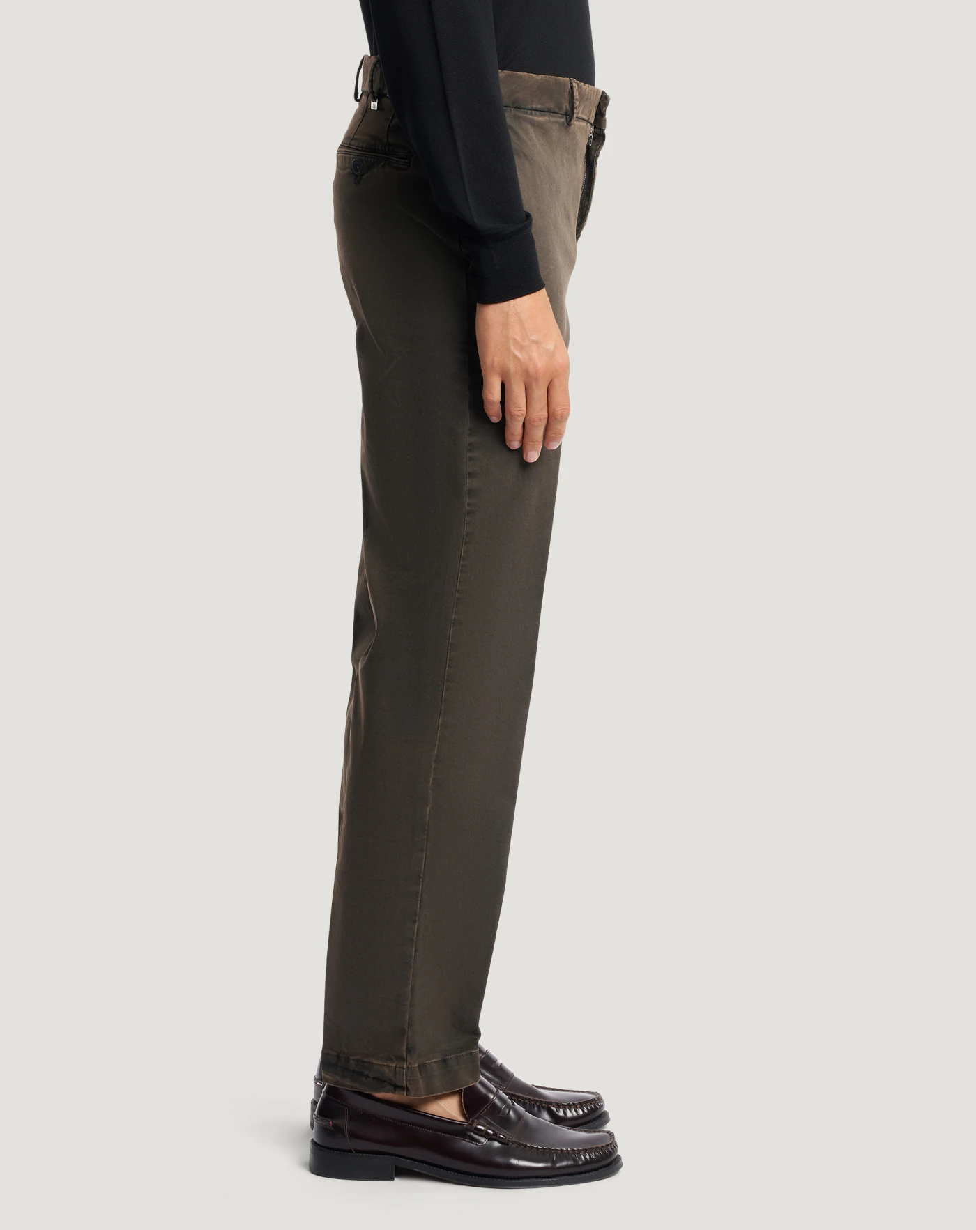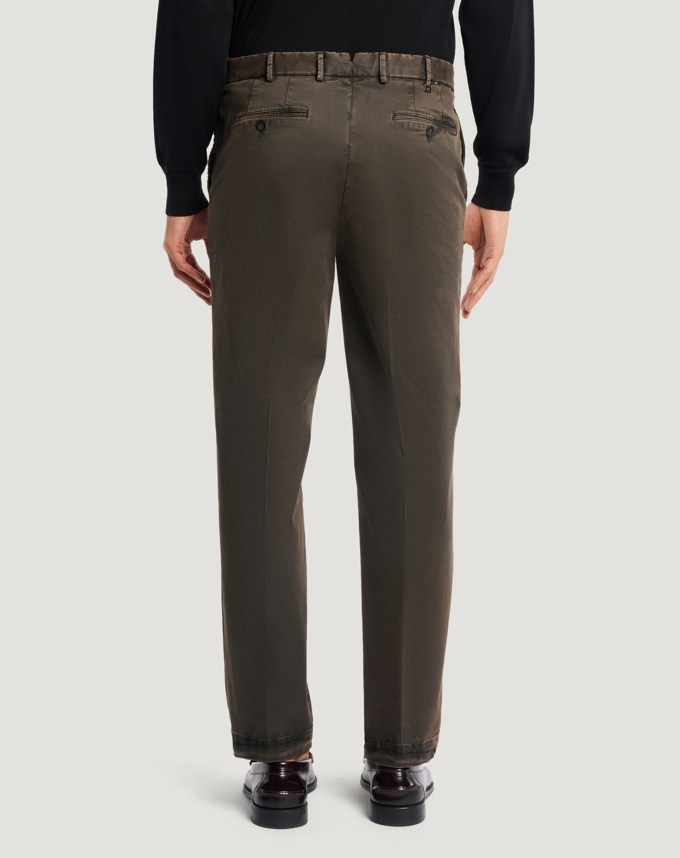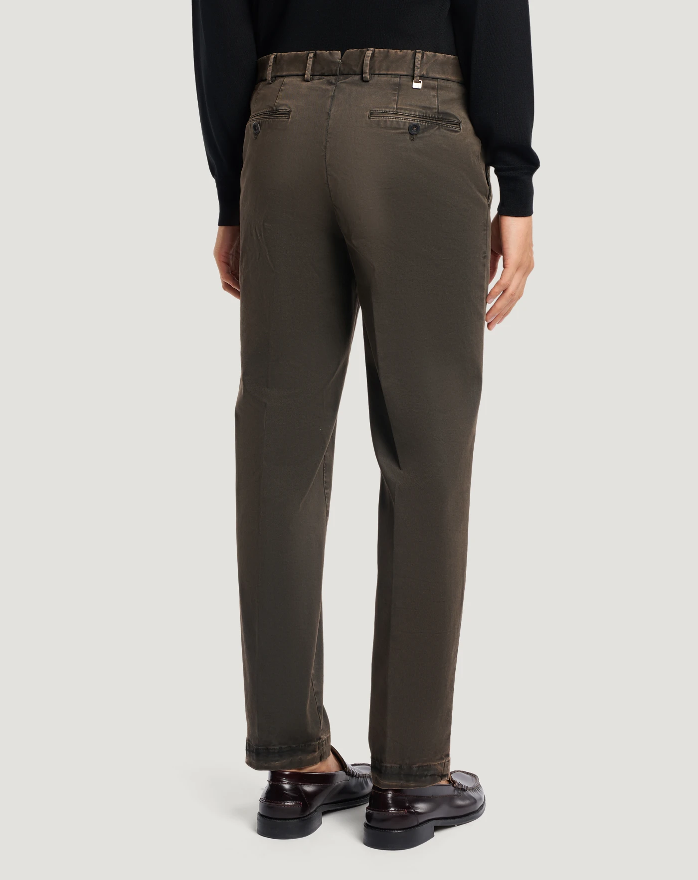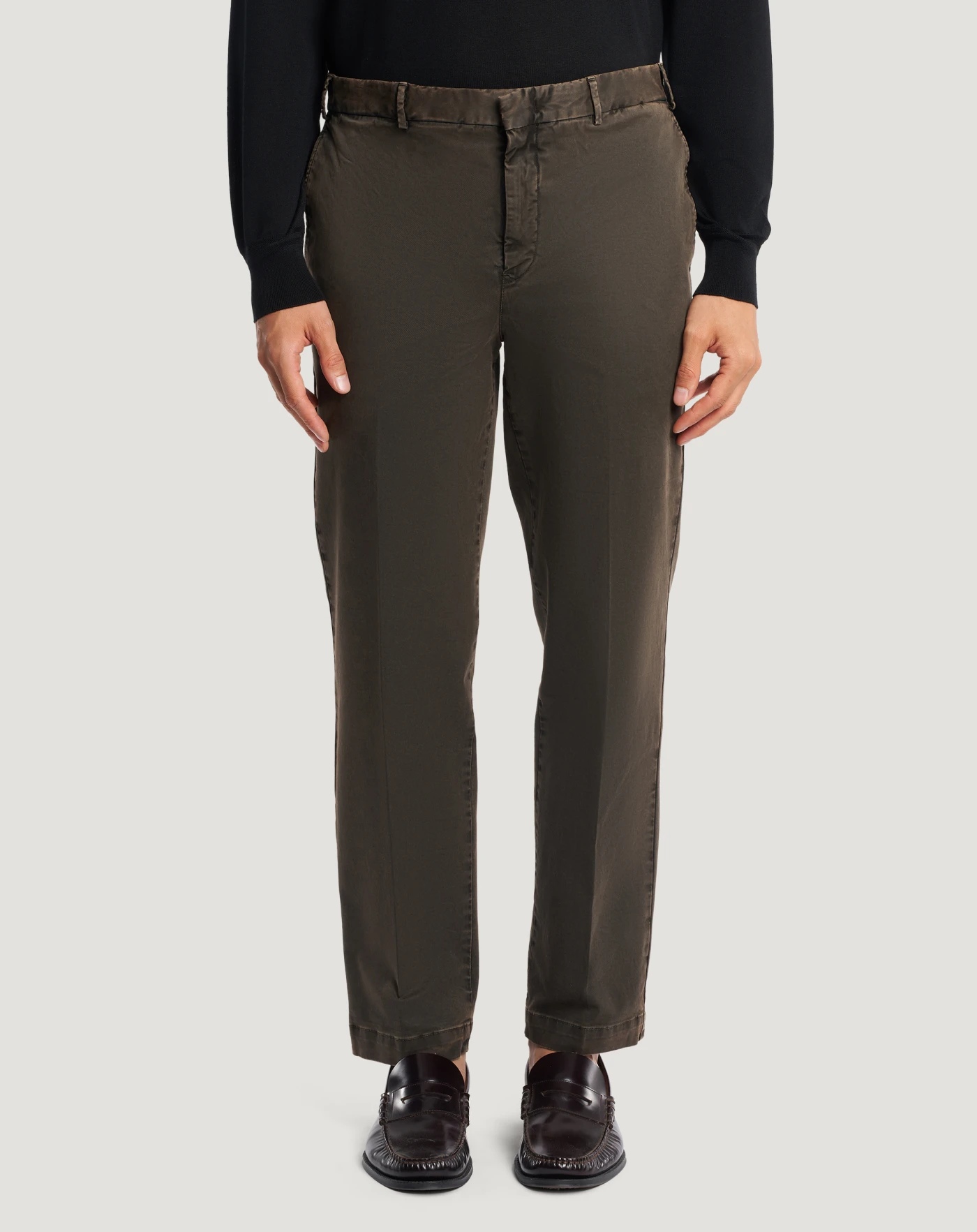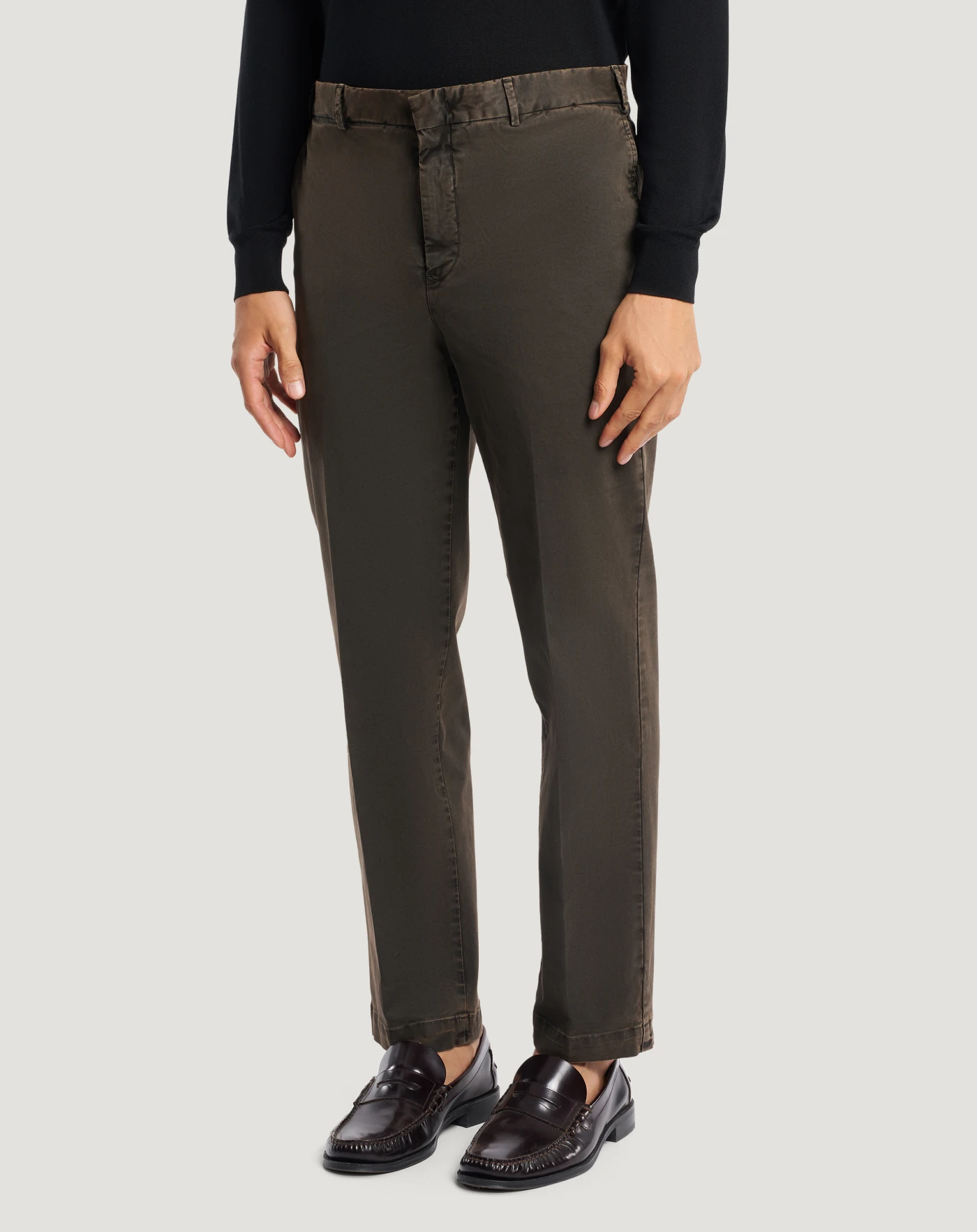Trousers in compact stretch gabardine, with a smooth, even texture. Thanks to the compact yarn and the addition of stretch fibres, it combines elegance and comfort in a technical yet refined fabric. With a carrot fit and pressed crease, they feature a modern and versatile look.
