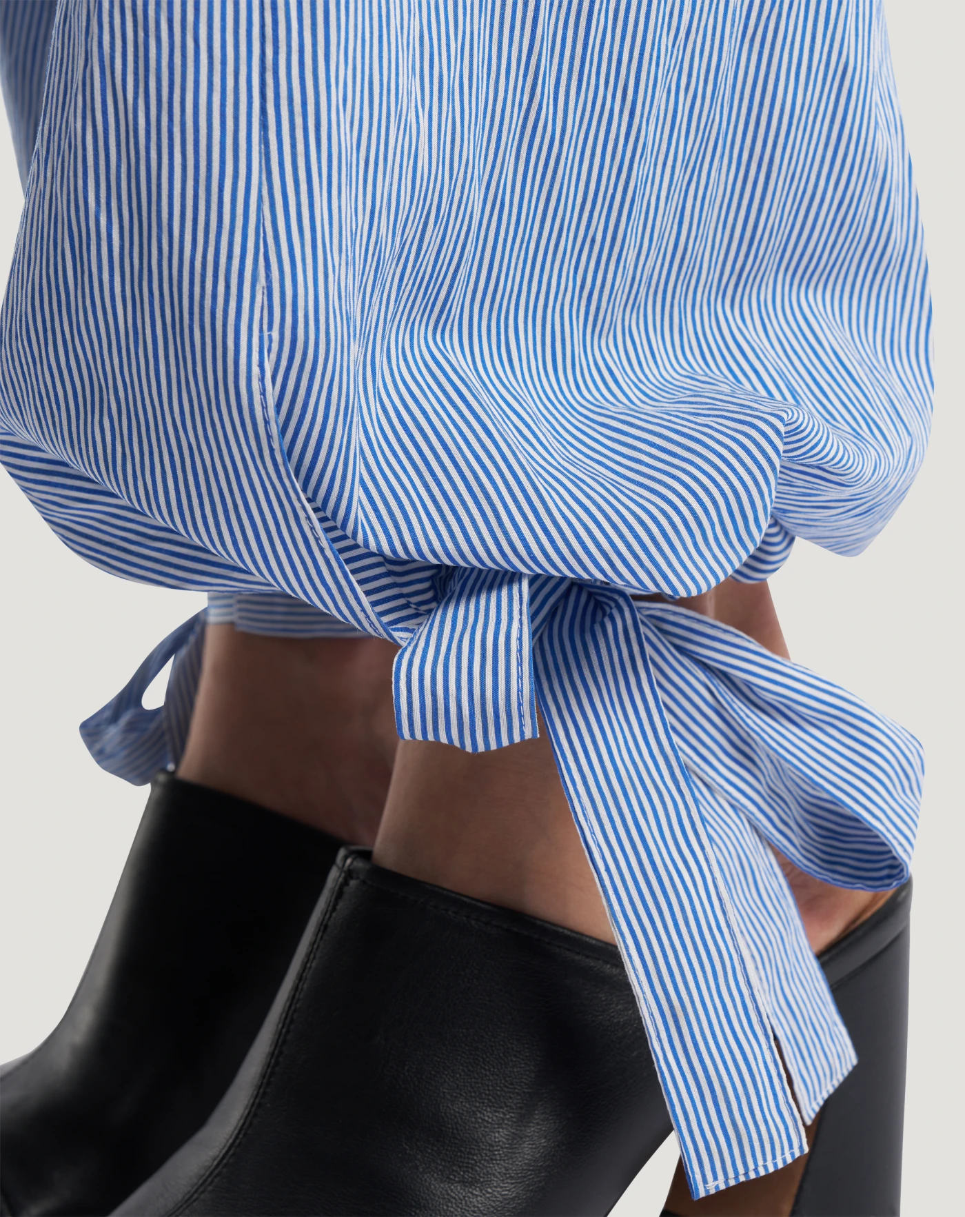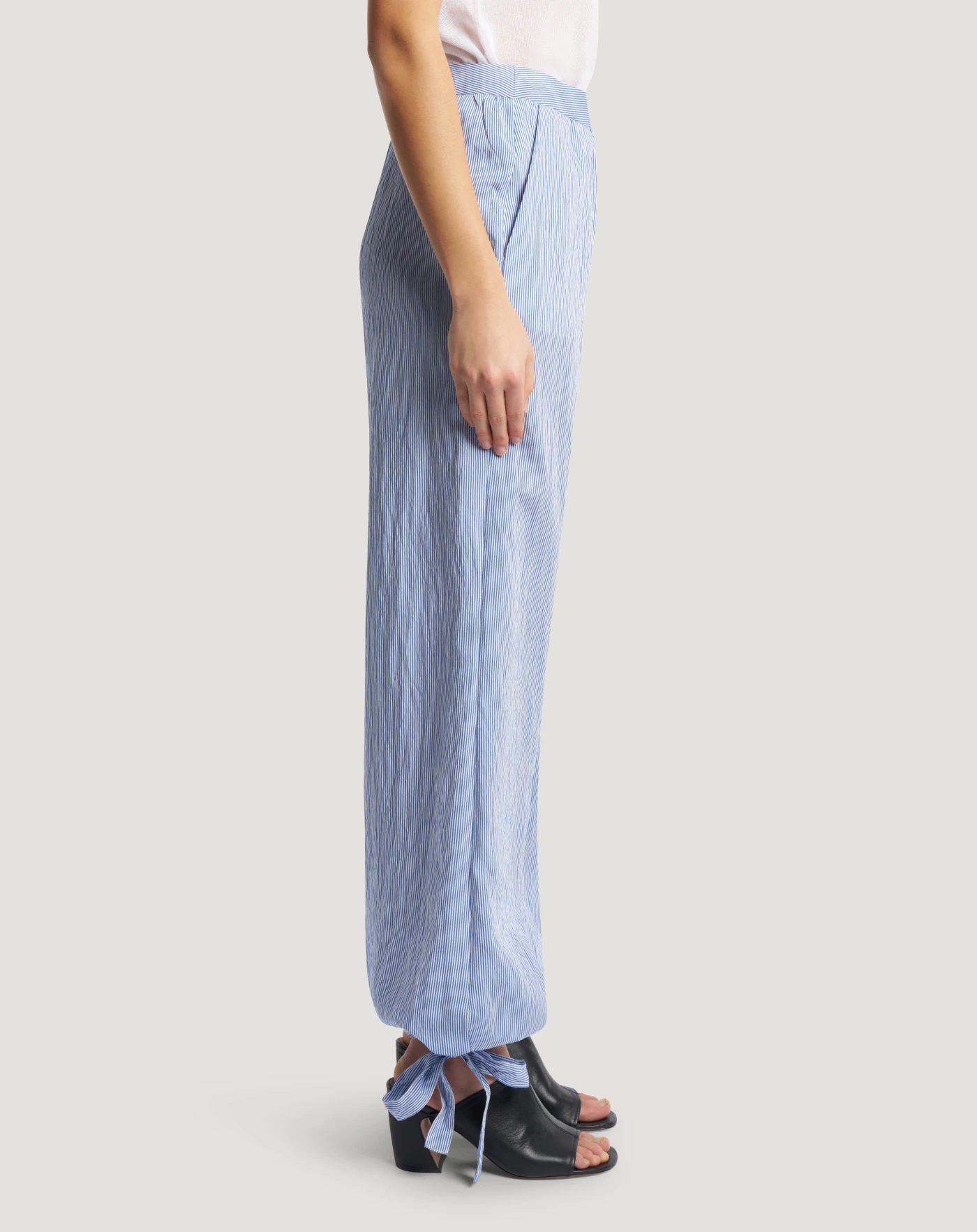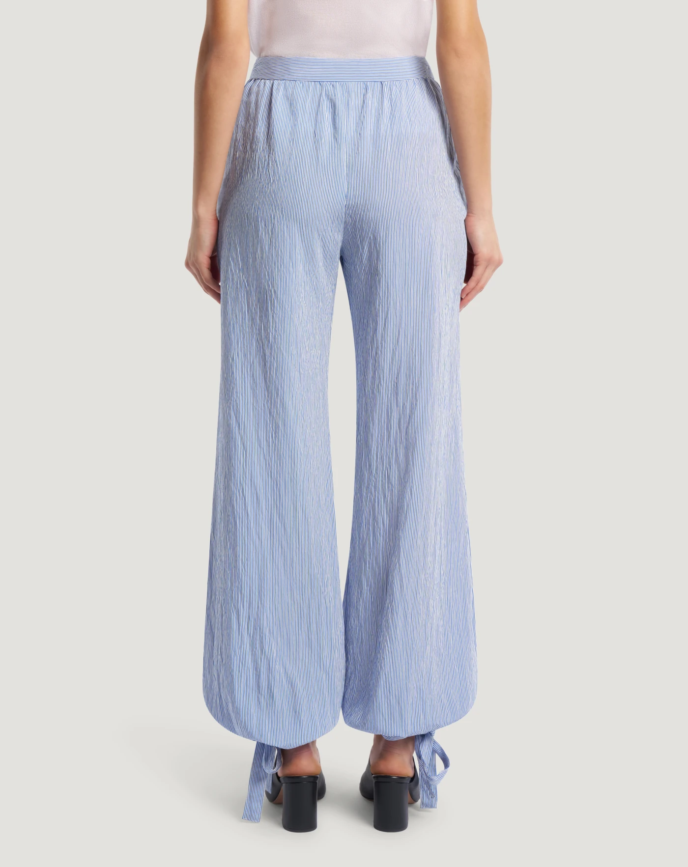 Trousers in lightweight, breathable viscose fabric, worked with the typical fil-à-fil construction that creates a delicate and refined optical effect. The relaxed line and laces at the hem give the model a versatile and refined charm.