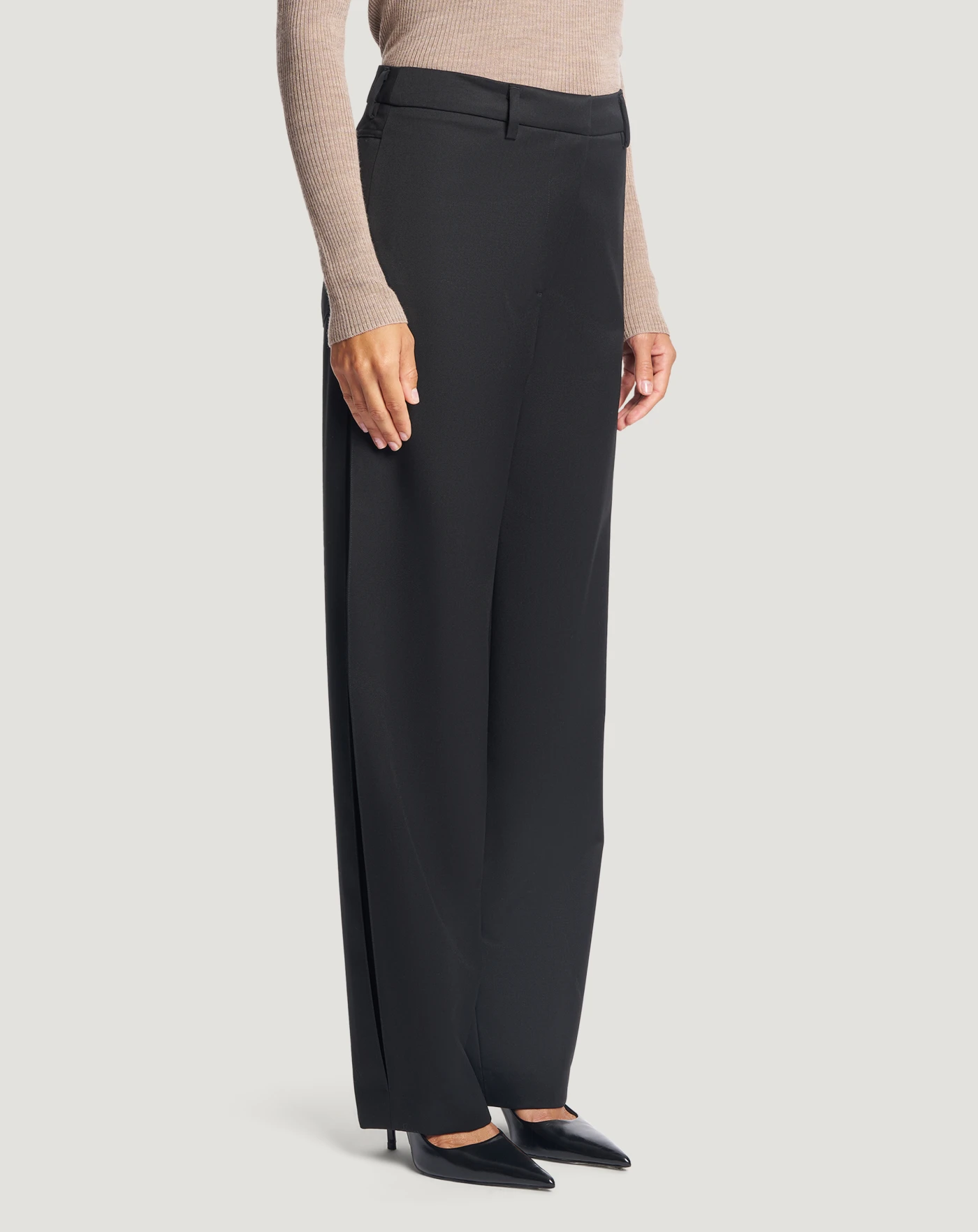 Trousers in double twisted pure wool drill that makes them resistant to tear and wear and has a contemporary, even look.With a wide and relaxed fit, they have inserts at the sides for a unique design. In black for the office and formal occasions.
