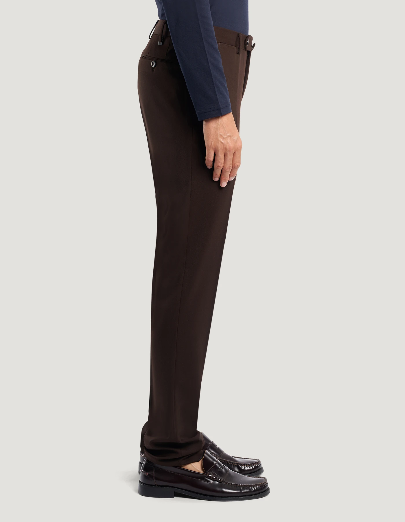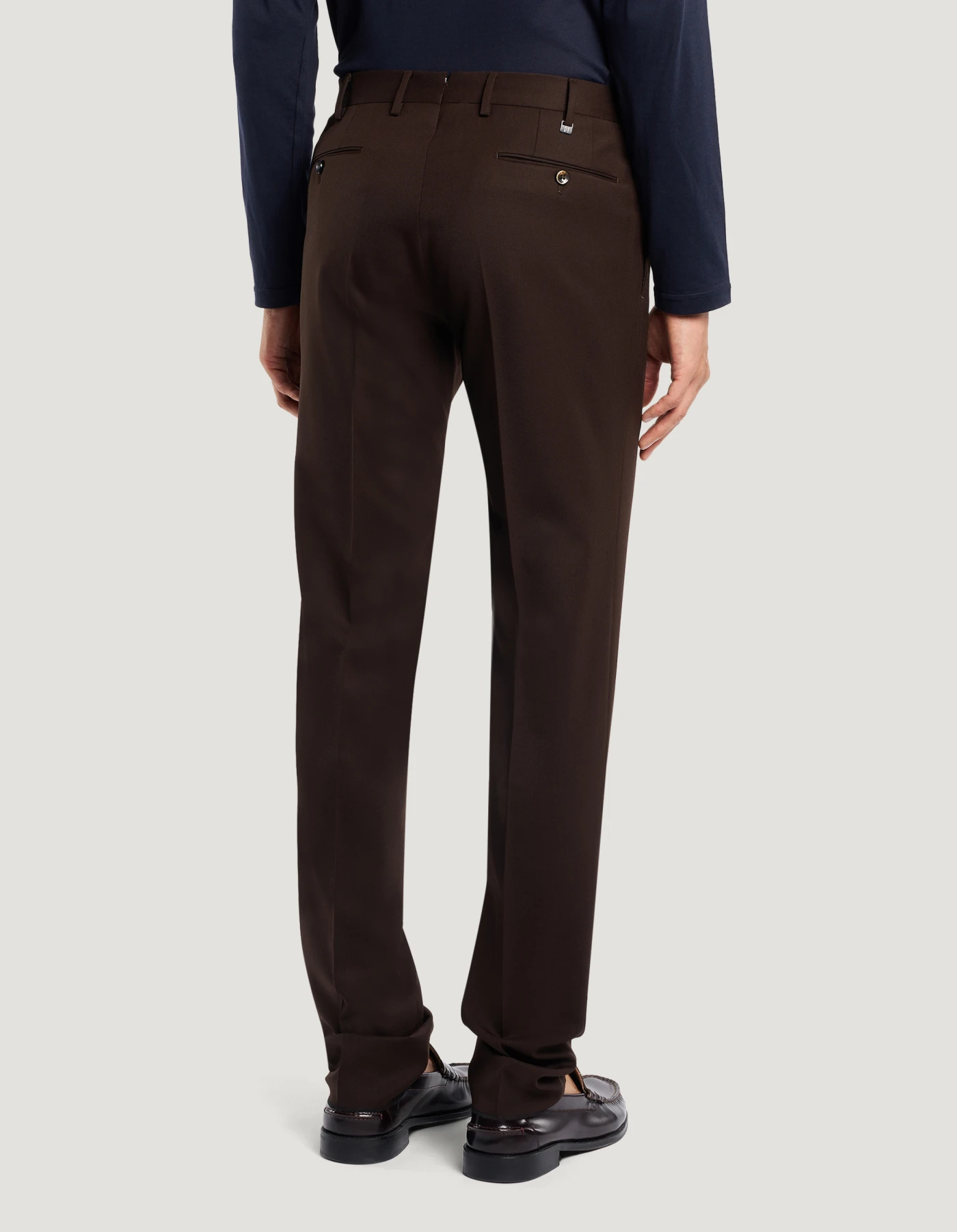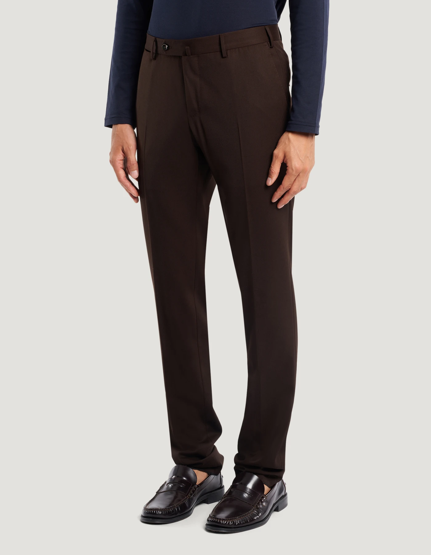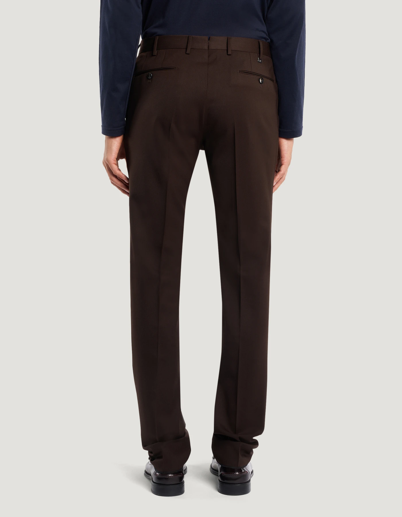 Trousers in washable bi-stretch techno wool, a warm, durable and easy-care fabric.The garment is delivered unstitched, so that it can be finished to suit your length and style through simple tailoring. Choose the brown variant to elegantly complete formal and office looks.
