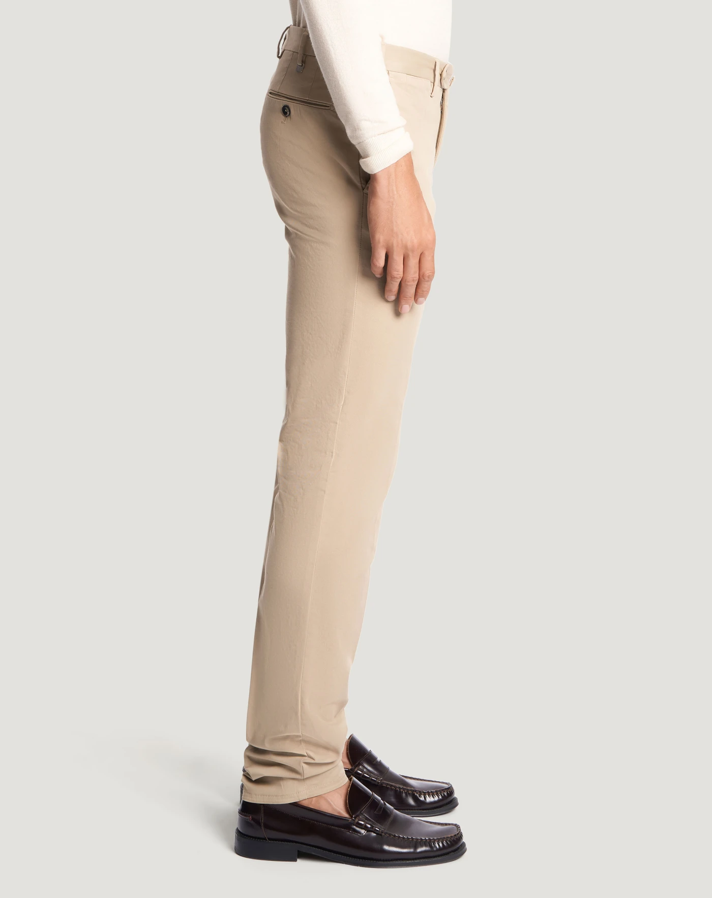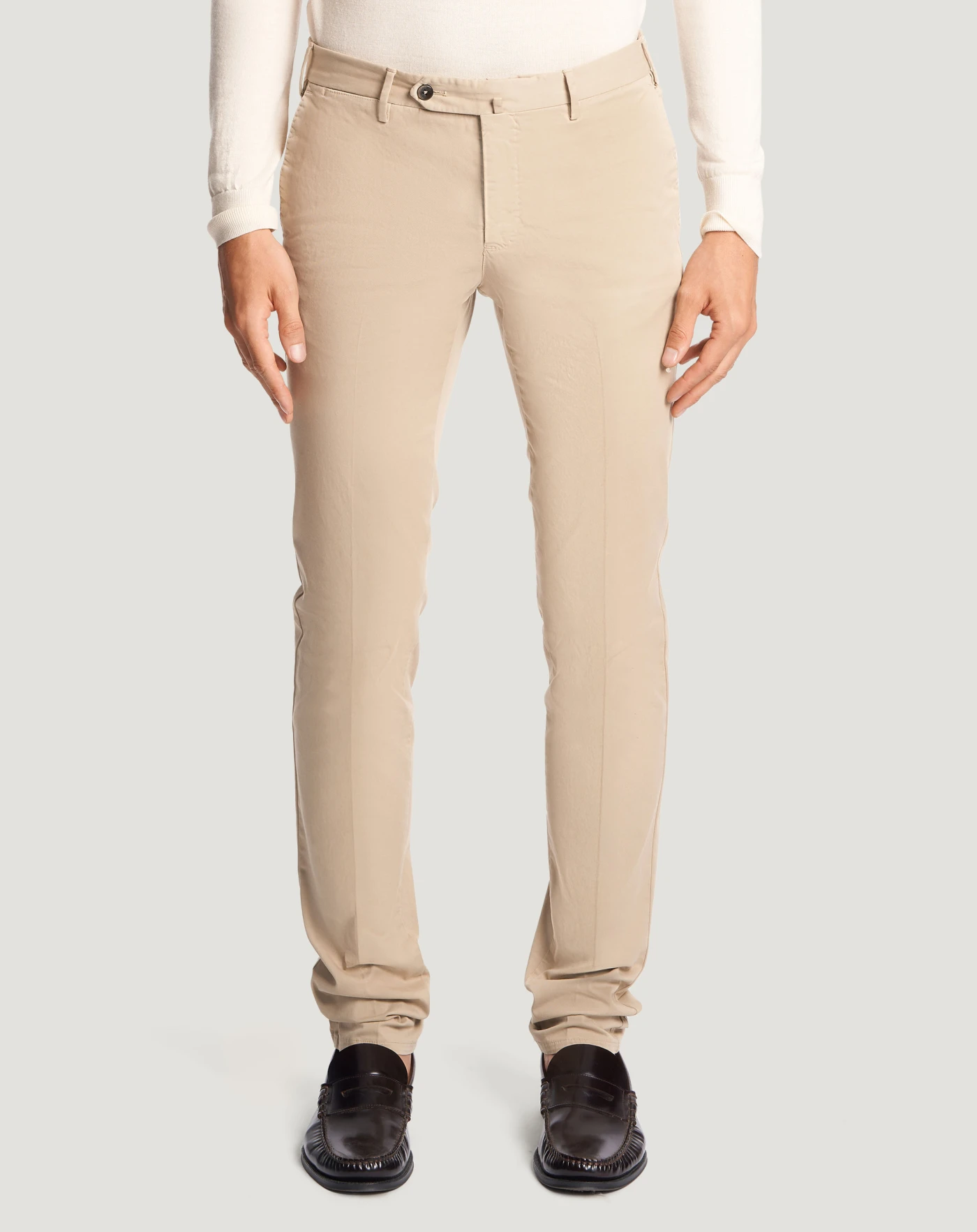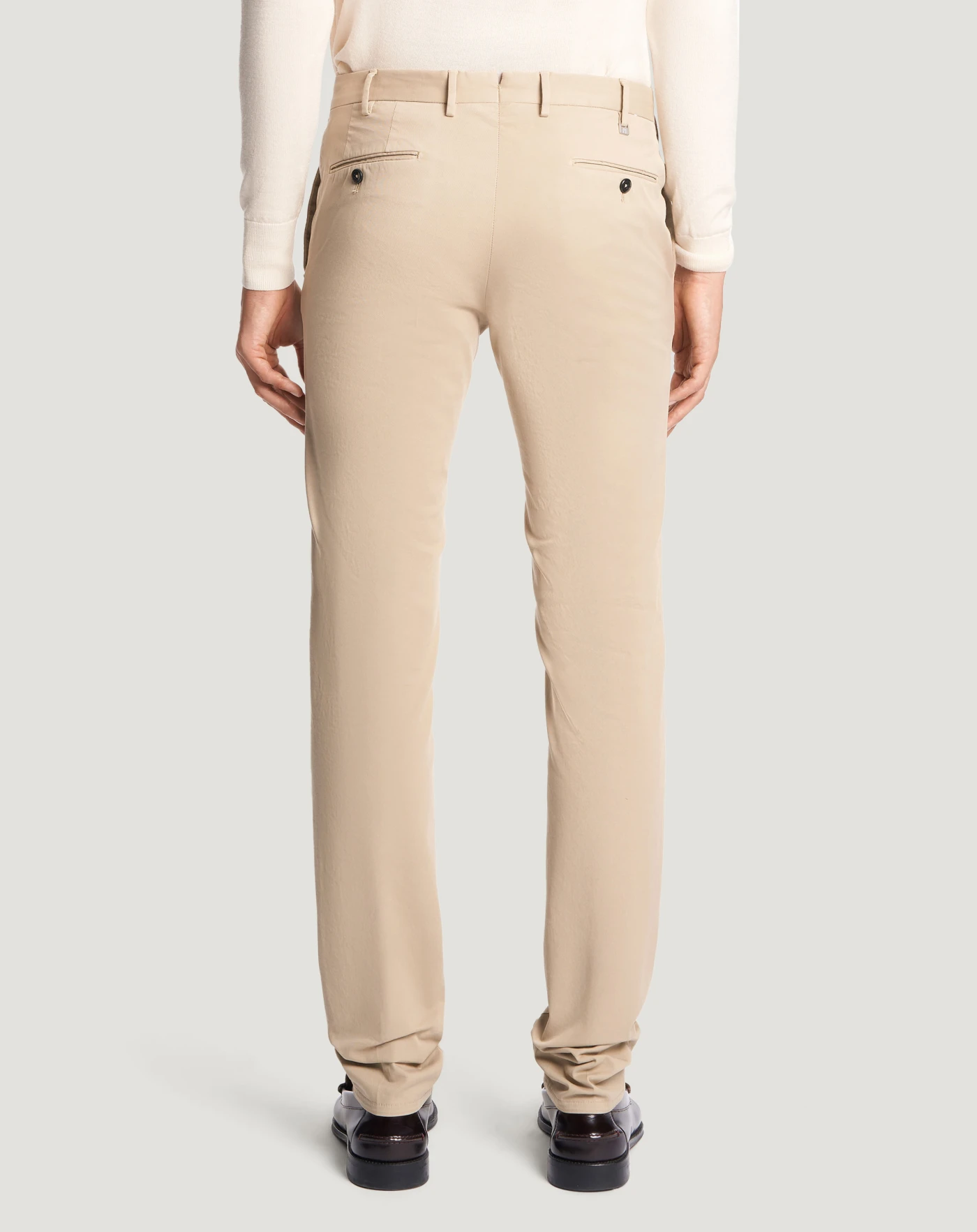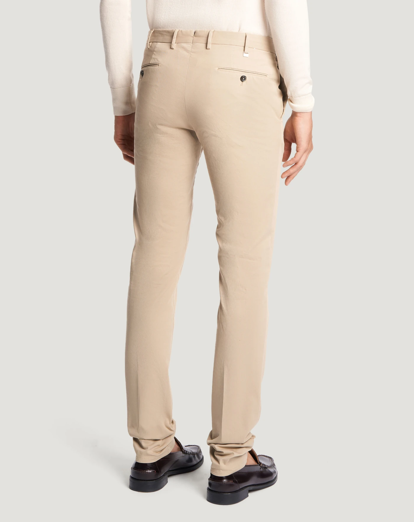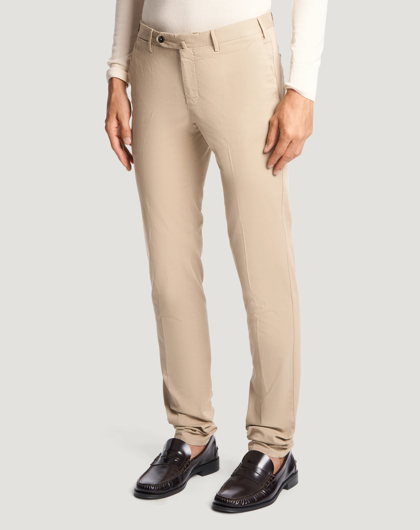 Trousers in stretch four-season batavia cotton, a very versatile fabric distinguished by a stretch weave that comfortably adapts to body movements and is perfect all year round.The garment is delivered unstitched, so that it can be finished to suit your length and style through simple tailoring. Their contemporary design in the beige variant is perfect for brightening up formal and casual looks.