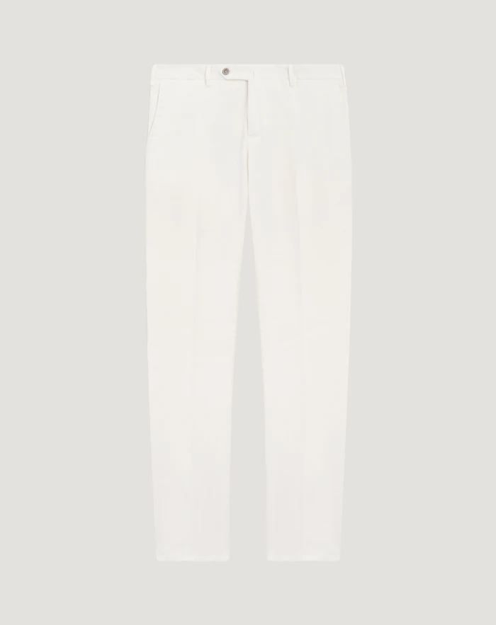 Trousers in stretch cotton winter gabardine with a compact and warm structure. Designed for the cold season, it combines comfort and durability with a soft, enveloping feel.The garment is delivered unstitched, so that it can be finished to suit your length and style through simple tailoring.In the white variant to brighten up everyday looks.