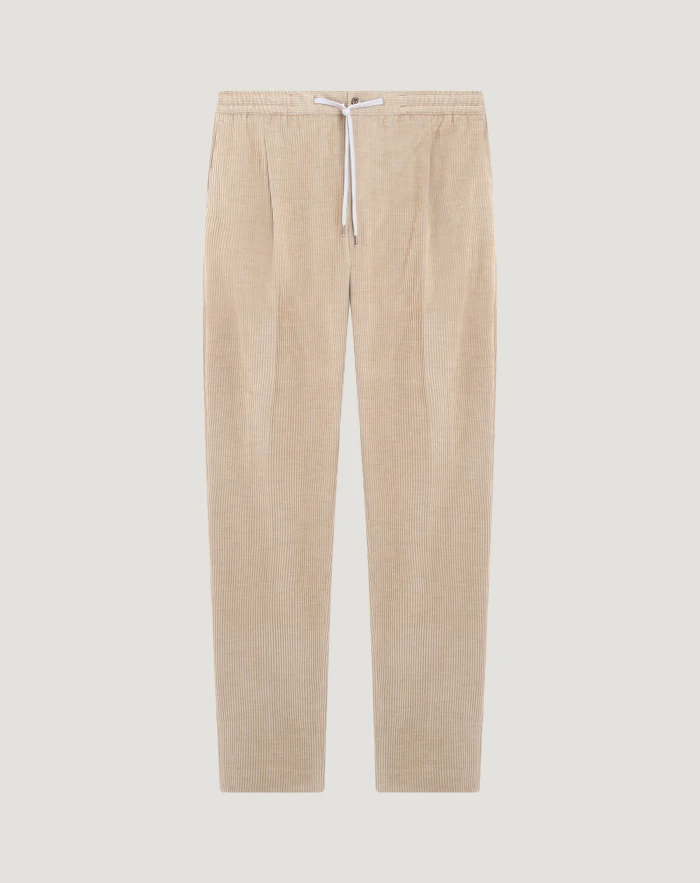 Trousers in corduroy with a melange effect, a contemporary and comfortable fabric.Featuring an elasticated drawstring waist, they add an elegant and relaxed note to your style. The beige variant is ideal for refined casual looks.