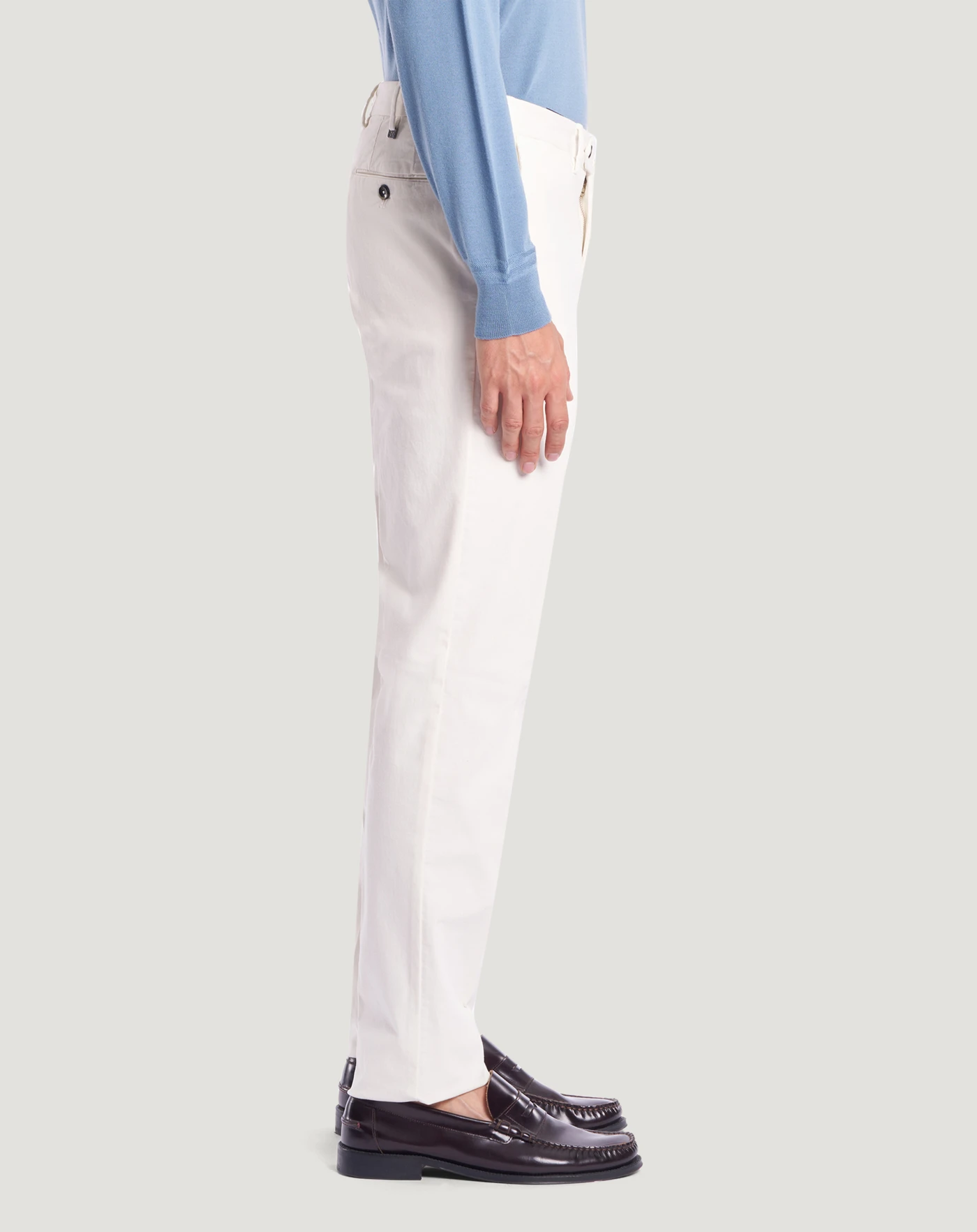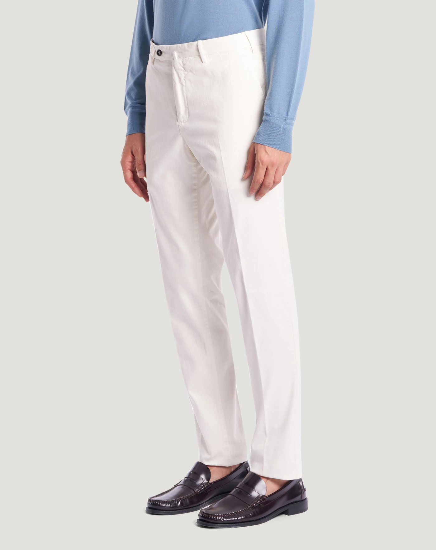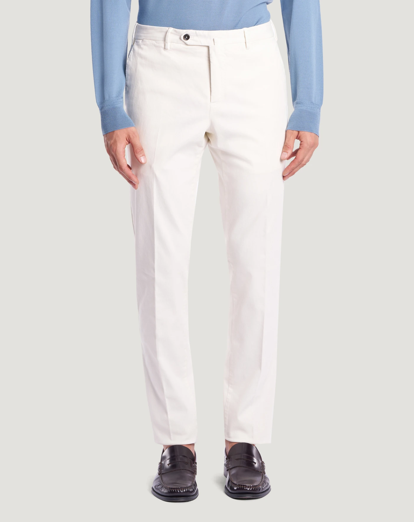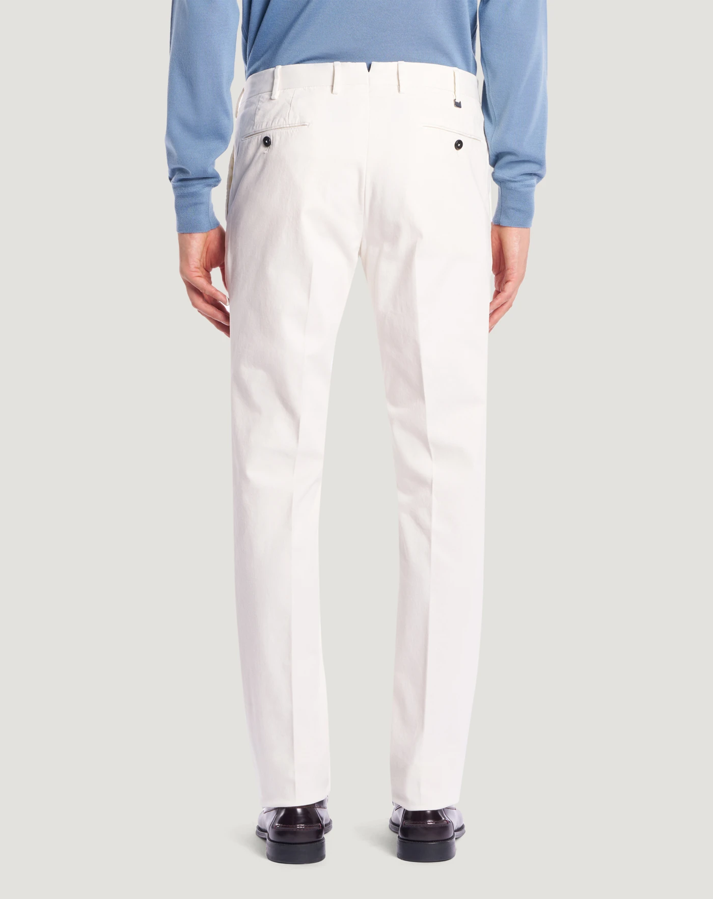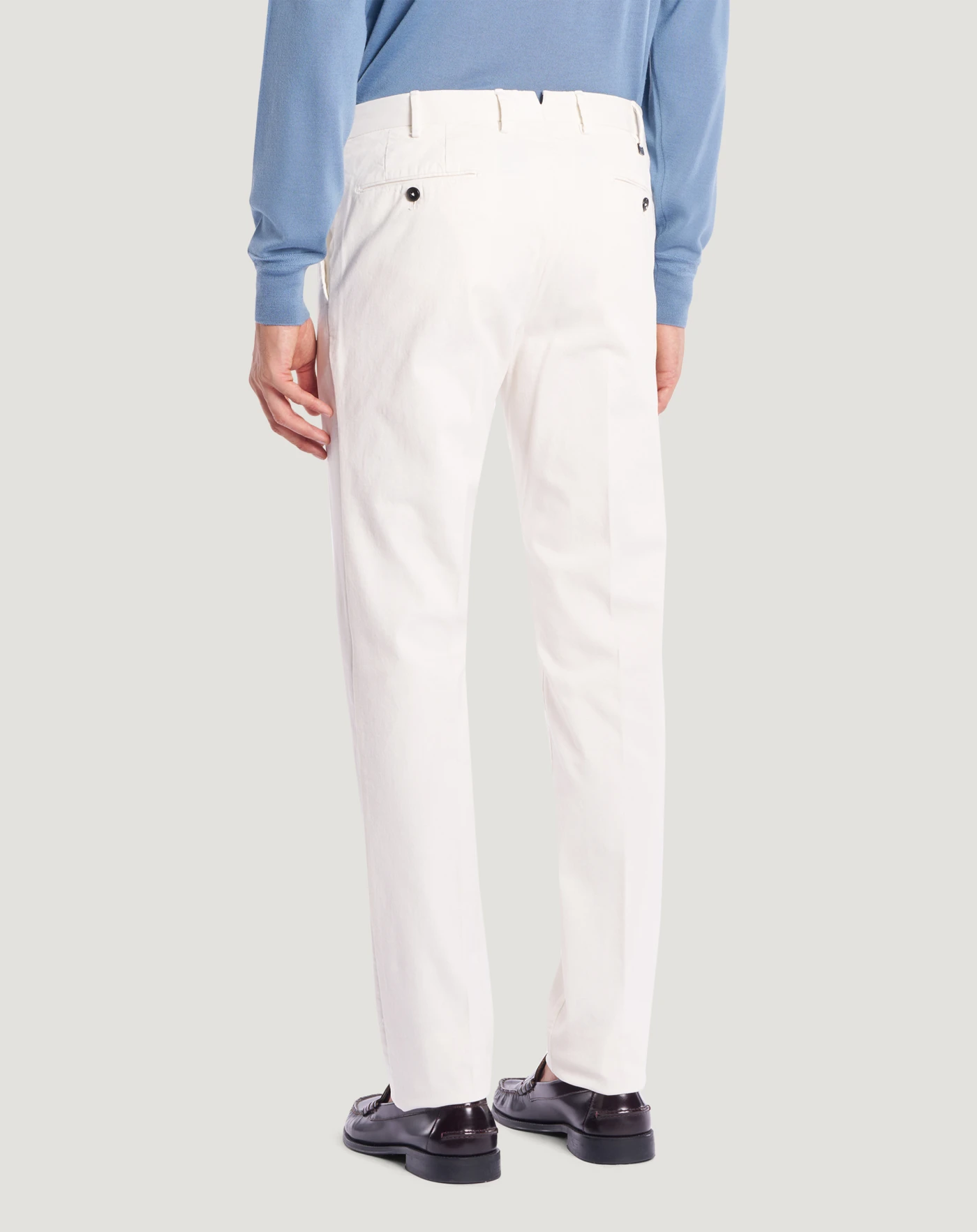 Trousers in stretch cotton winter gabardine with a compact and warm structure. Designed for the cold season, it combines comfort and durability with a soft, enveloping feel.The garment is delivered unstitched, so that it can be finished to suit your length and style through simple tailoring.In the white variant to brighten up everyday looks.