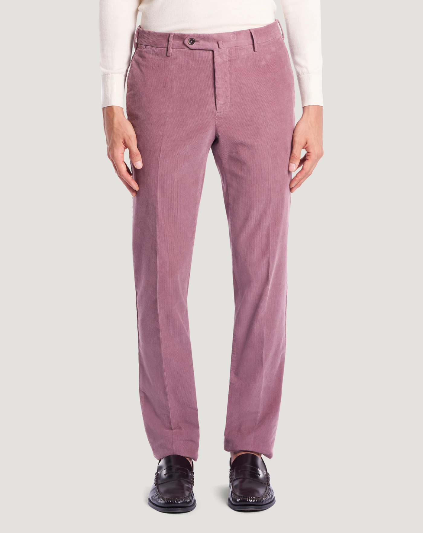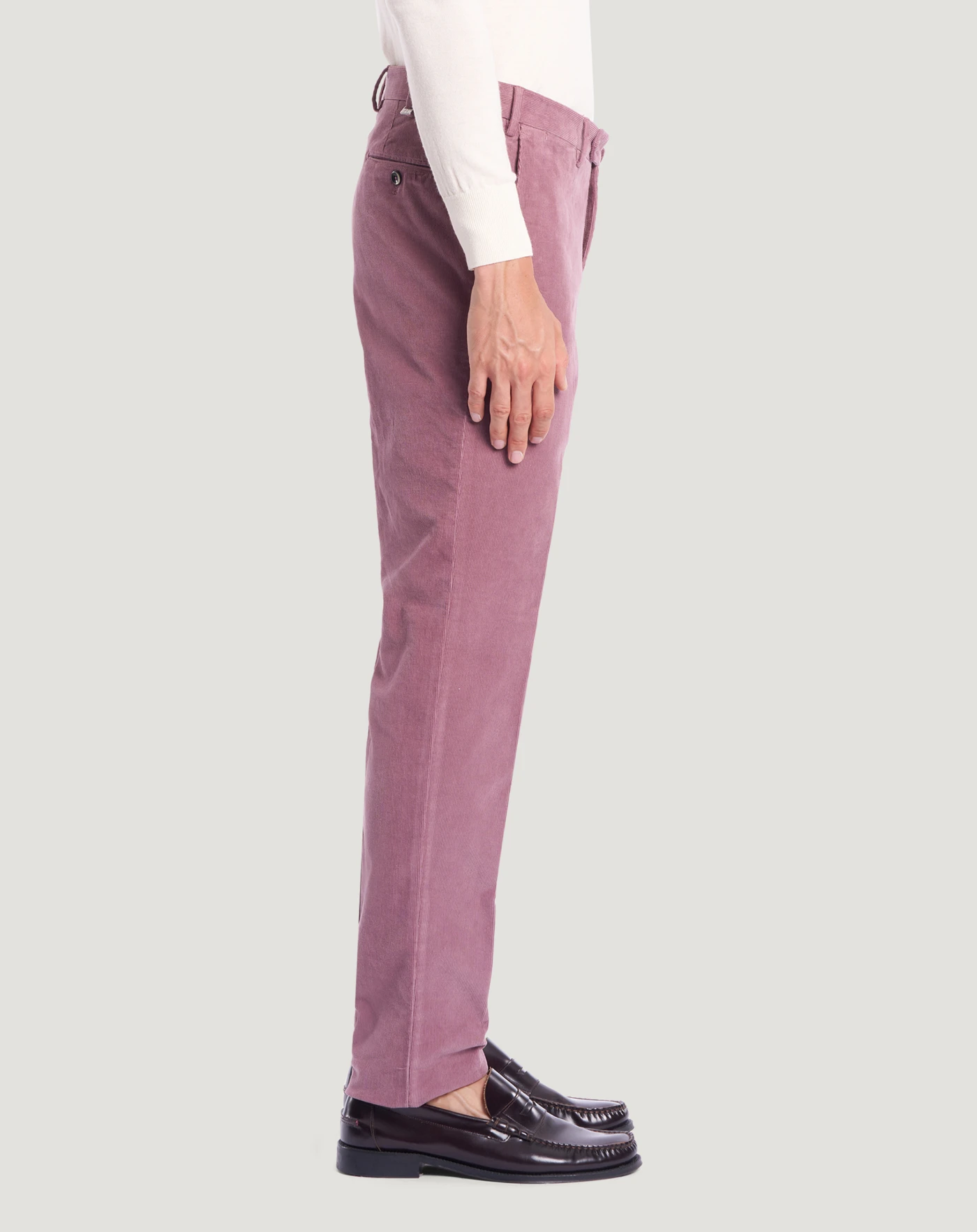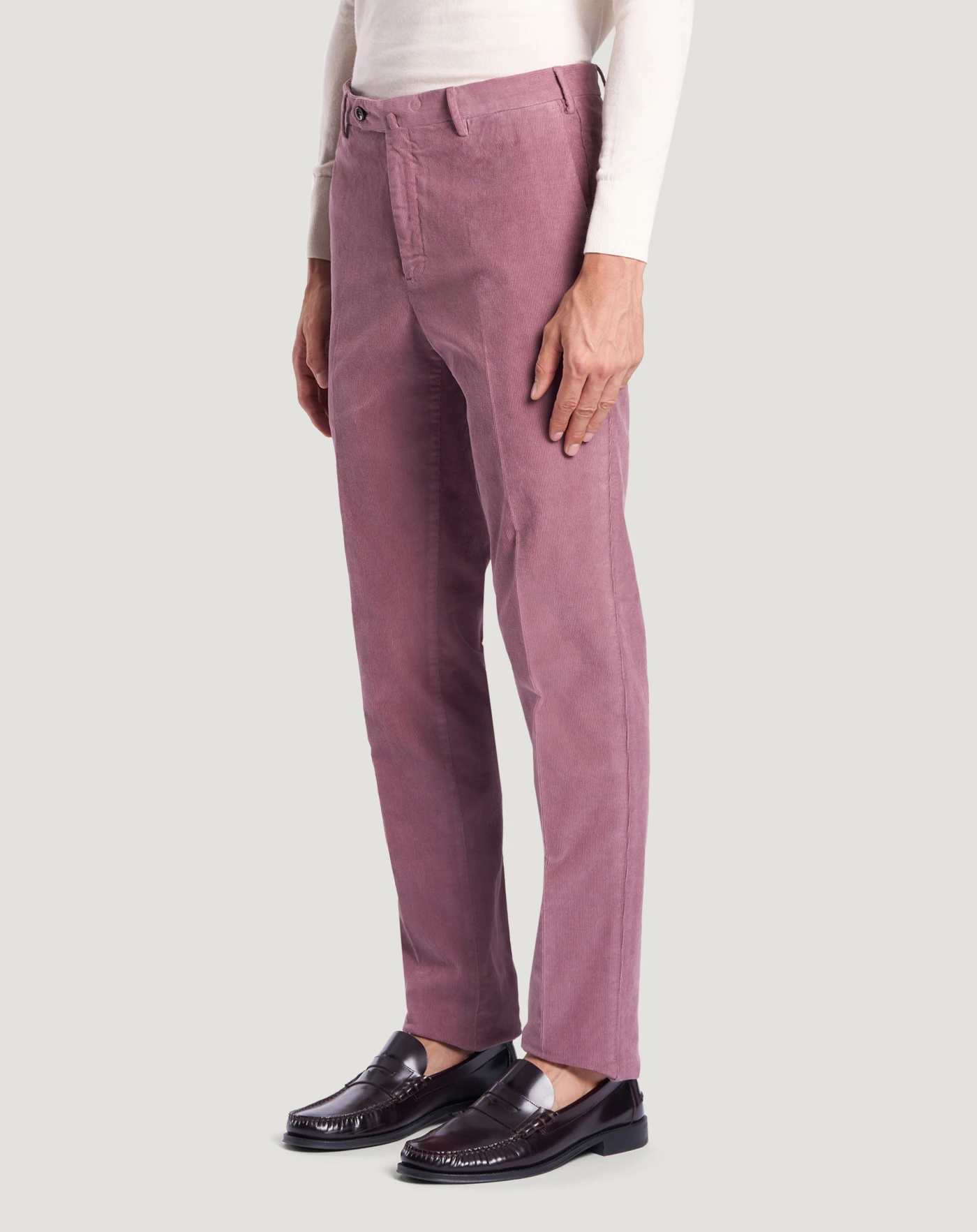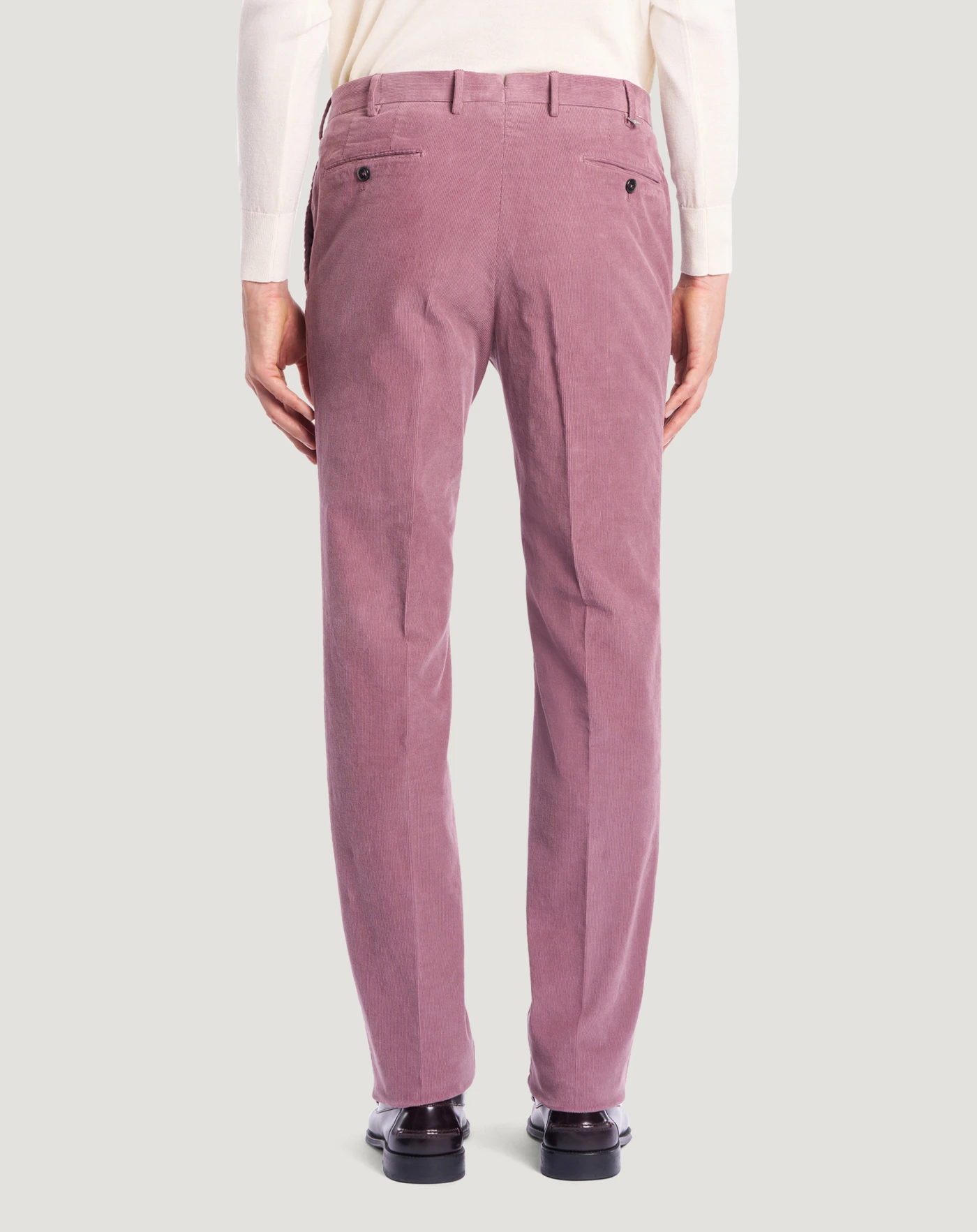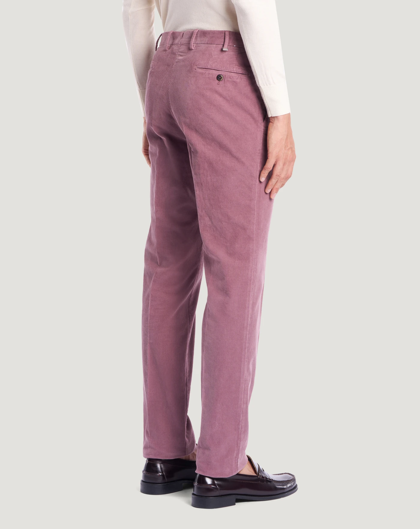 Trousers in needlecord with a stretch component for a comfortable, fluid fit. The garment is delivered unstitched, so that it can be finished to suit your length and style through simple tailoring.Contemporary and versatile, with a smooth front and side pockets, choose the pink variant for unique chromatic dynamism.